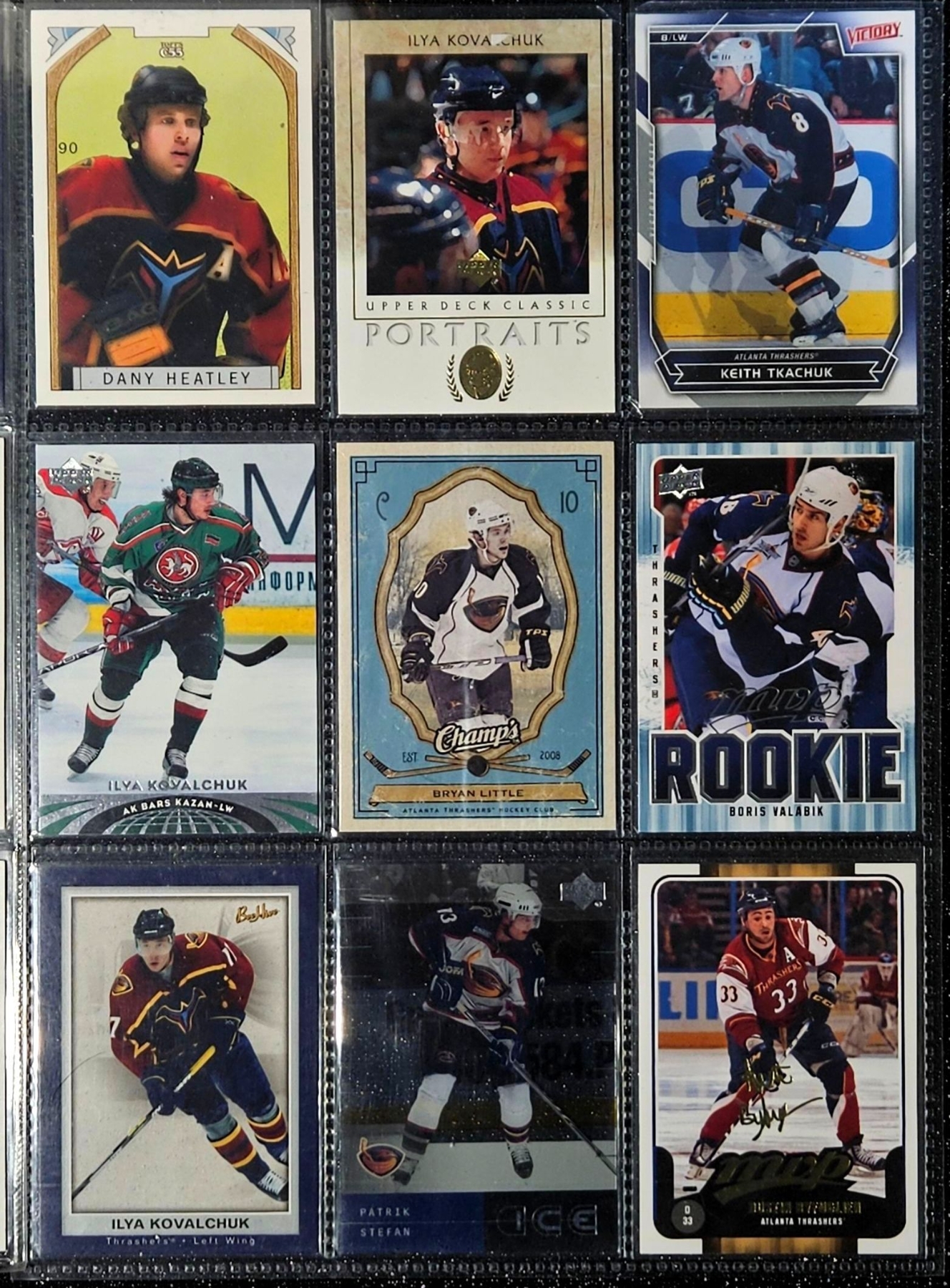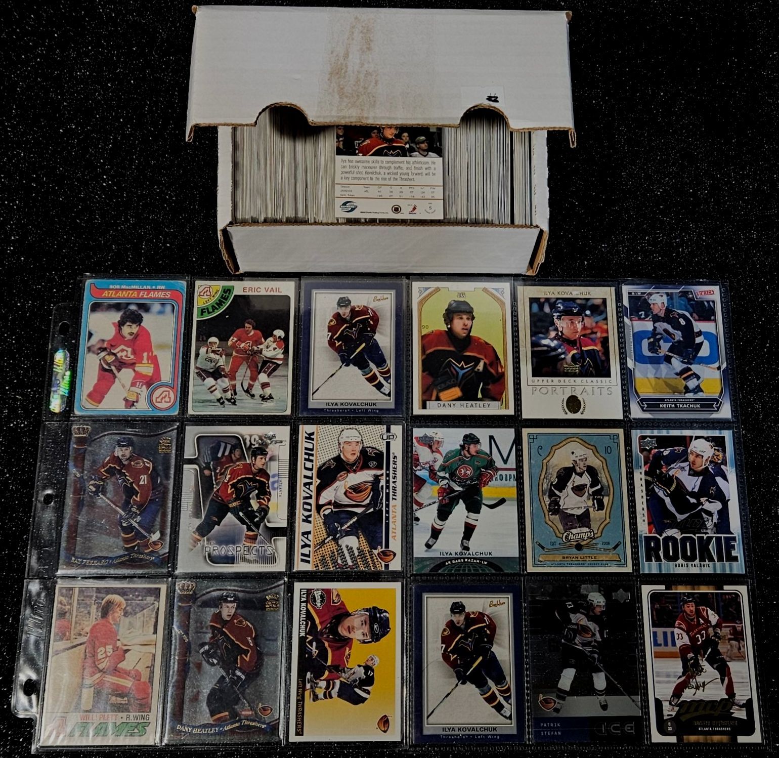 Lot includes one box of various rarity Atlanta Flames & Atlanta Thrasher hockey cards from 1972 to 2026, and includes two plastic card holder sleeves of various rarity Atlanta Flames trading hockey cards.