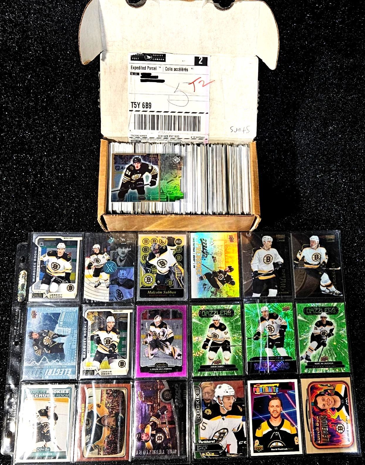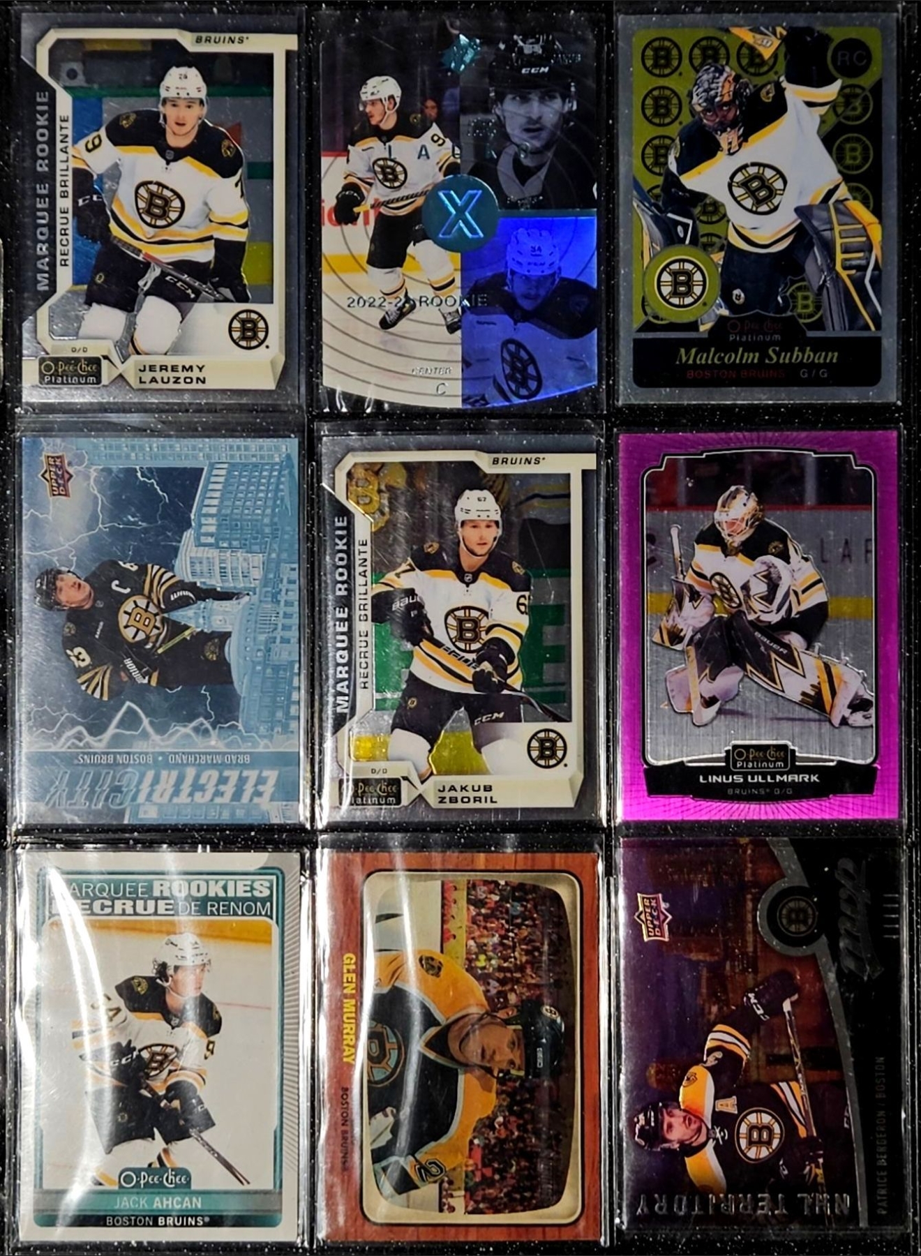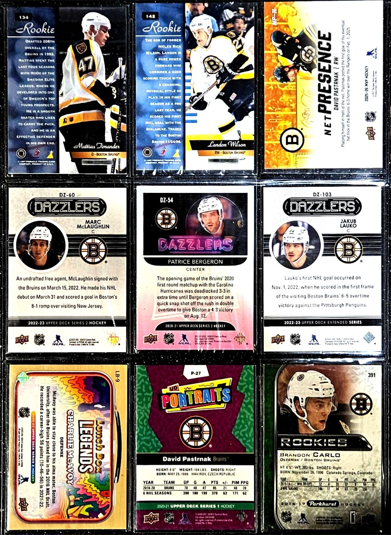 Lot includes one box of various rarity Boston Bruins trading hockey cards from 1988 and above, and two plastic card holder sleeves of various rarity Boston Bruins trading hockey cards,