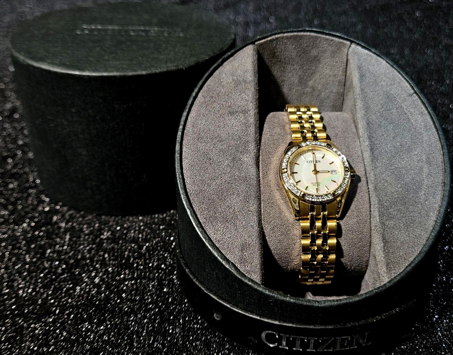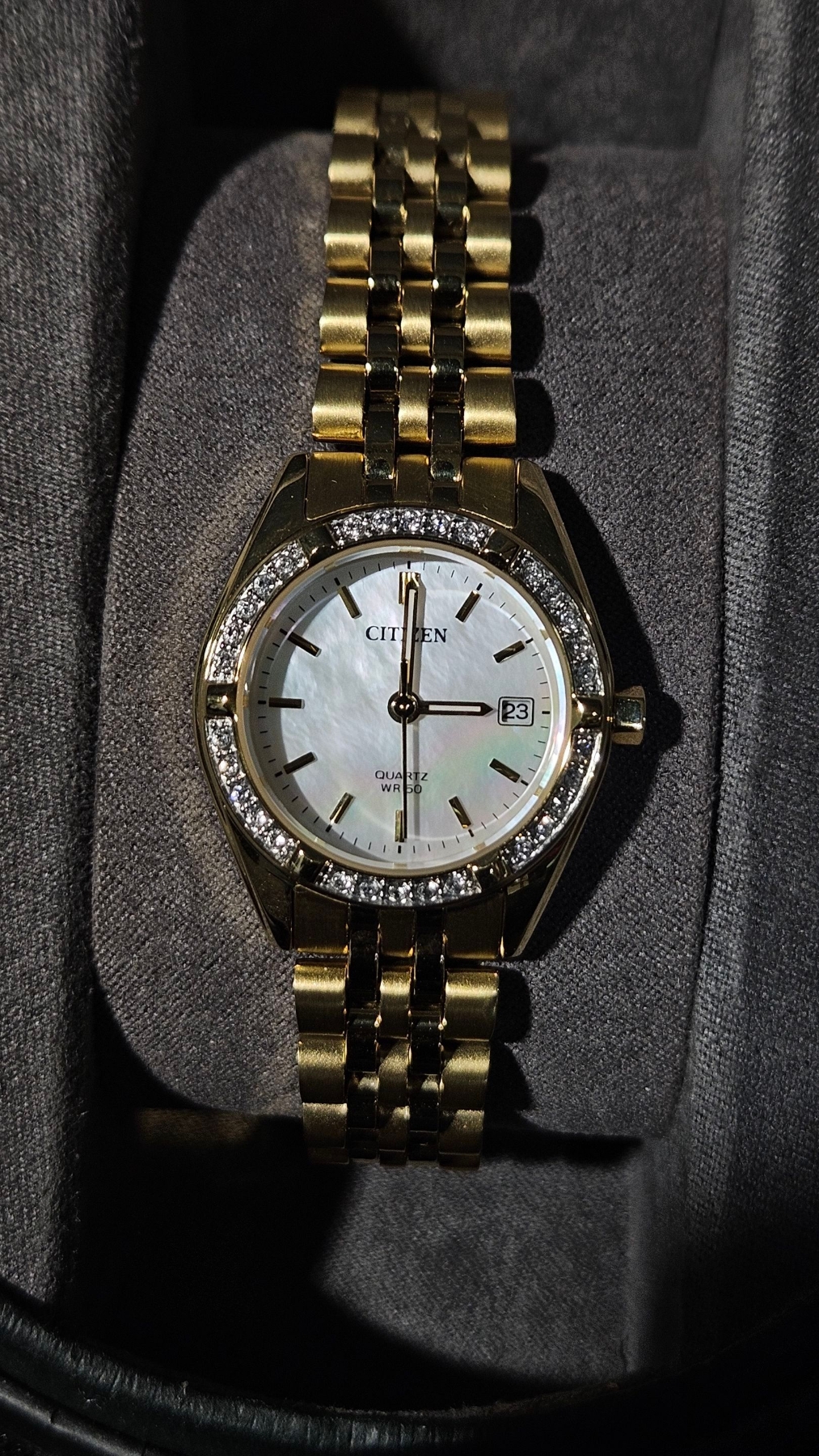 This dazzling accessory features a gold-toned bracelet, a mother-of-pearl dial, and a crystal-set bezel. Includes original factory packaging. Incredible gift or collector's item.