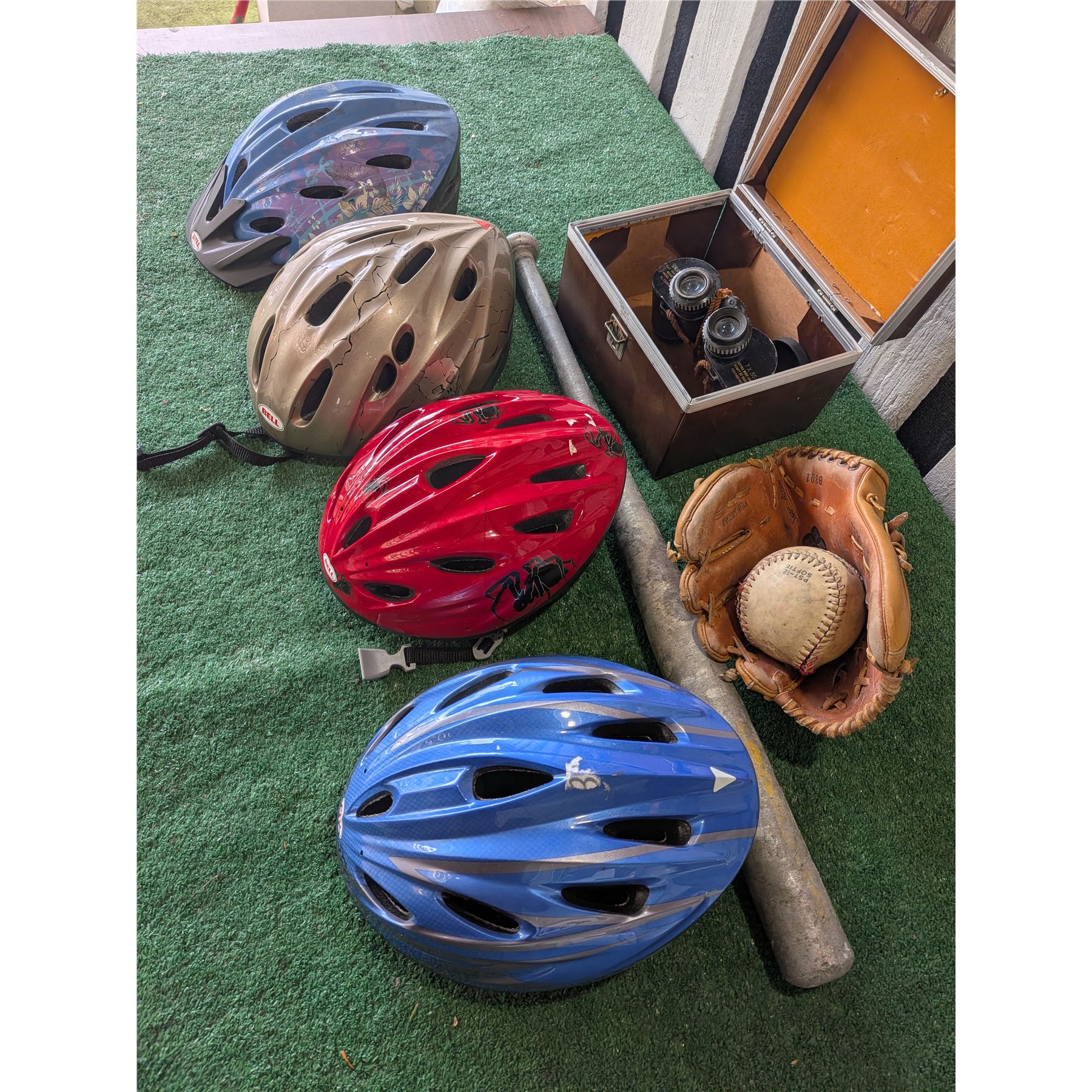 Lot 190 BELL Bike Helmets, Ball, Bat, Glove, Tasco Binoculars