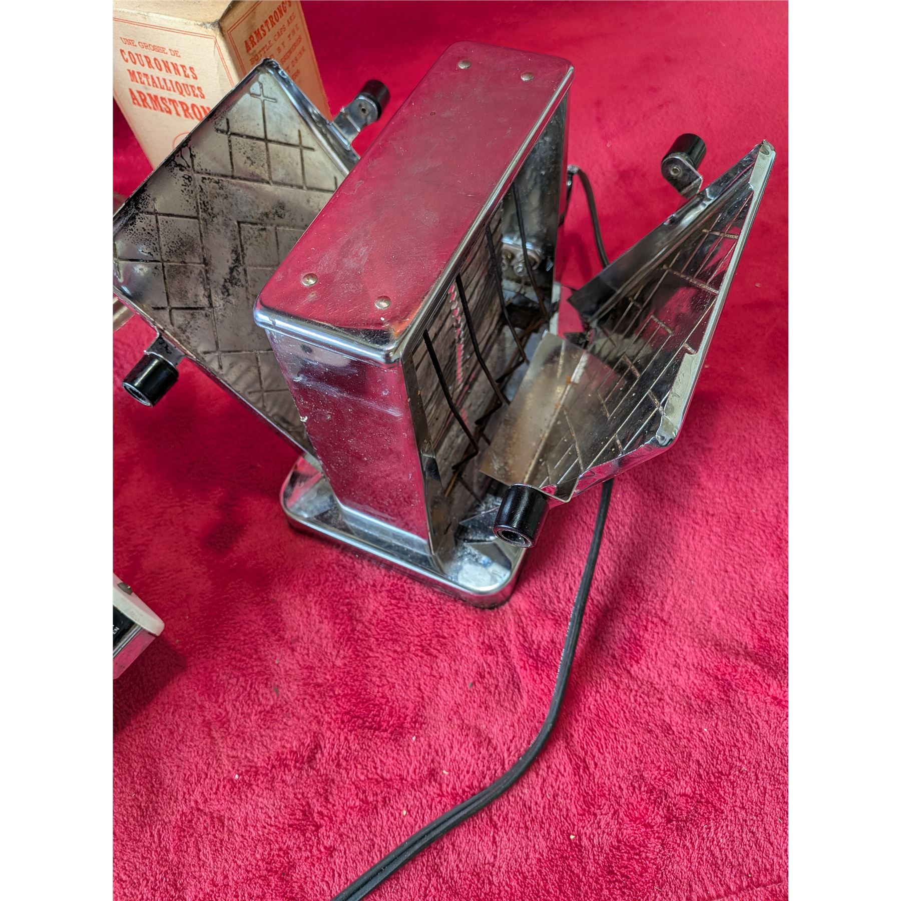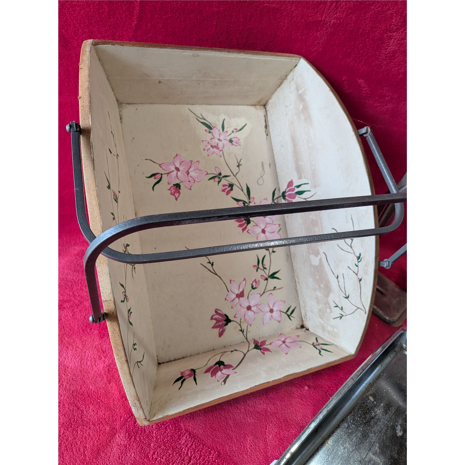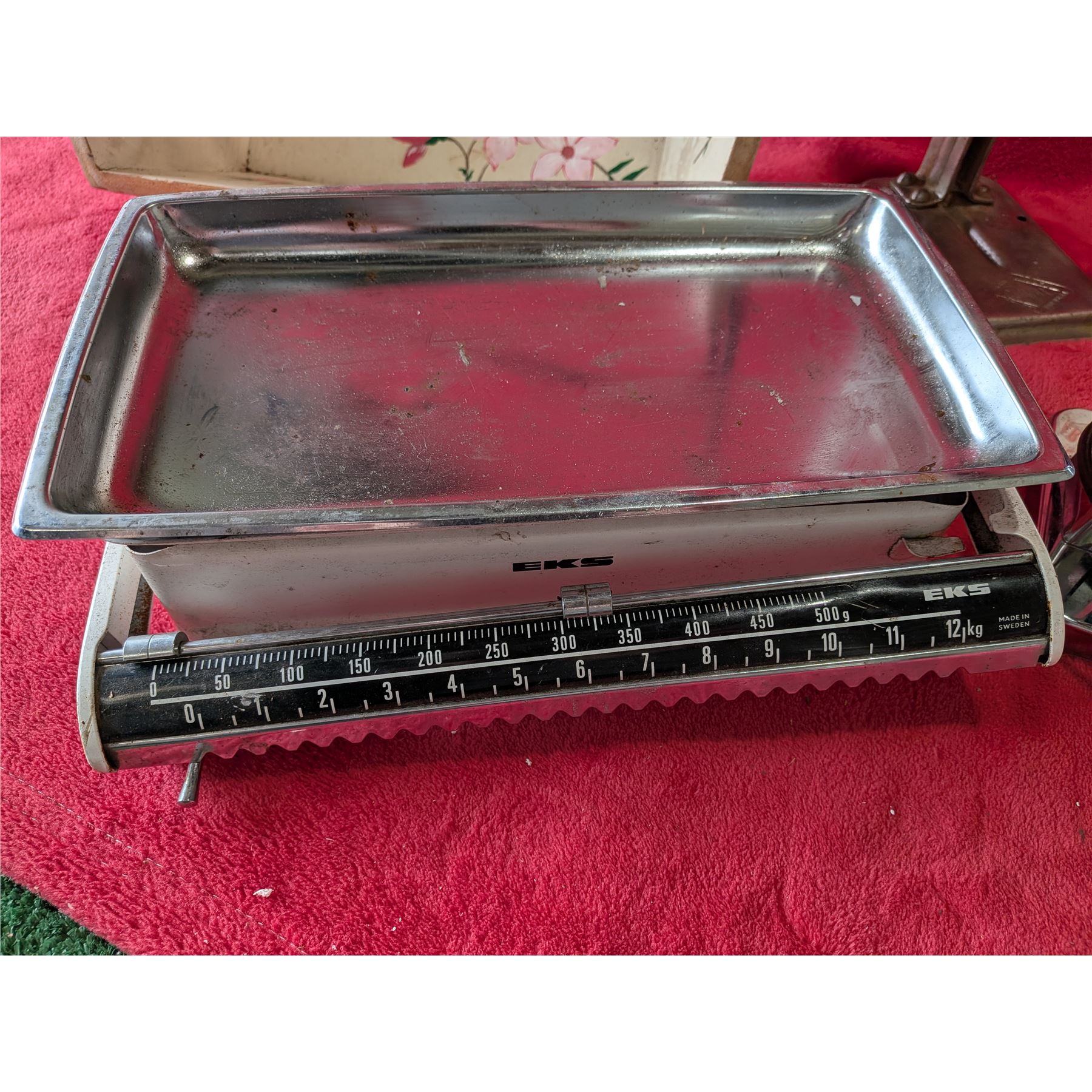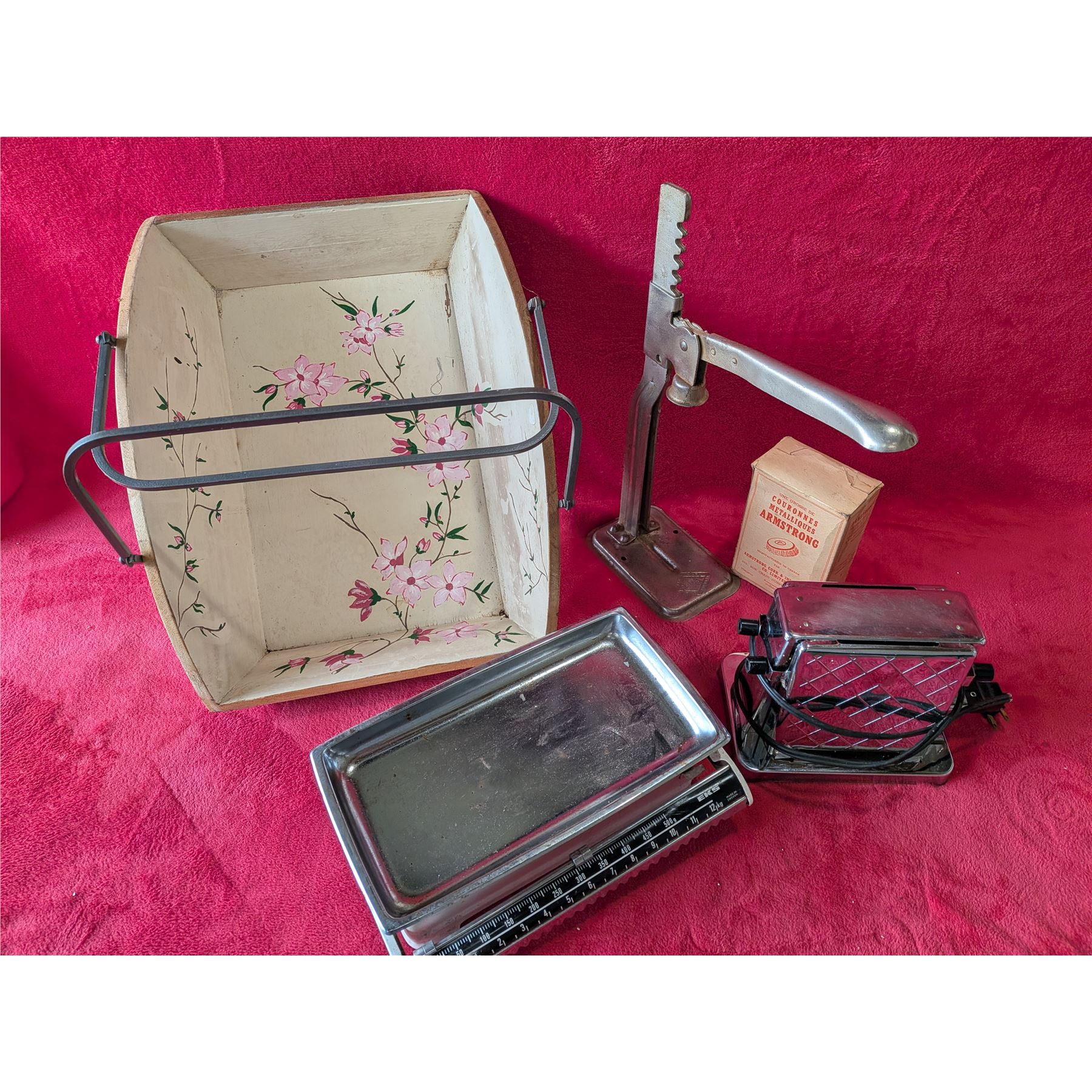 4 VINTAGE items EKS Balance Scale from Sweden, Toaster Made in Canada, CLIMAX Bottle Capper+Armstrong Caps & Garden Basket with Flower motif.