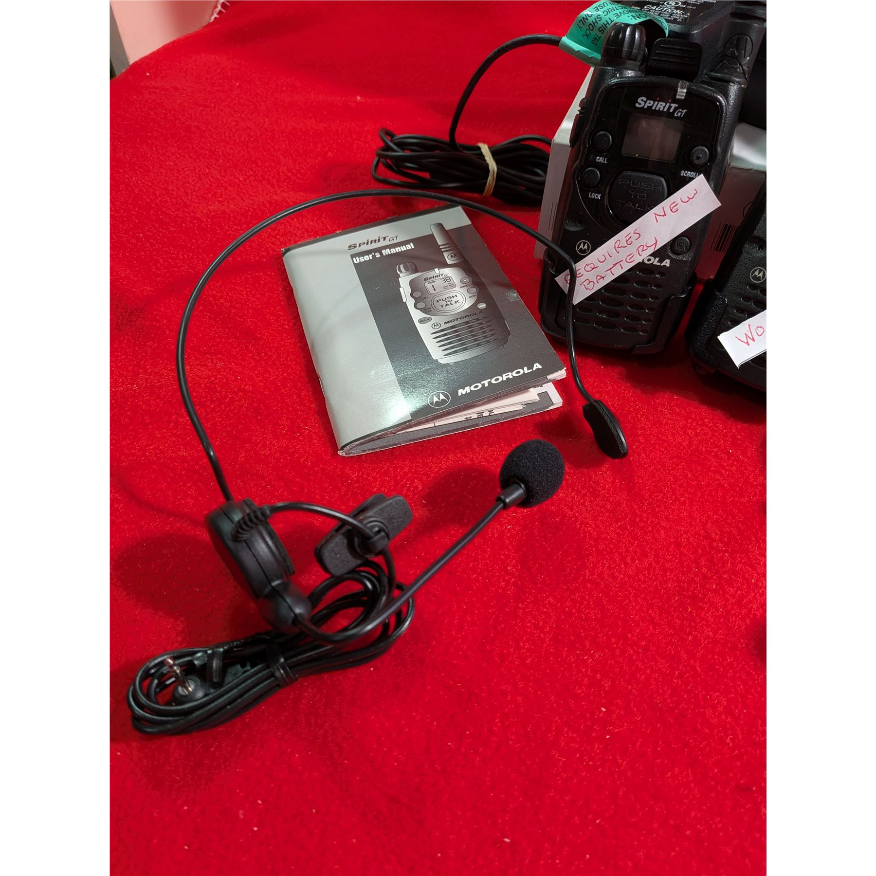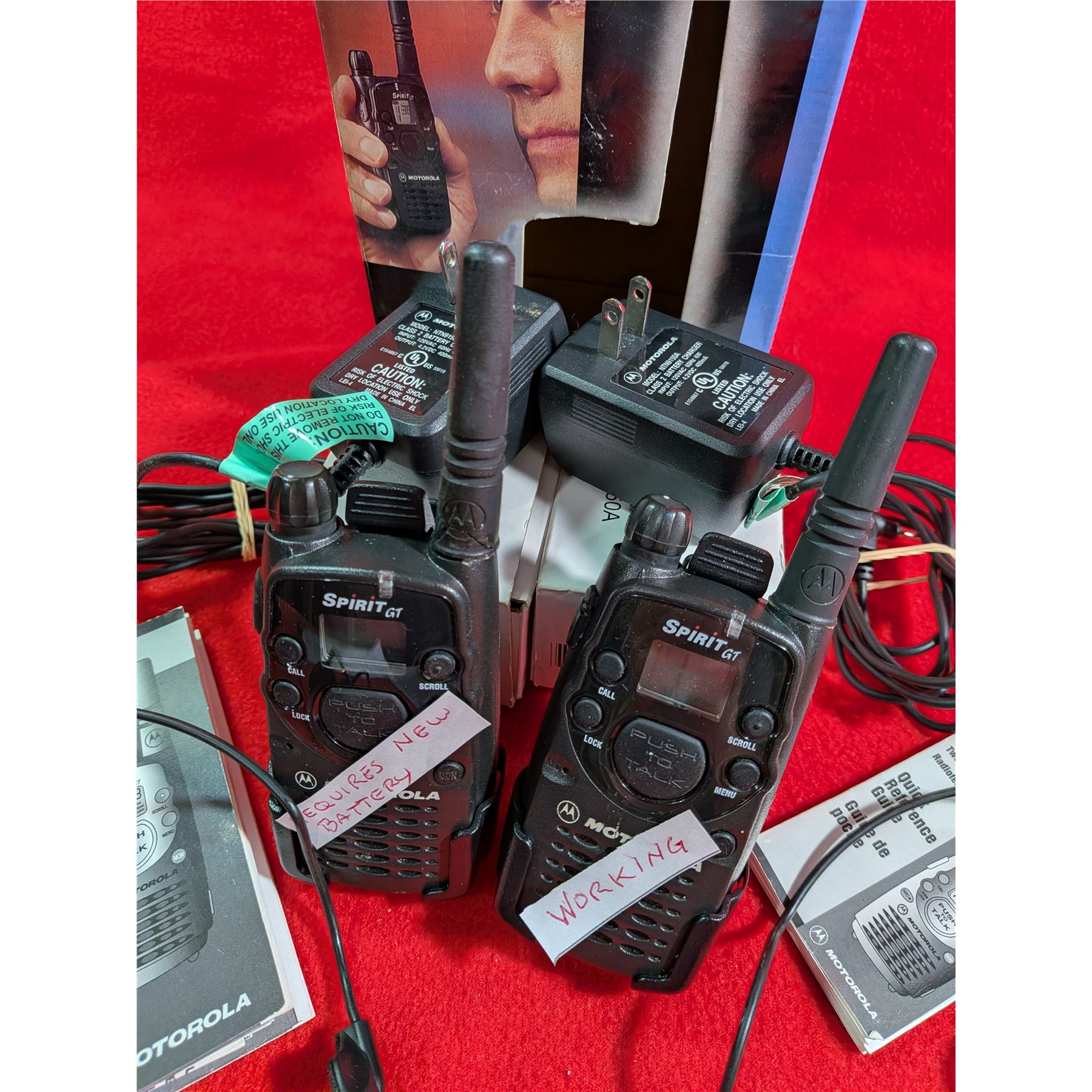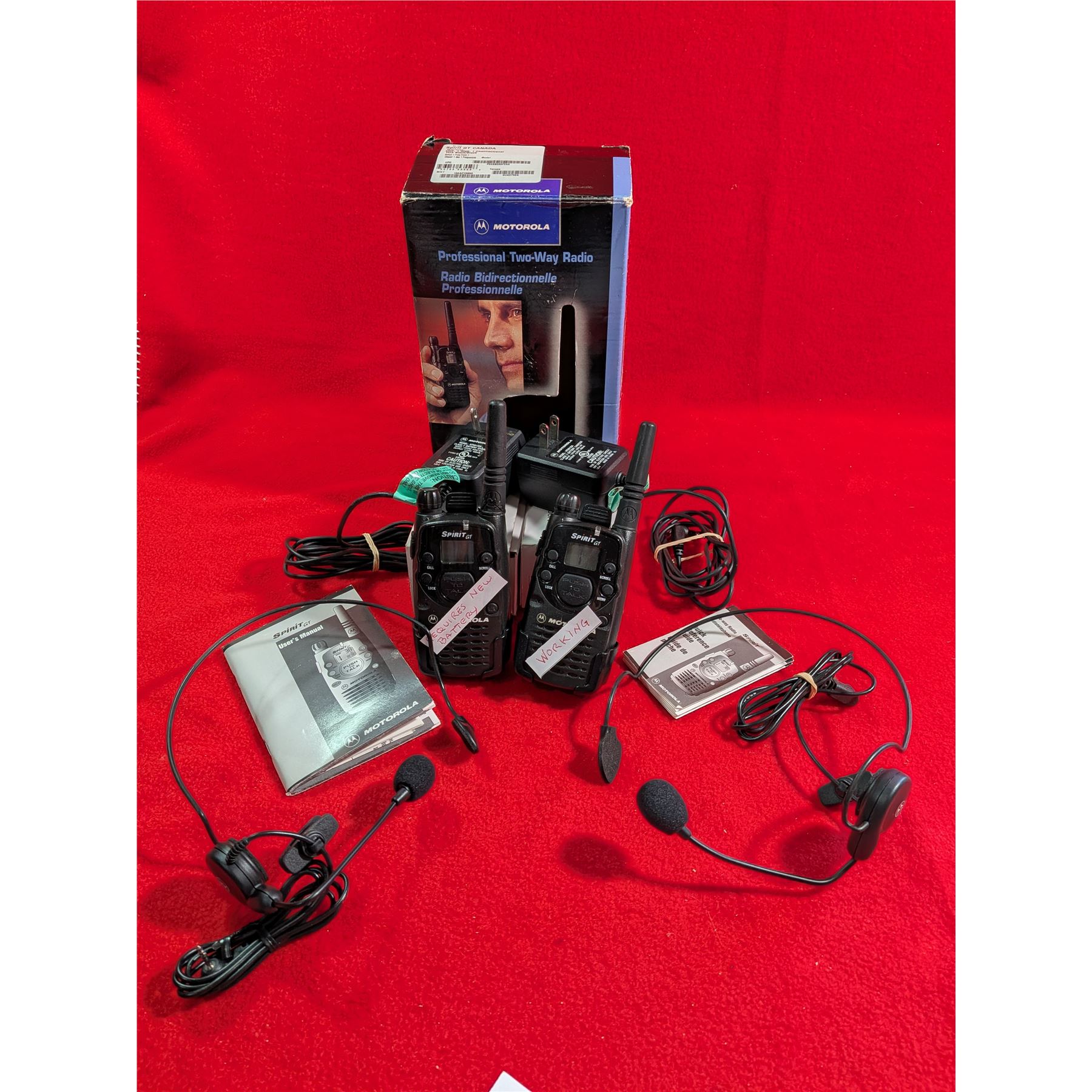 MOTOROLA SPIRIT GT TWO-WAY RADIO. One radio marked requires new battery. The other one works. Includes 2 belt clips, 2 charger(working) & 2 hands-free sets