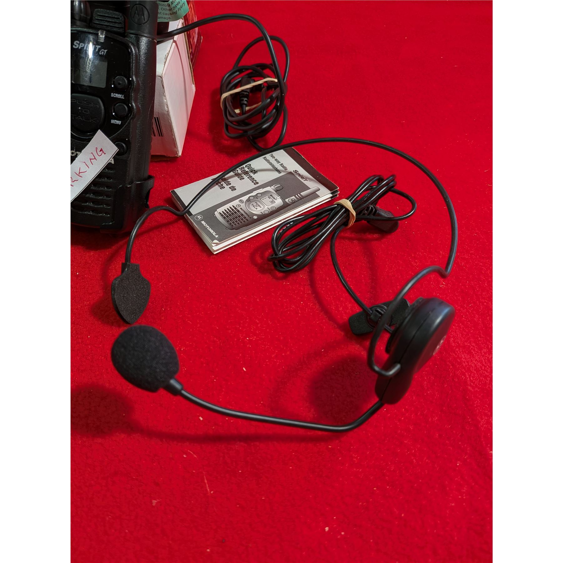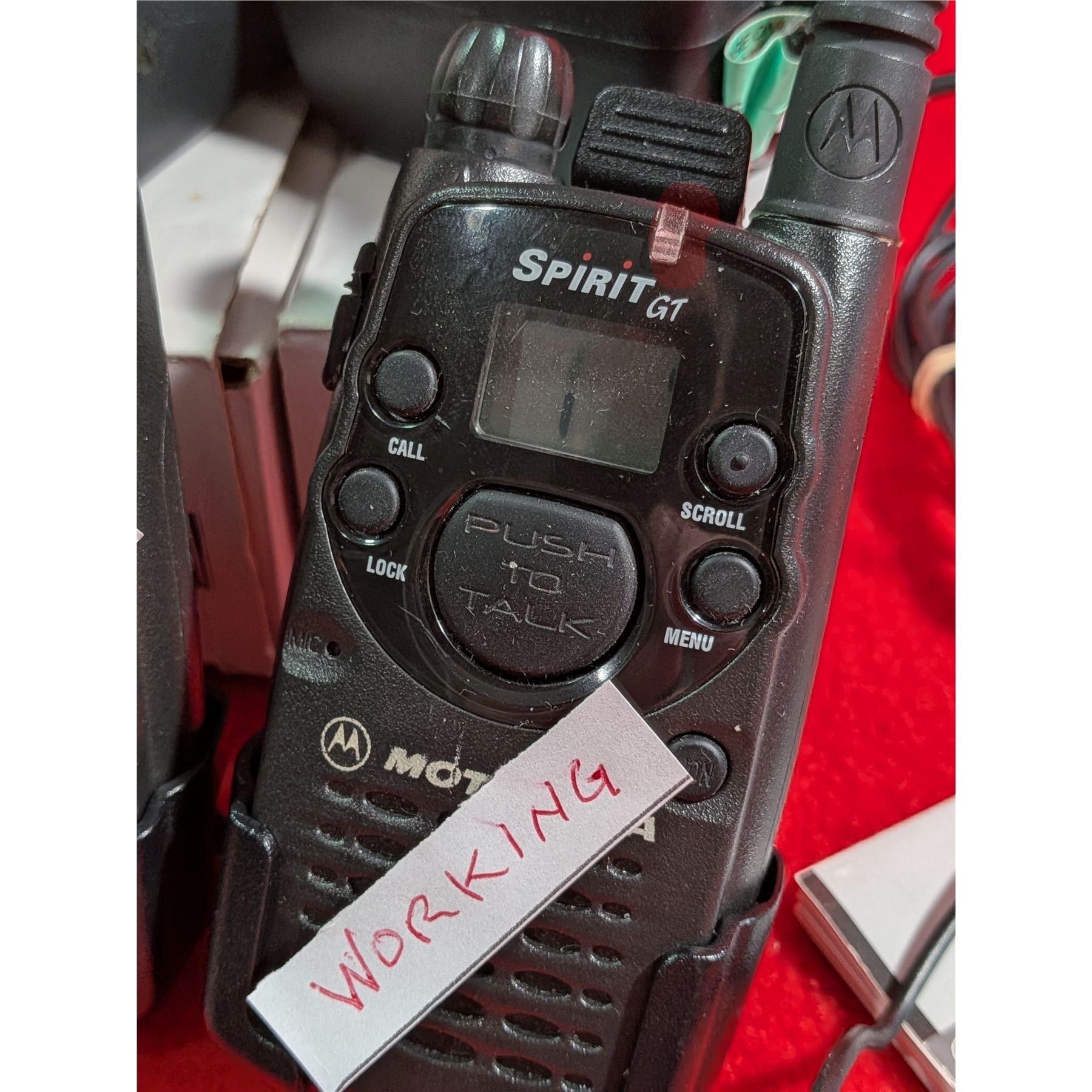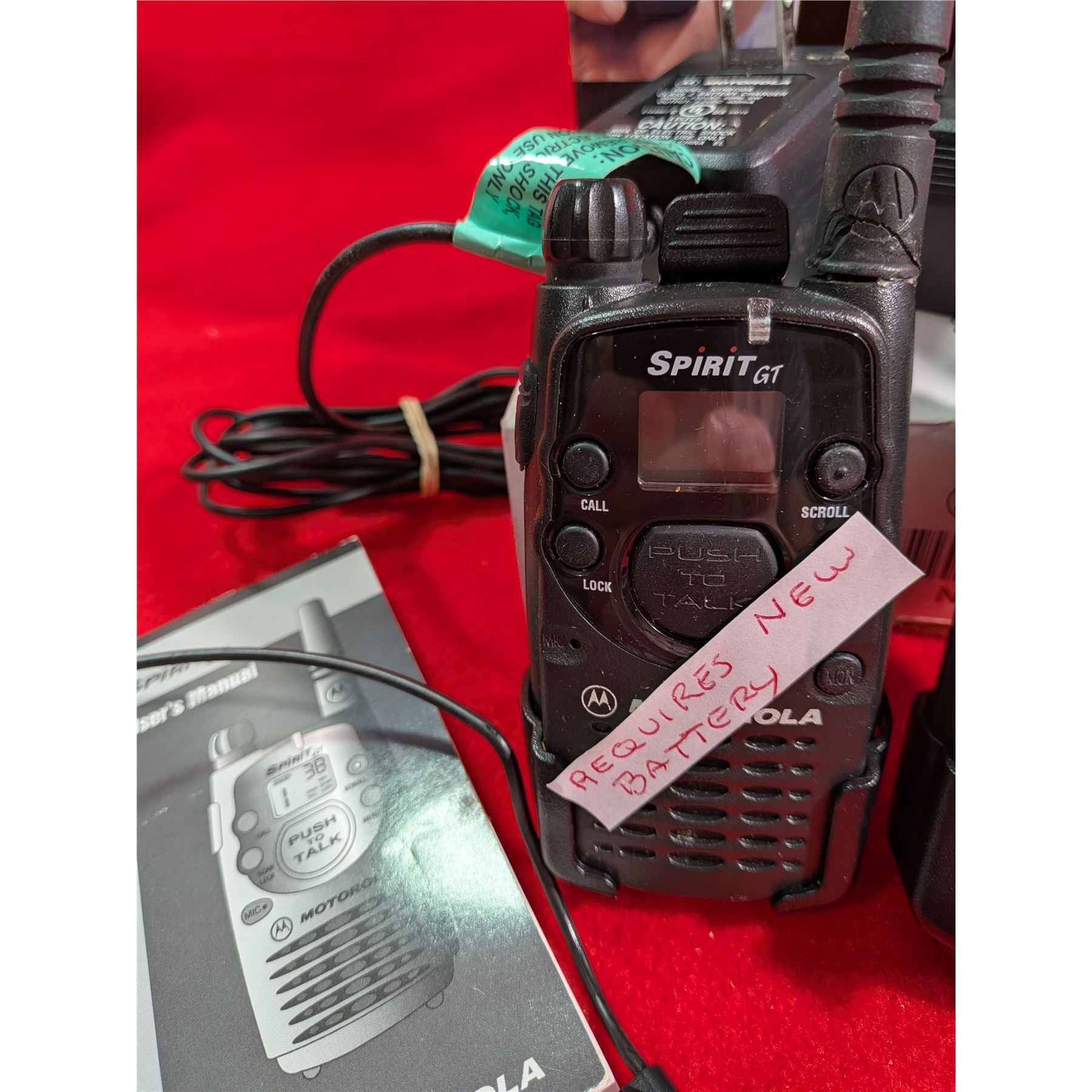 MOTOROLA SPIRIT GT TWO-WAY RADIO. One radio marked requires new battery. The other one works. Includes 2 belt clips, 2 charger(working) & 2 hands-free sets
