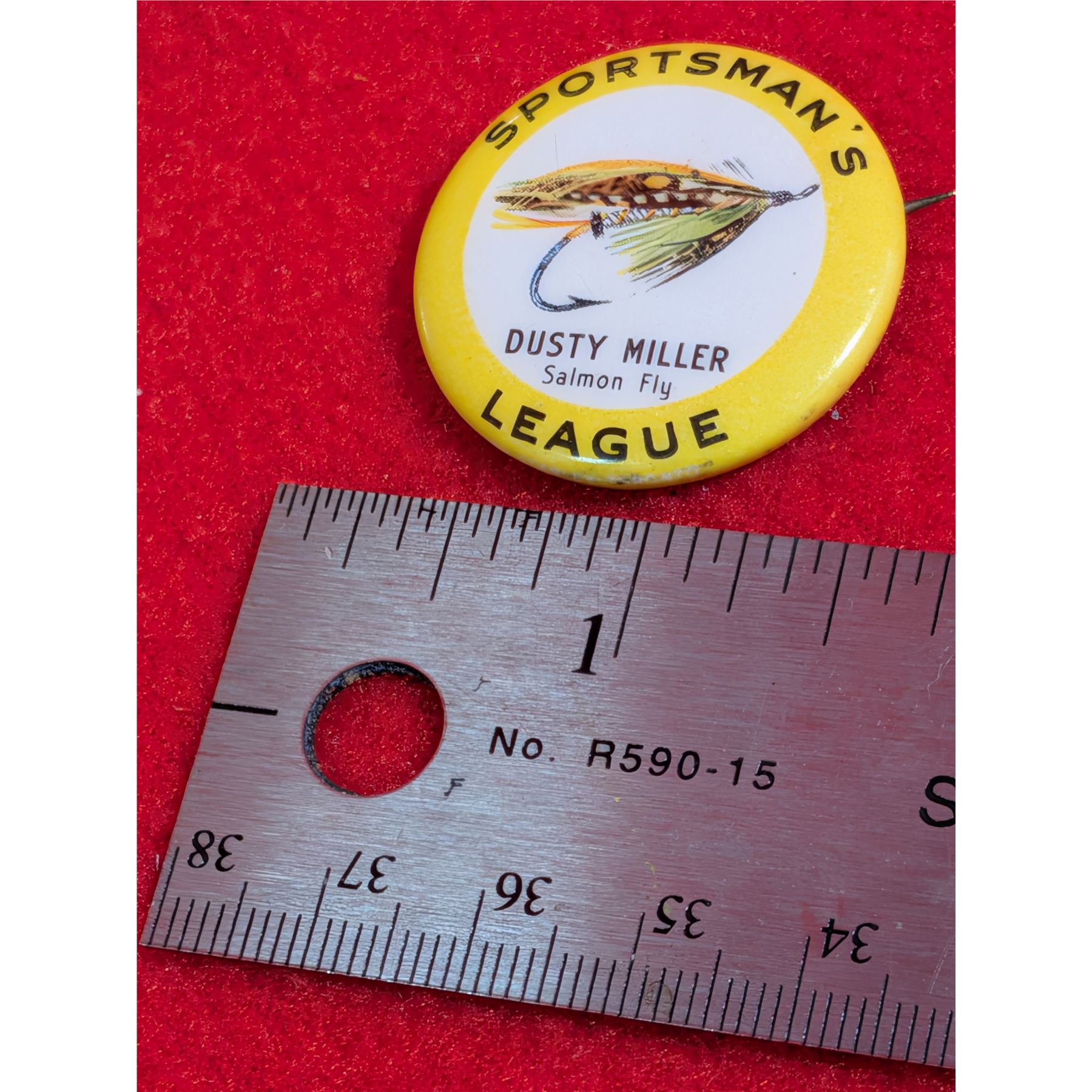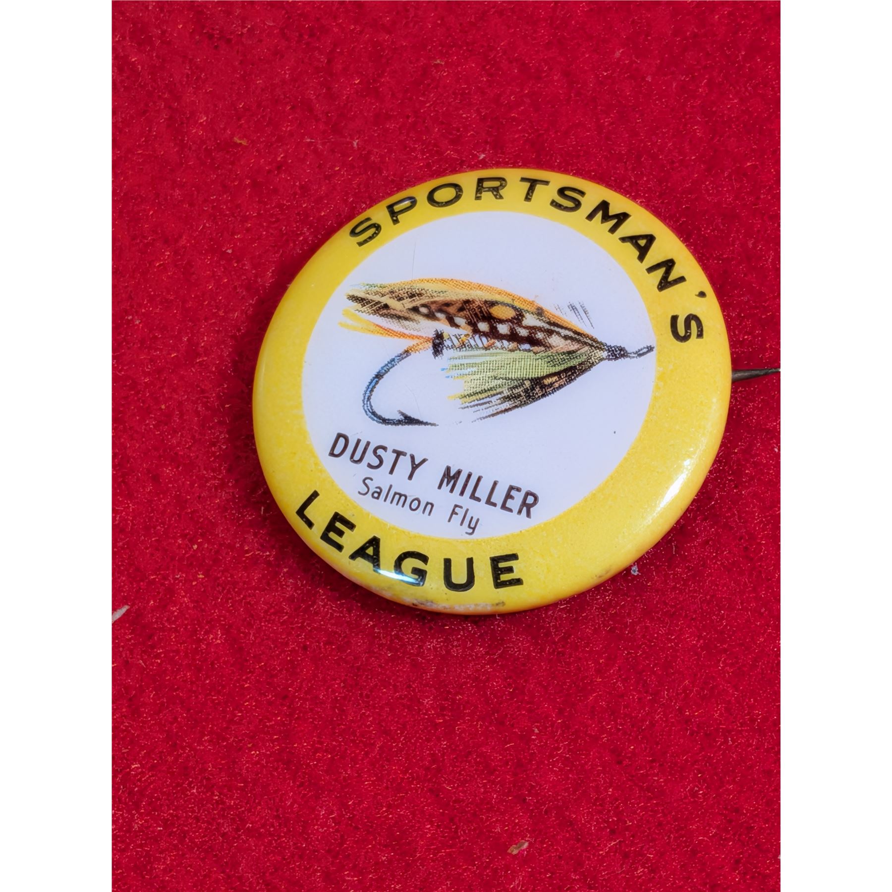 Vintage SUN SALMON DERBY " Caught a salmon" & SPORTSMAN'S LEAGUE "Dusty Miller Salmon Fly" Push pins.