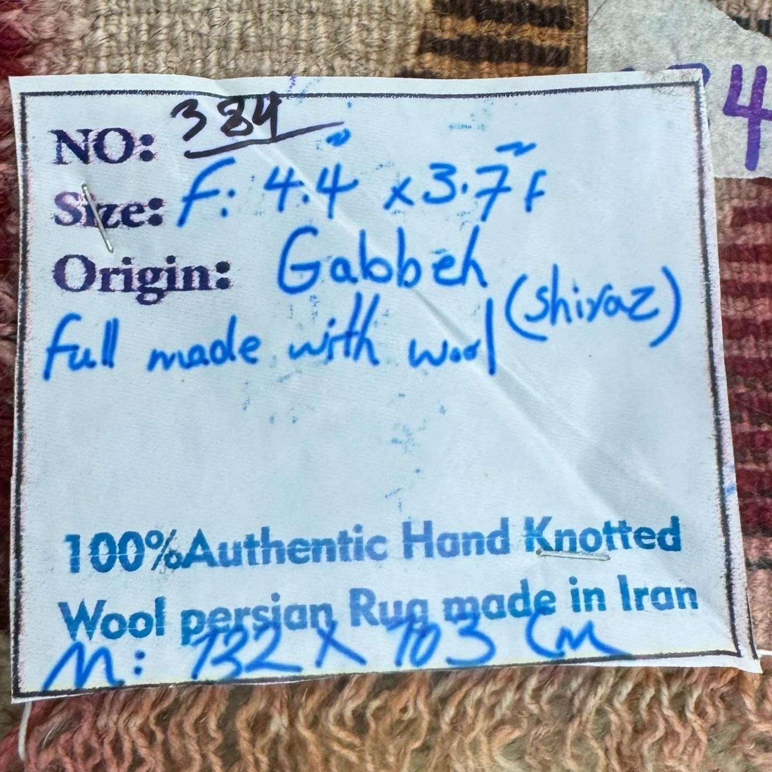 Lot 25A 100% Hand Knotted Made in Iran 4'4"c3'7" Gabbeh Region Shiraz Wool Rug (384)