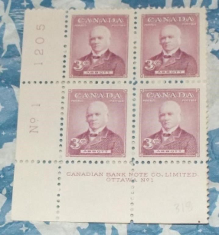 Lot 5 Block of 4 Sir John Abbott 3 Cent Stamps - Canada #318, 1952