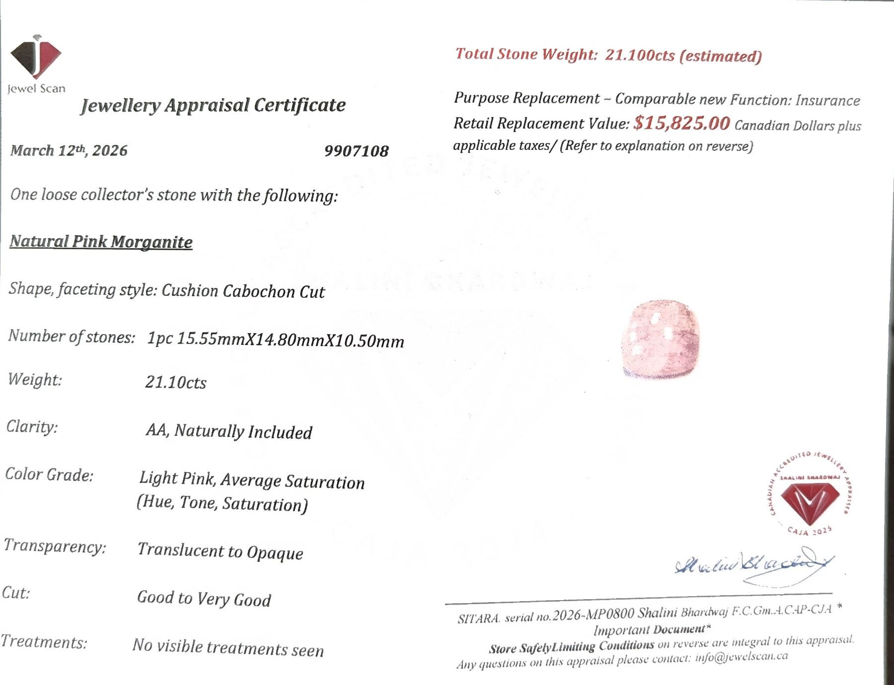 Lot 110a 21.1 ct Certified Morganite gemstone ($15,825 Appraisal)