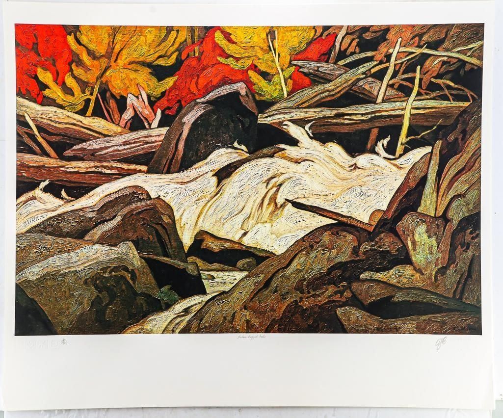 A. J. Casson (1898Ð1992) was a Canadian painter and designer, best known as the youngest member of the Group of Seven. He became famous for calm, carefully structured landscapes of OntarioÑsmall towns, lakes, farms, and forestsÑpainted with simplified shapes, clear outlines, and a strong sense of design. CassonÕs work often feels quiet and orderly, turning everyday scenery into bold, balanced compositions that are still easy to recognize today. One of his Art work is Below Ragged Falls Ð ART1070
