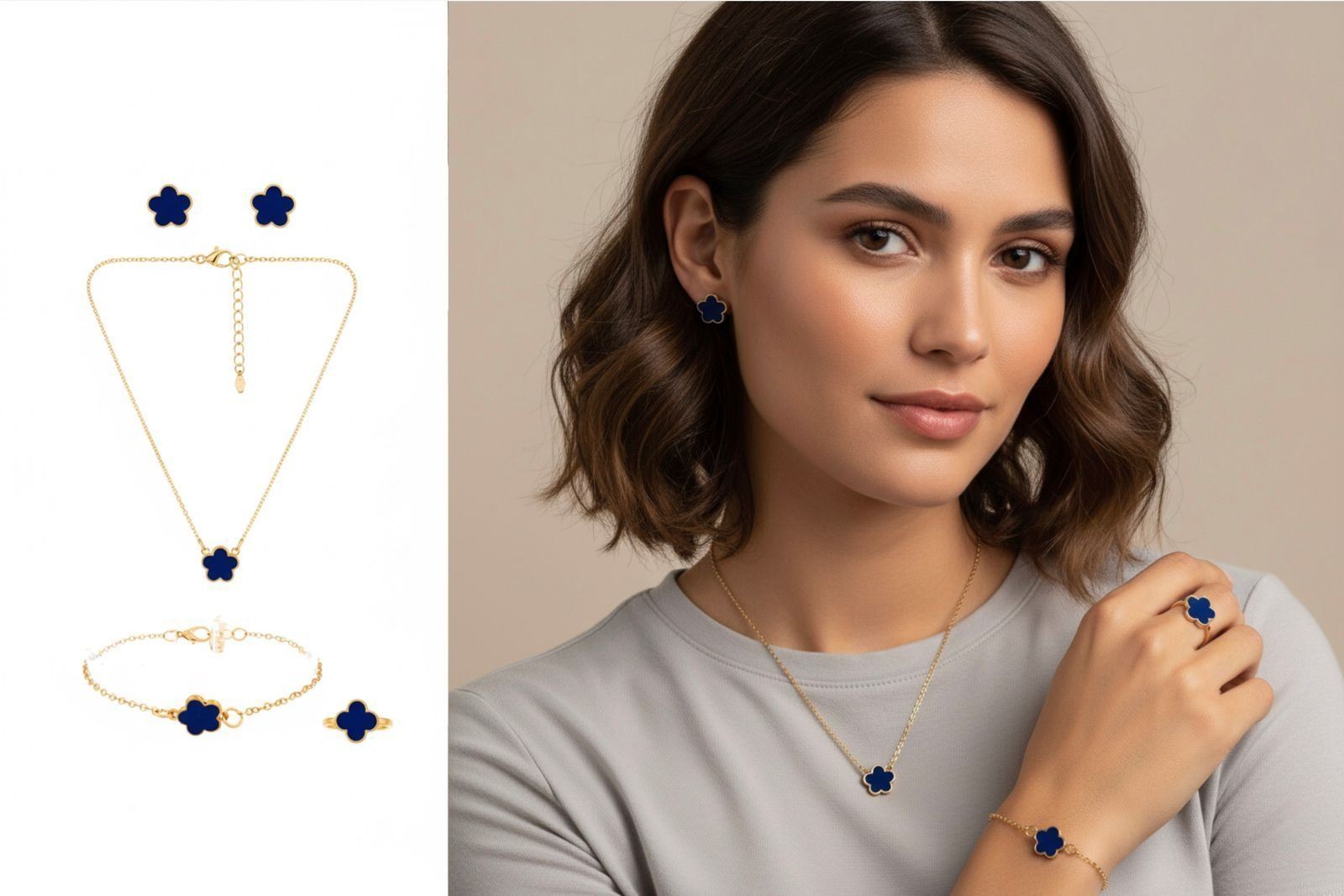 18kt Luxurious G.P. 5 Leaf Clover Enamel Jewellery Set - Earrings, Bracelet, Necklace & Ring Set. Dark Blue Ð A3273
