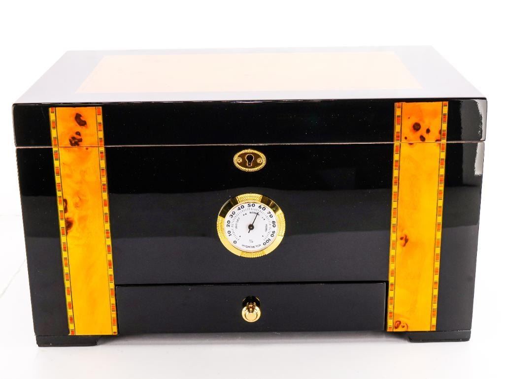 Elevate your collection with this distinguished multi-category offering, centered around an Executive 150-Count Cigar Humidor finished in a rich piano high-polish lacquer, designed to preserve and present cigars with sophistication and precision.