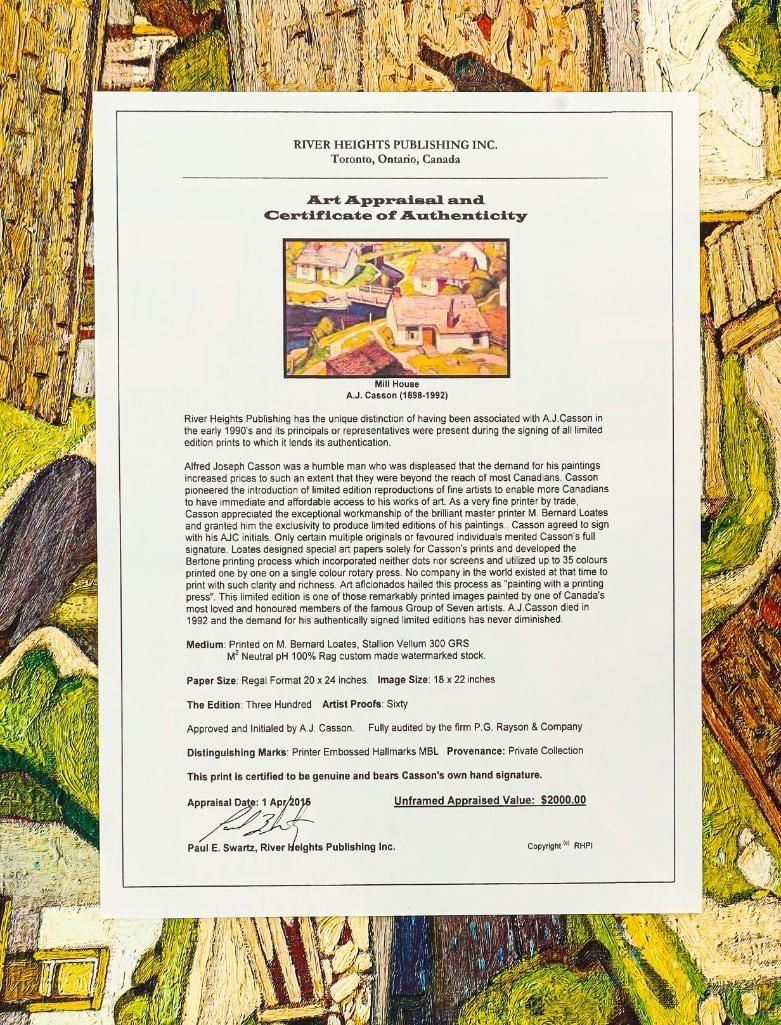 A. J. Casson (1898Ð1992) was a Canadian painter and designer, best known as the youngest member of the Group of Seven. He became famous for calm, carefully structured landscapes of OntarioÑsmall towns, lakes, farms, and forestsÑpainted with simplified shapes, clear outlines, and a strong sense of design. CassonÕs work often feels quiet and orderly, turning everyday scenery into bold, balanced compositions that are still easy to recognize today. One of his Art work is Mill House Ð ART1038