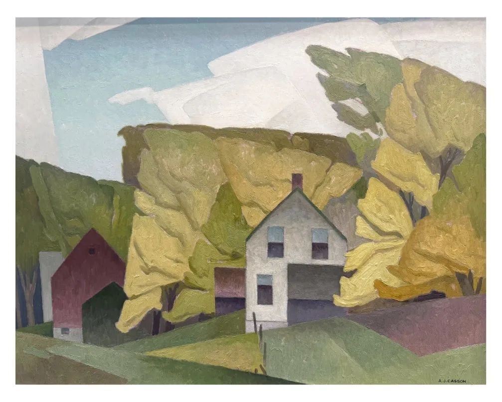 A.J. Casson (1898Ð1992) "Farm in the Hills" Fine Art Giclee. 16x20". A.J. Casson was a prominent Canadian landscape artist and a member of the famous Group of Seven. He is known for his depictions of Southern Ontario landscapes, forests, and rural architecture. Ð A6141