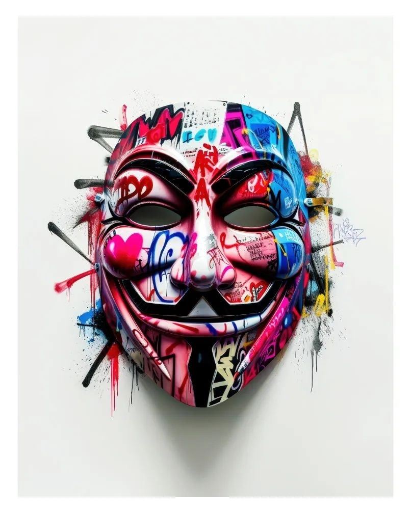 "Anonymous" 16x20" Fine Art Giclee. The mask is a symbol associated with the hacker group Anonymous and the graphic novel and film V for Vendetta. The style blends modern art with street art elements. Ð A6169