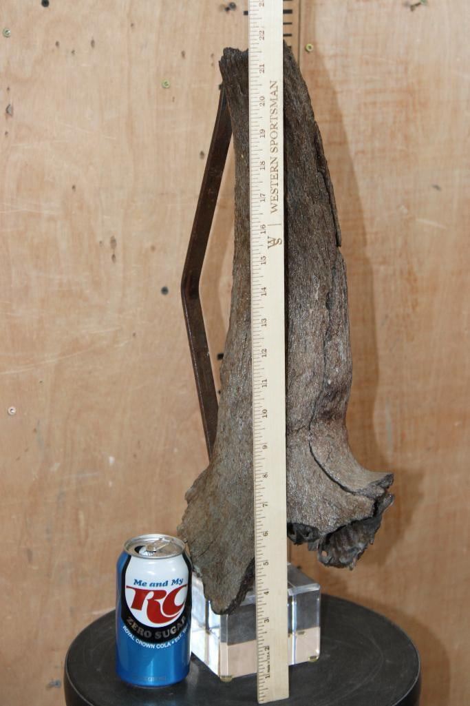 Fossilized BUFFALO or BISON Horn on a Custom Built Metal and Plexiglass Stand. It measures 22" Tall x 8.5" Long x 6.5" Wide and Weighs 8 lbs 9 oz. TAXIDERMY FOSSILS