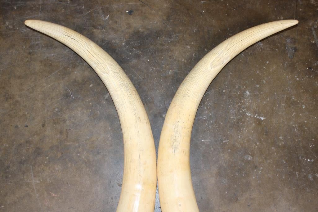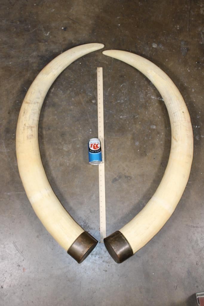 *TEXAS RESIDENTS ONLY*! Very Nice and Big Set of 2 ELEPHANT IVORY TUSKS with Brass Caps. One measures 59" Long and 14 7/8" around the Tusk Base, it Weighs 31 lbs 9 oz. The other measures 58 3/8" Long and 14.75" around the Tusk Base, it Weighs 31 lbs. The Total Weight for both is 62 lbs 9 oz. TAXIDERMY?
