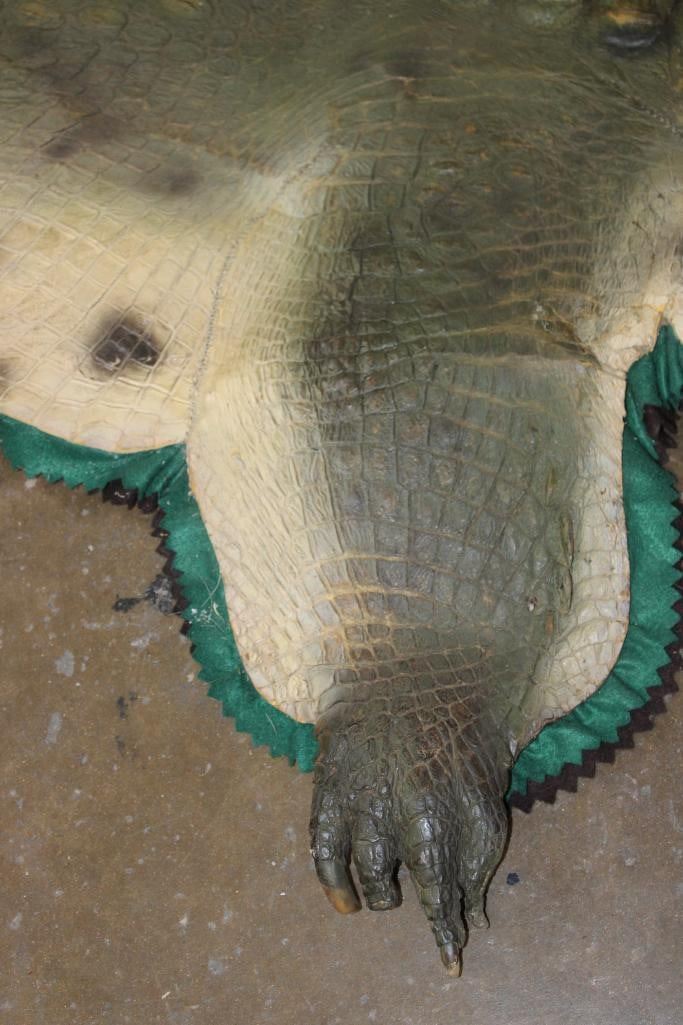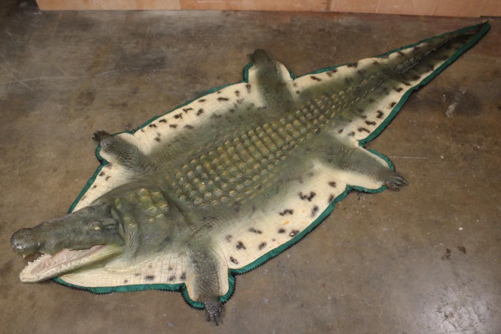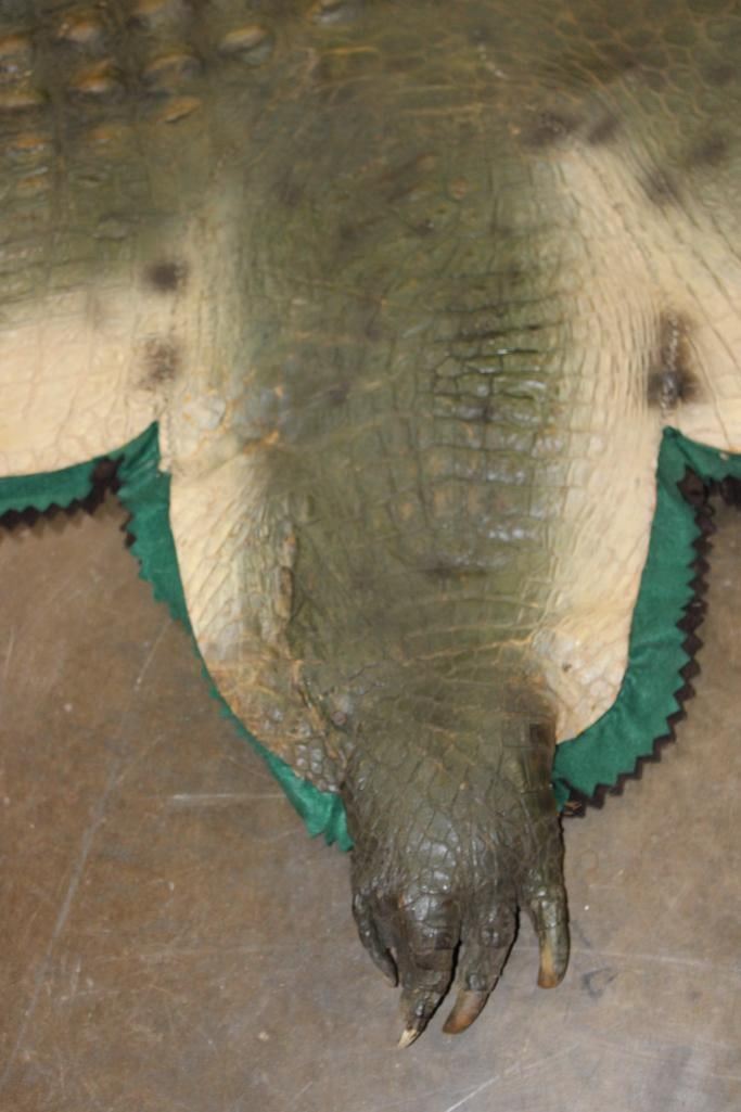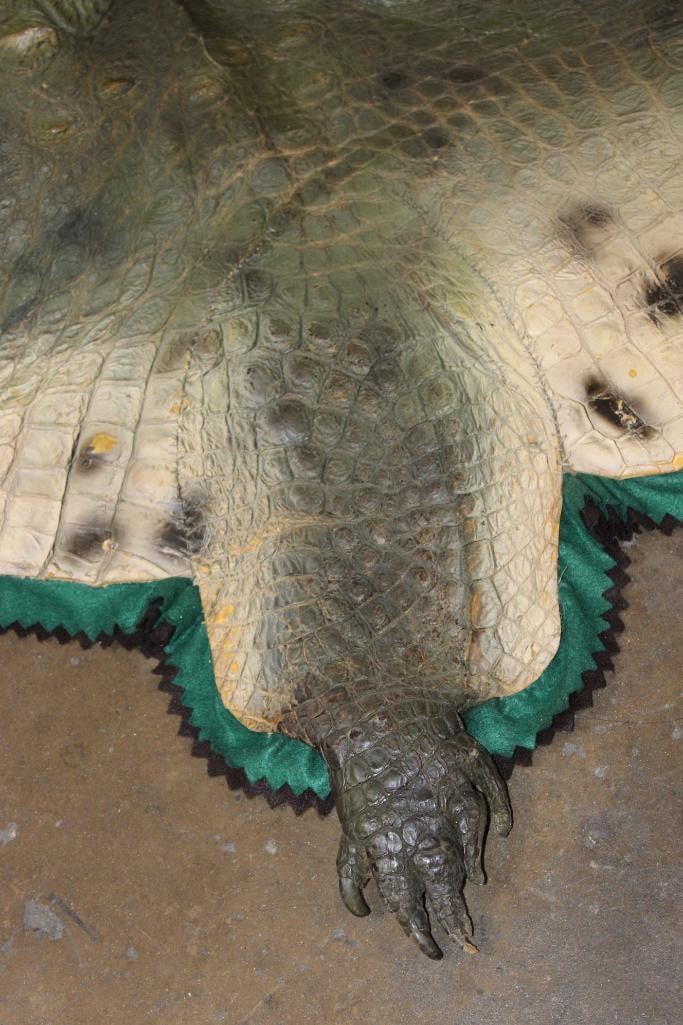 XXL *Real Skin* CROCODILE Hide or CROCODILE Rug with a Reproduction Head. It measures 12' 1" Long and is Double Felted. It has minor paint scuffs and nail holes from being hung. Otherwise, it is in Good Condition. TAXIDERMY HIDE RUGS