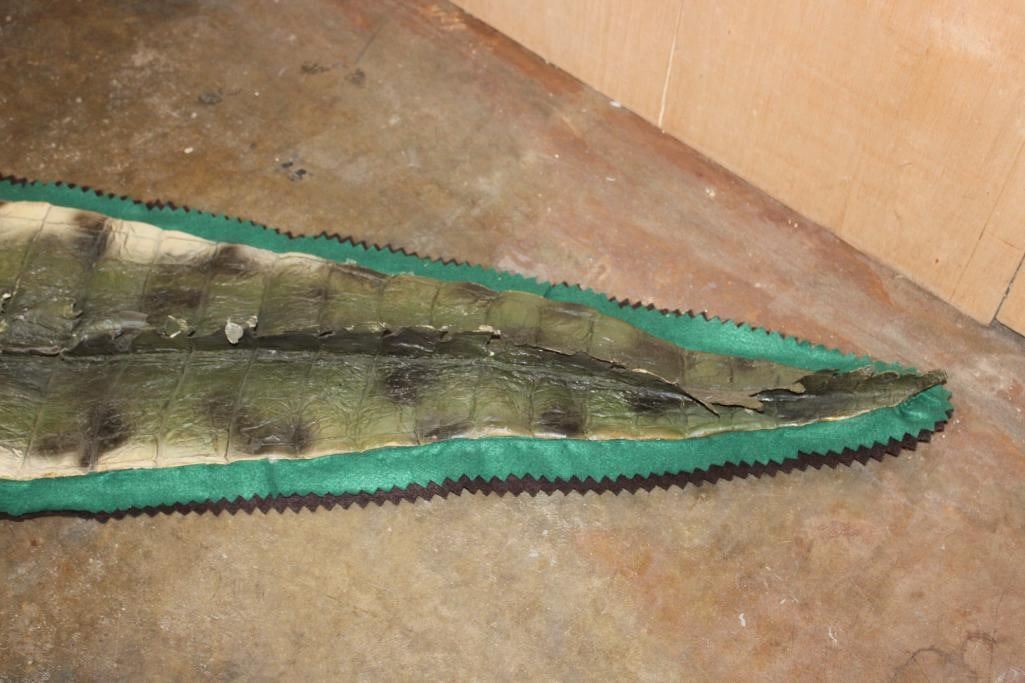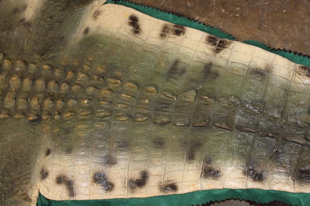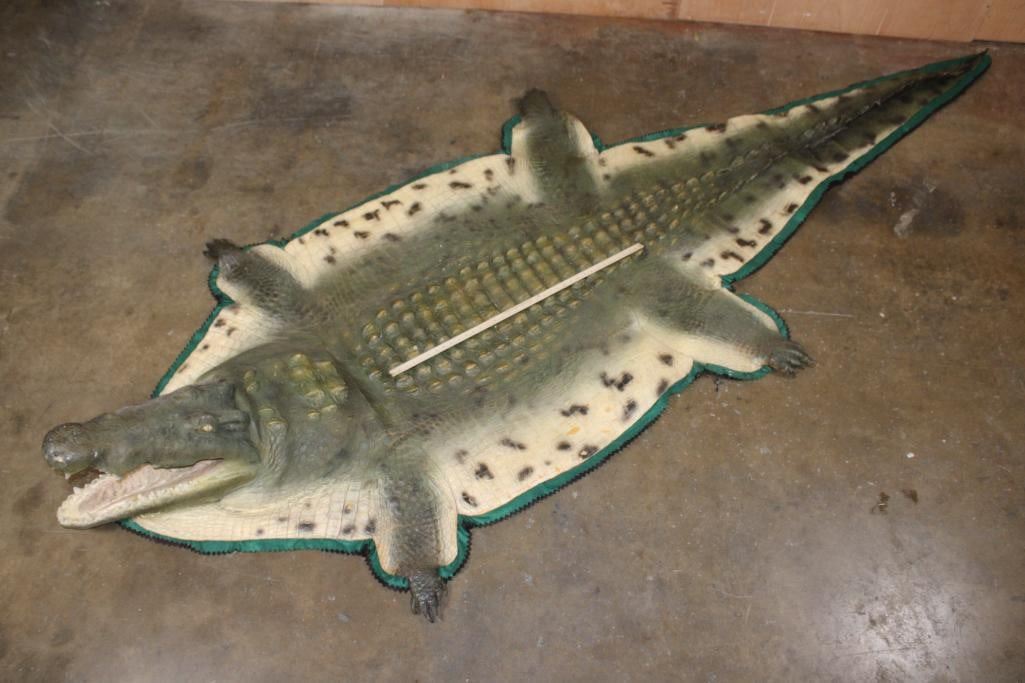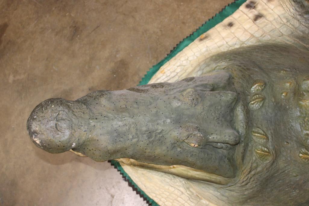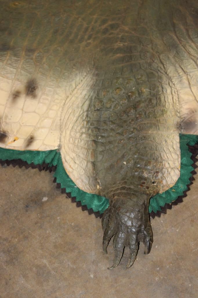 XXL *Real Skin* CROCODILE Hide or CROCODILE Rug with a Reproduction Head. It measures 12' 1" Long and is Double Felted. It has minor paint scuffs and nail holes from being hung. Otherwise, it is in Good Condition. TAXIDERMY HIDE RUGS