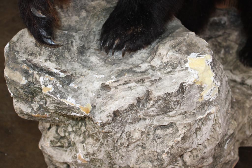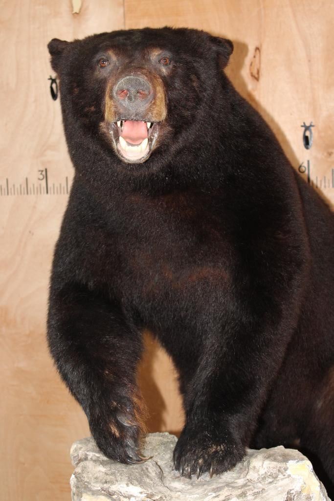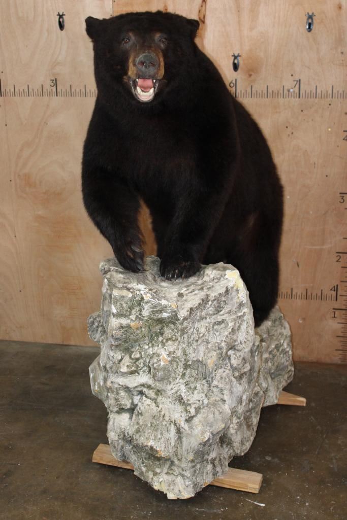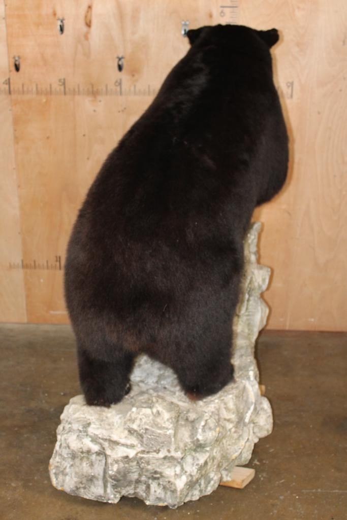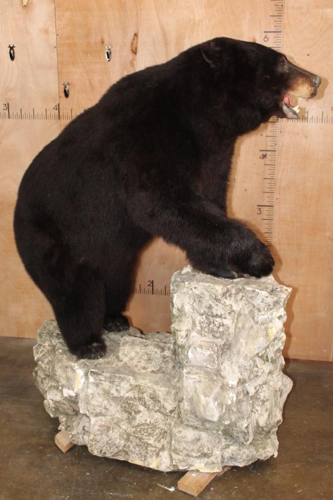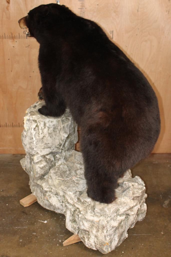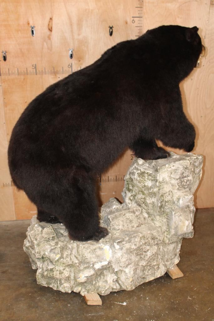 Massive XXL Life-sized BLACK BEAR with All its Claws. The Total Mount measures 52" Long x 30" Wide x 69" Tall. The Rocky Base with Wheels has a few scuffs but the Bear is in Good Condition. TAXIDERMY