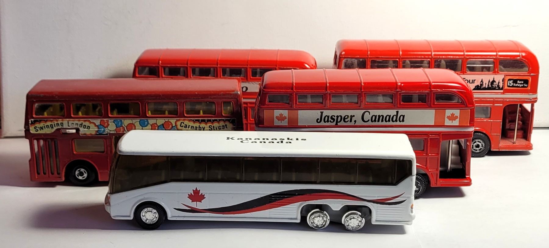 DOUBLE DECKER MODELS FROM JASPER, KANANASKIS, TORONTO, LONDON SIGHT SEEING TOUR & VINTAGE SWINGING LONDON, CARNABY STREET BUS. COLLECTIBLES