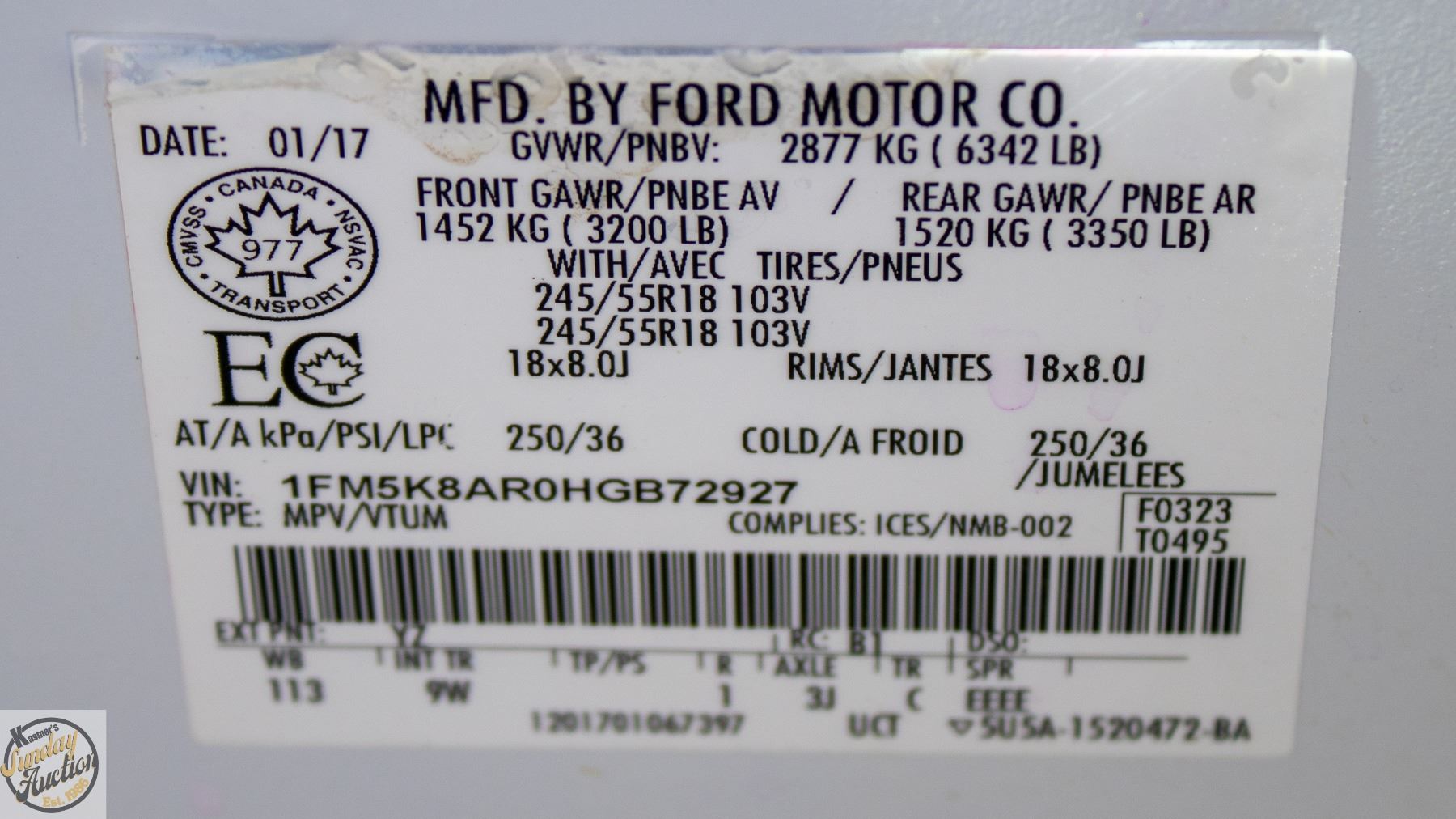 VIN: 1FM5K8AR0HGB72927