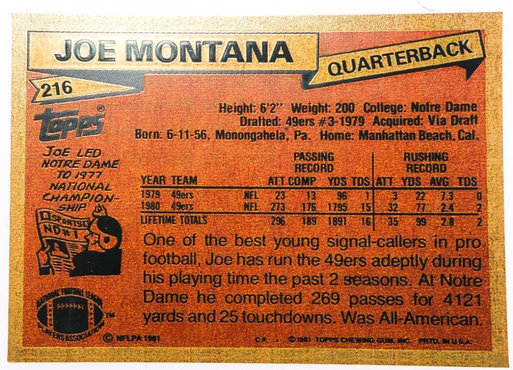 Lot 32 topps JOE MONTANA 49ers Rookie Year 1981 23kt Gold