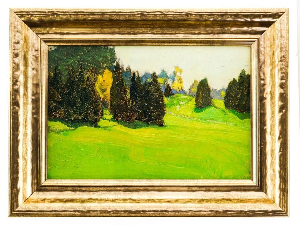 """Group of Seven"" Artist - "J.E.H. MacDonald" "Evergreen" Oil on Panel, 6 x 9 ", Iconic Artists Collection, 24kt Gold Leaf Frame, COA Embossed in 24kt Gold on the Back of The Panel " Ð 7005282