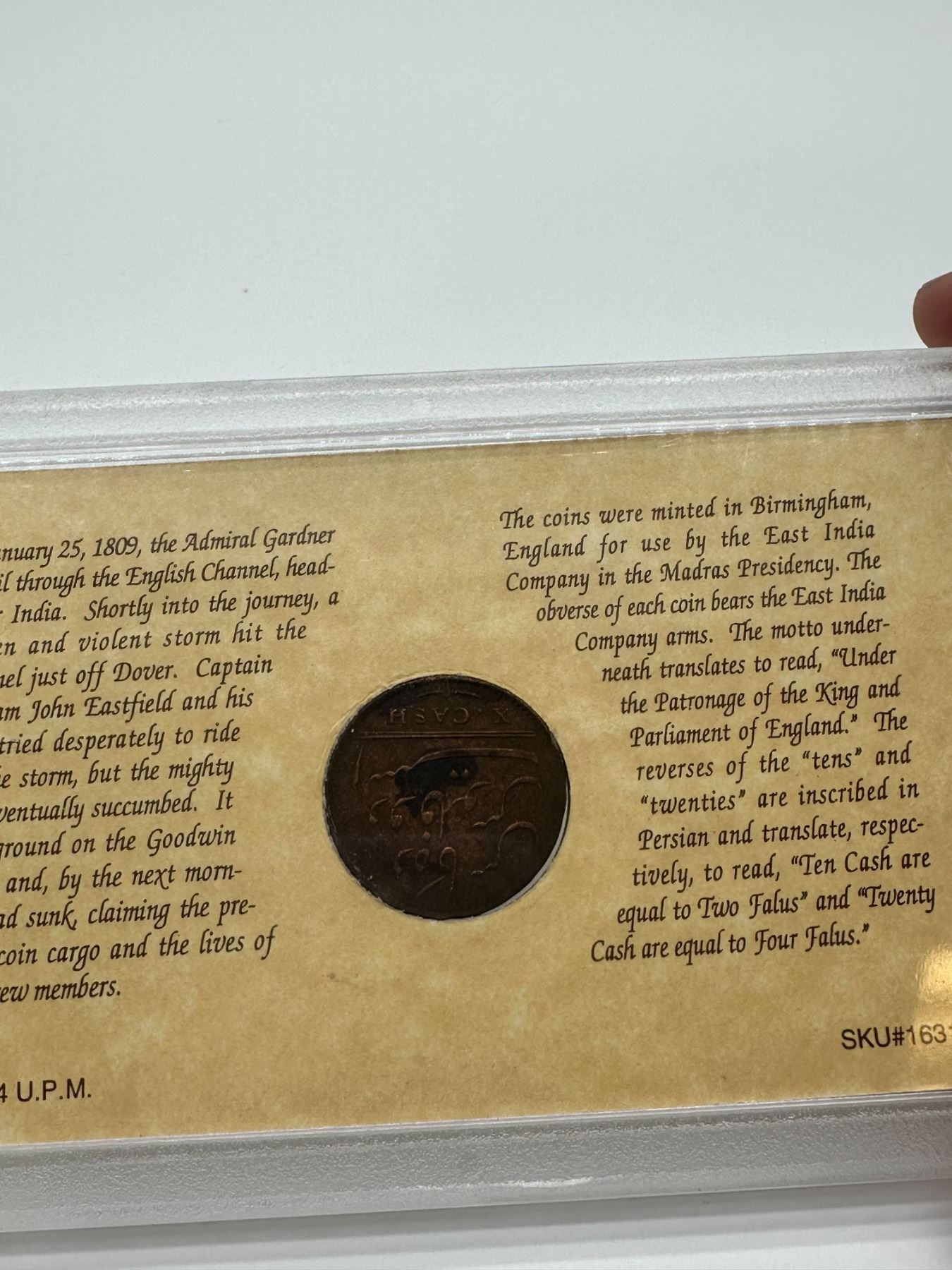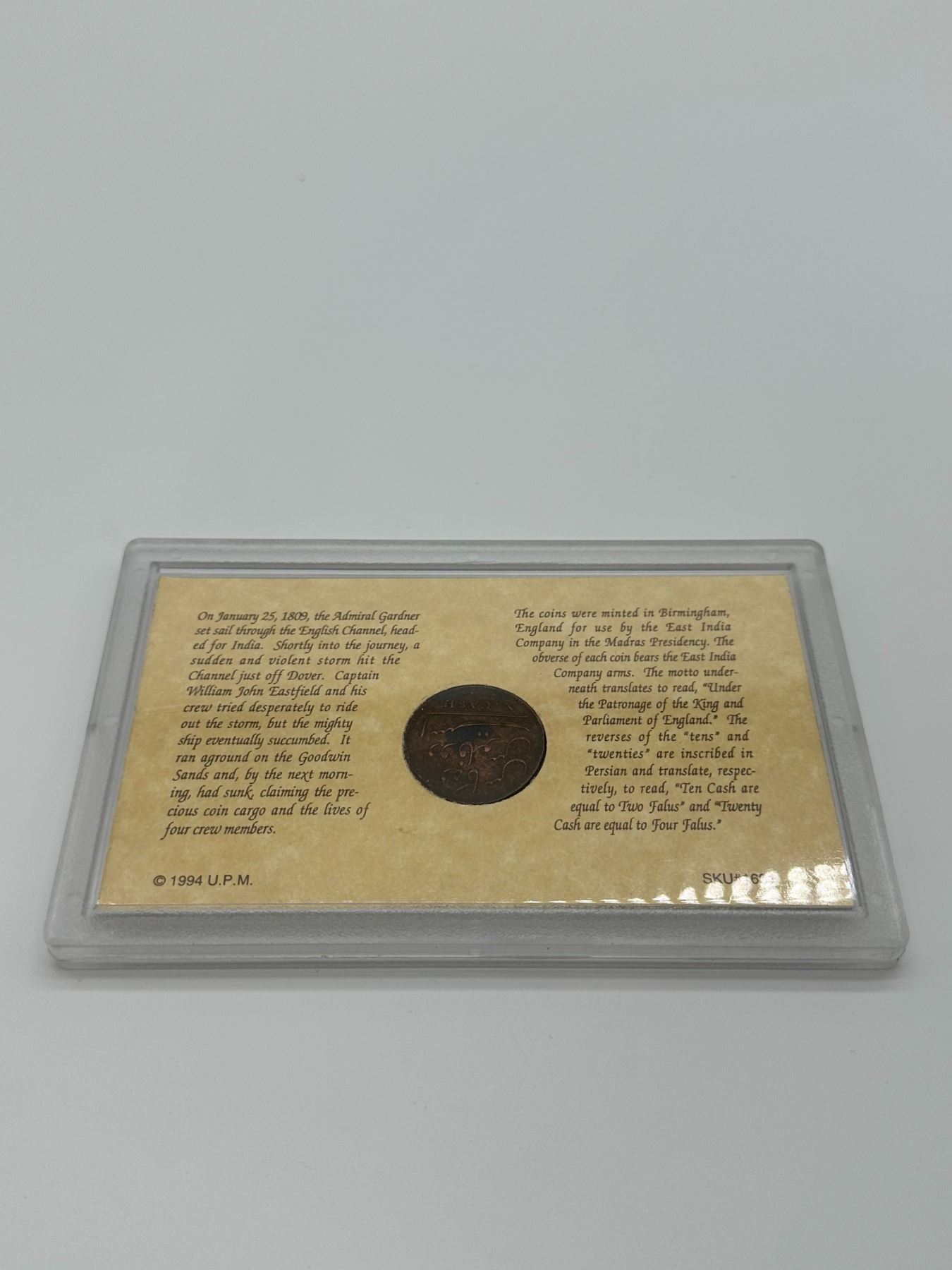 1808 East India Company coin, Admiral Gardner shipwreck salvage, mounted display case.