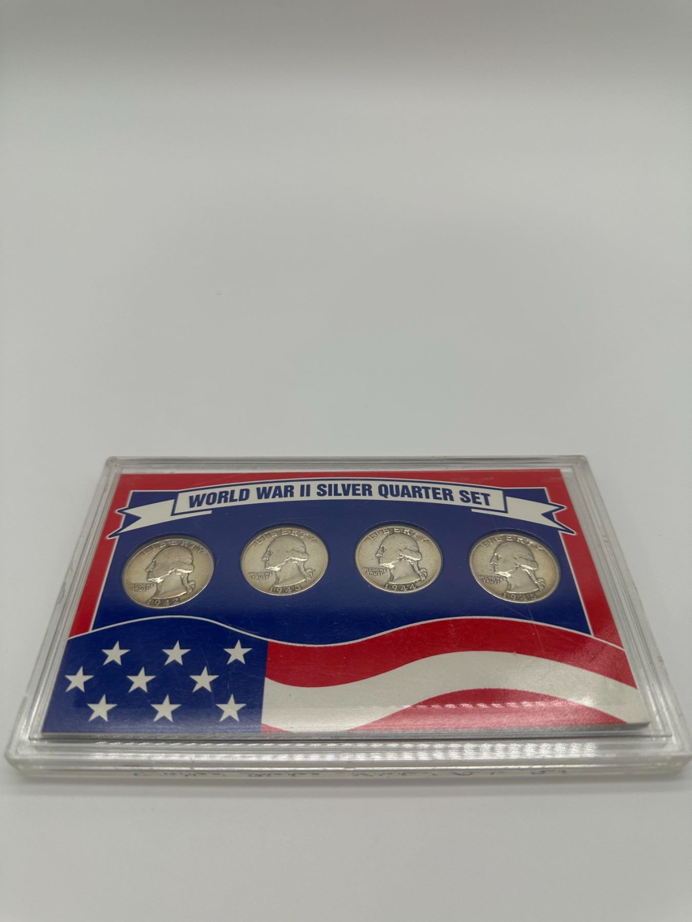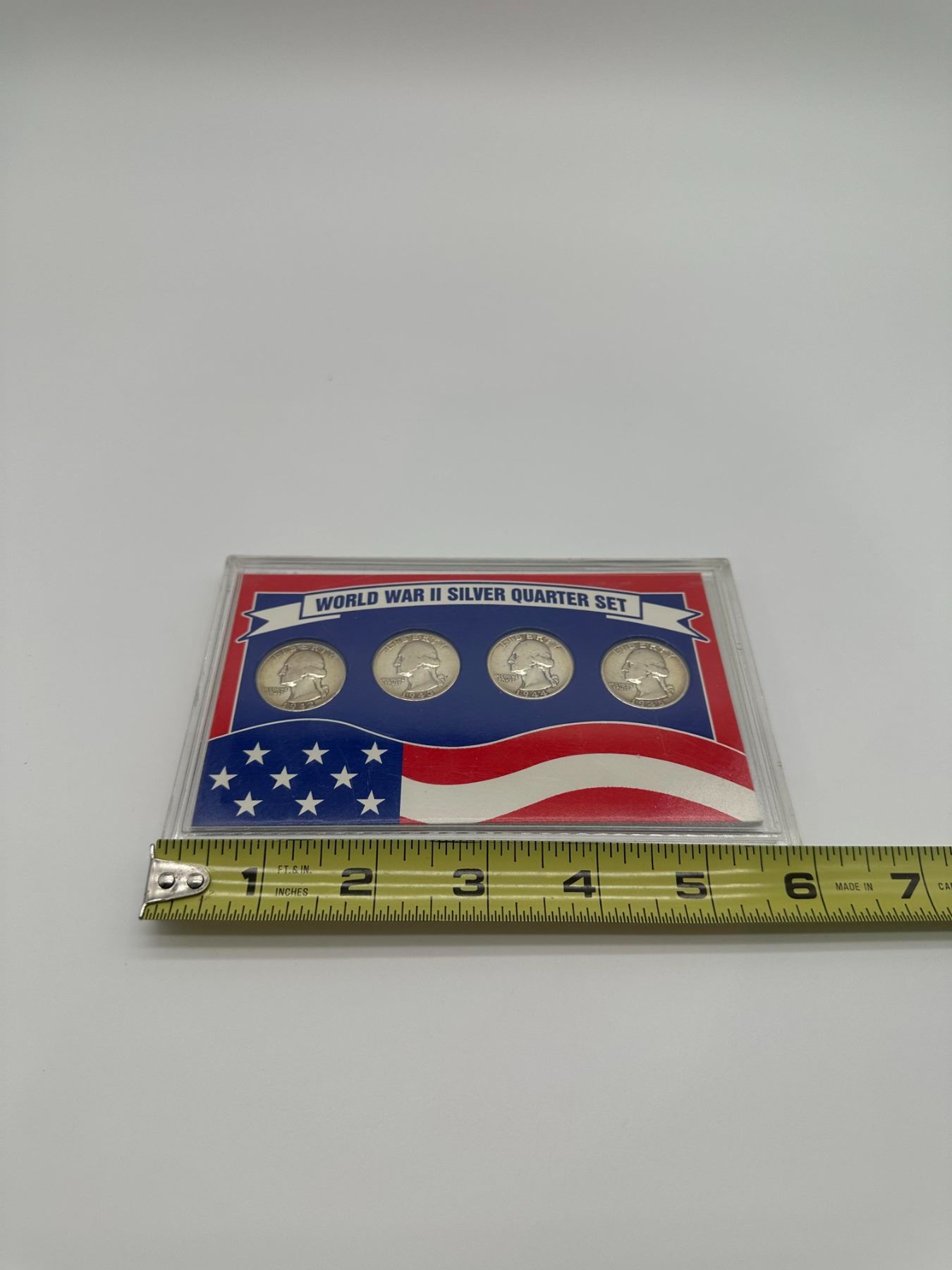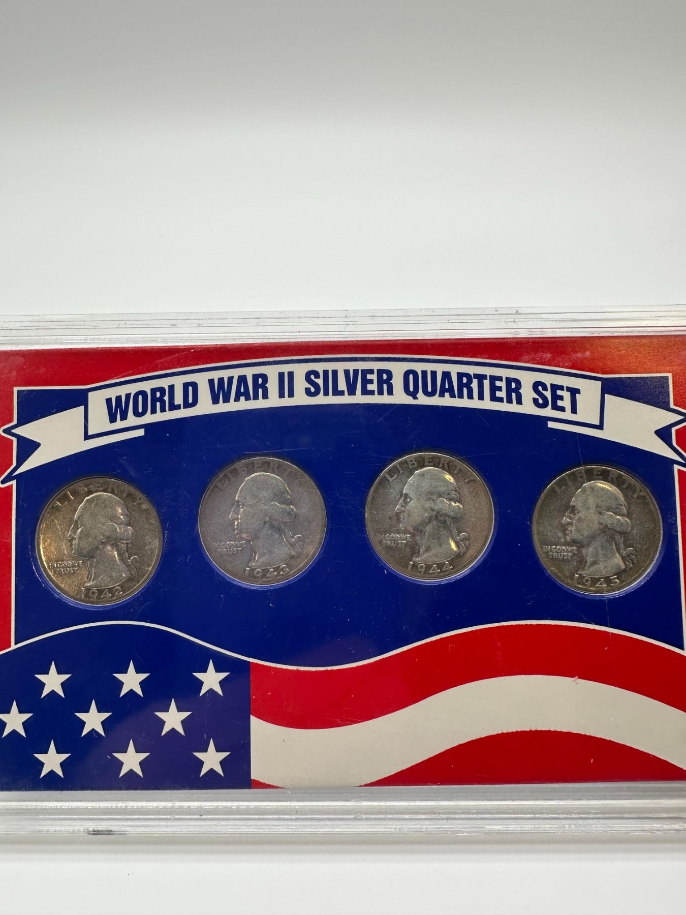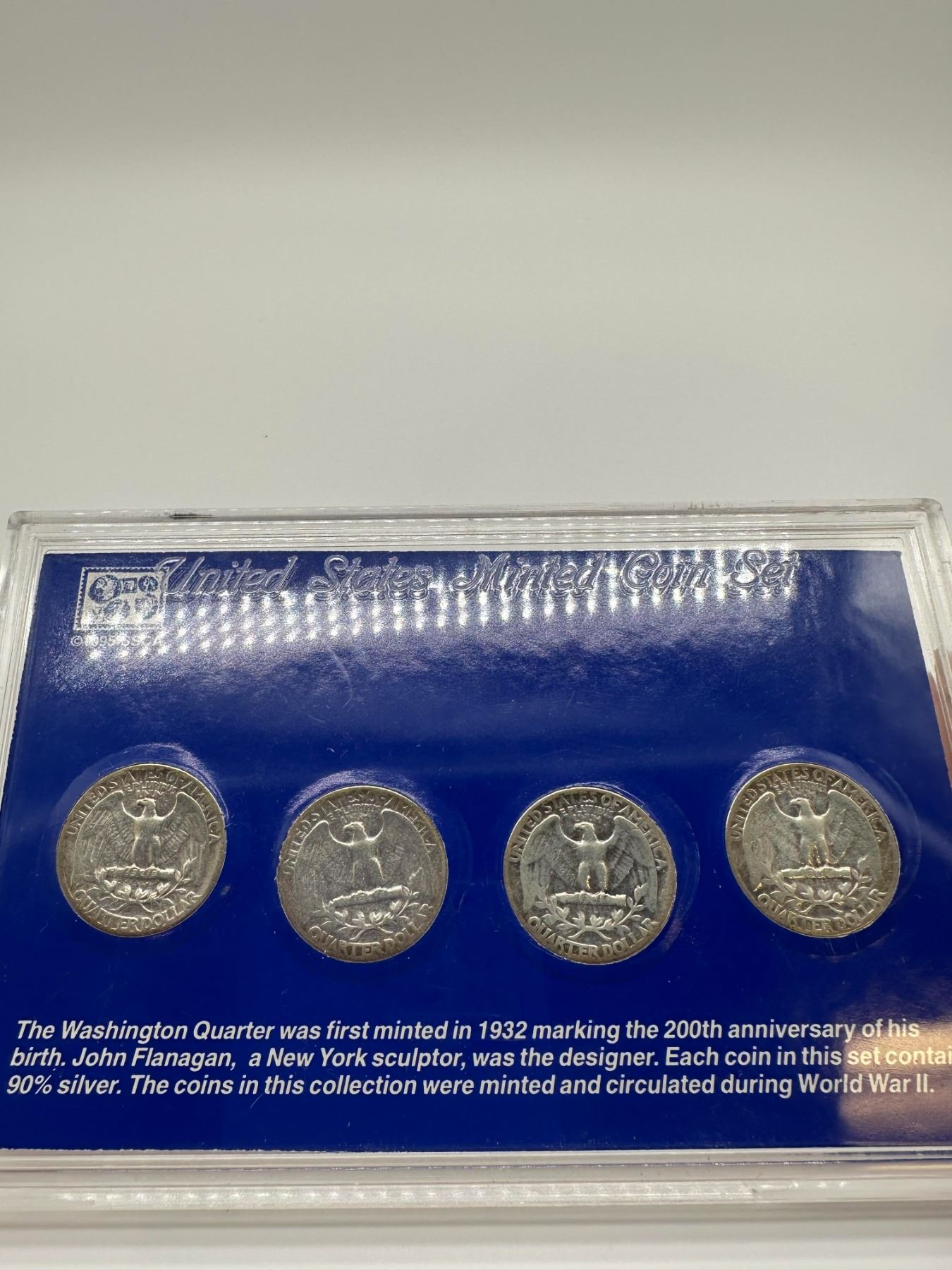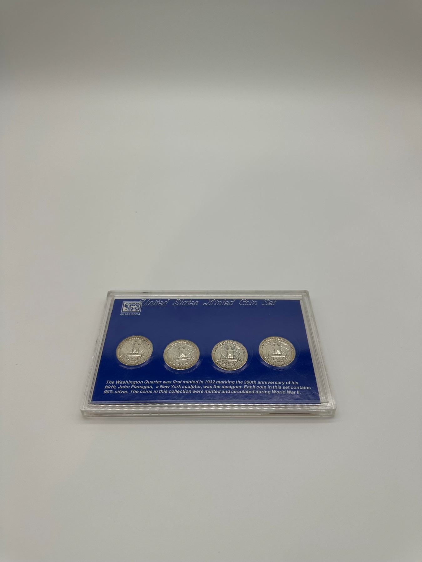 4-coin set, 1942–1945 Washington quarters, 90% silver, circulated, display holder.