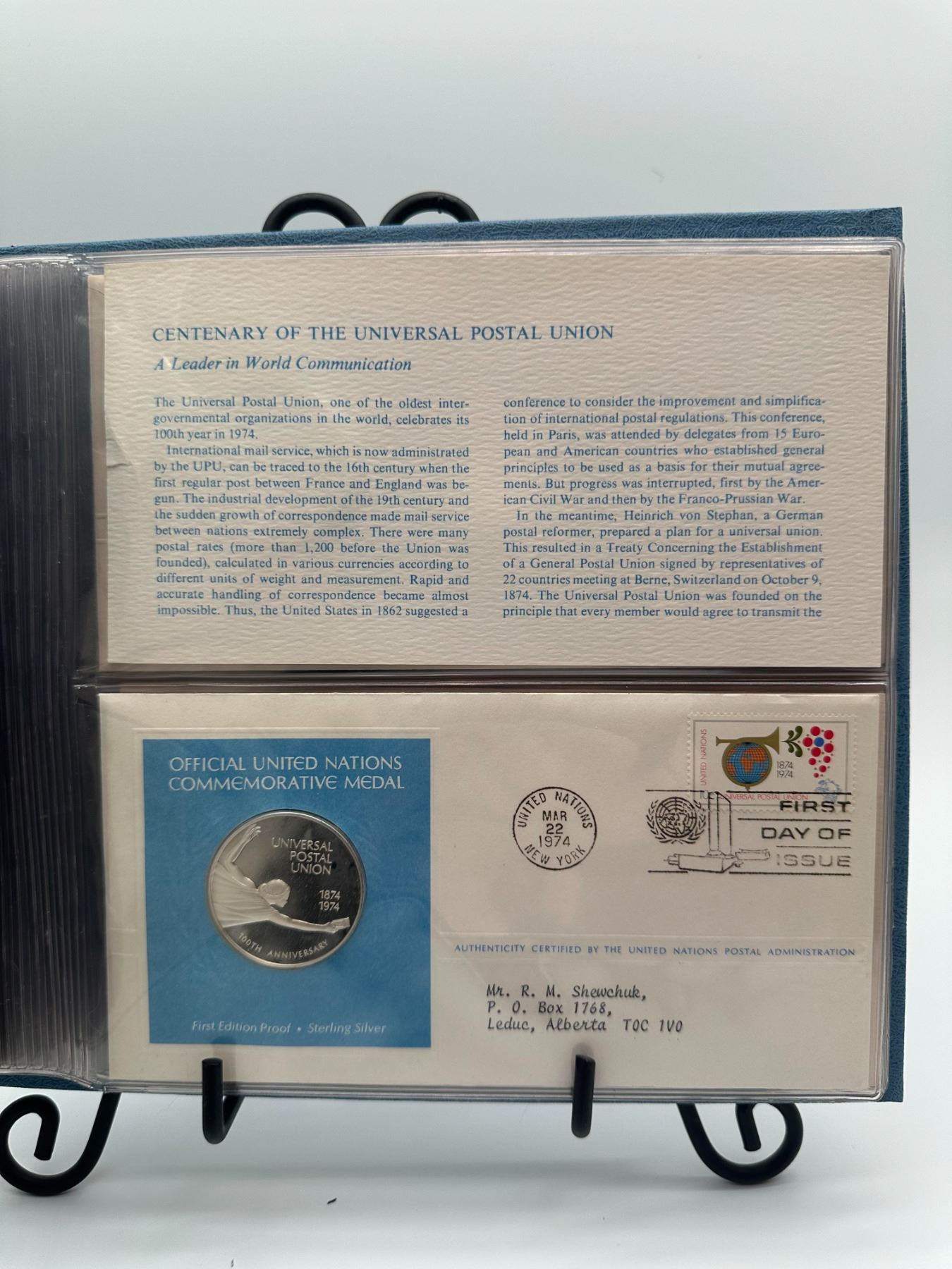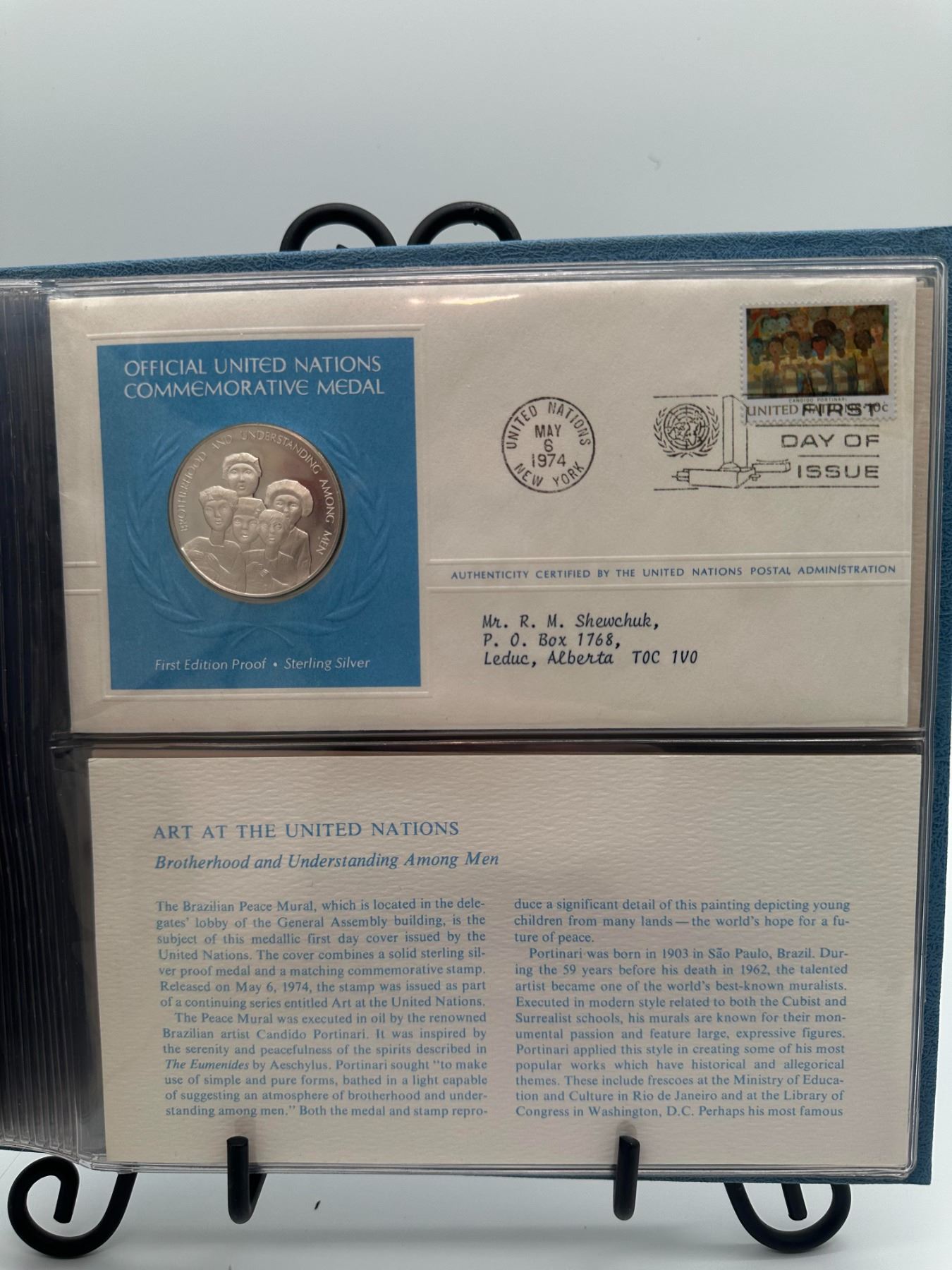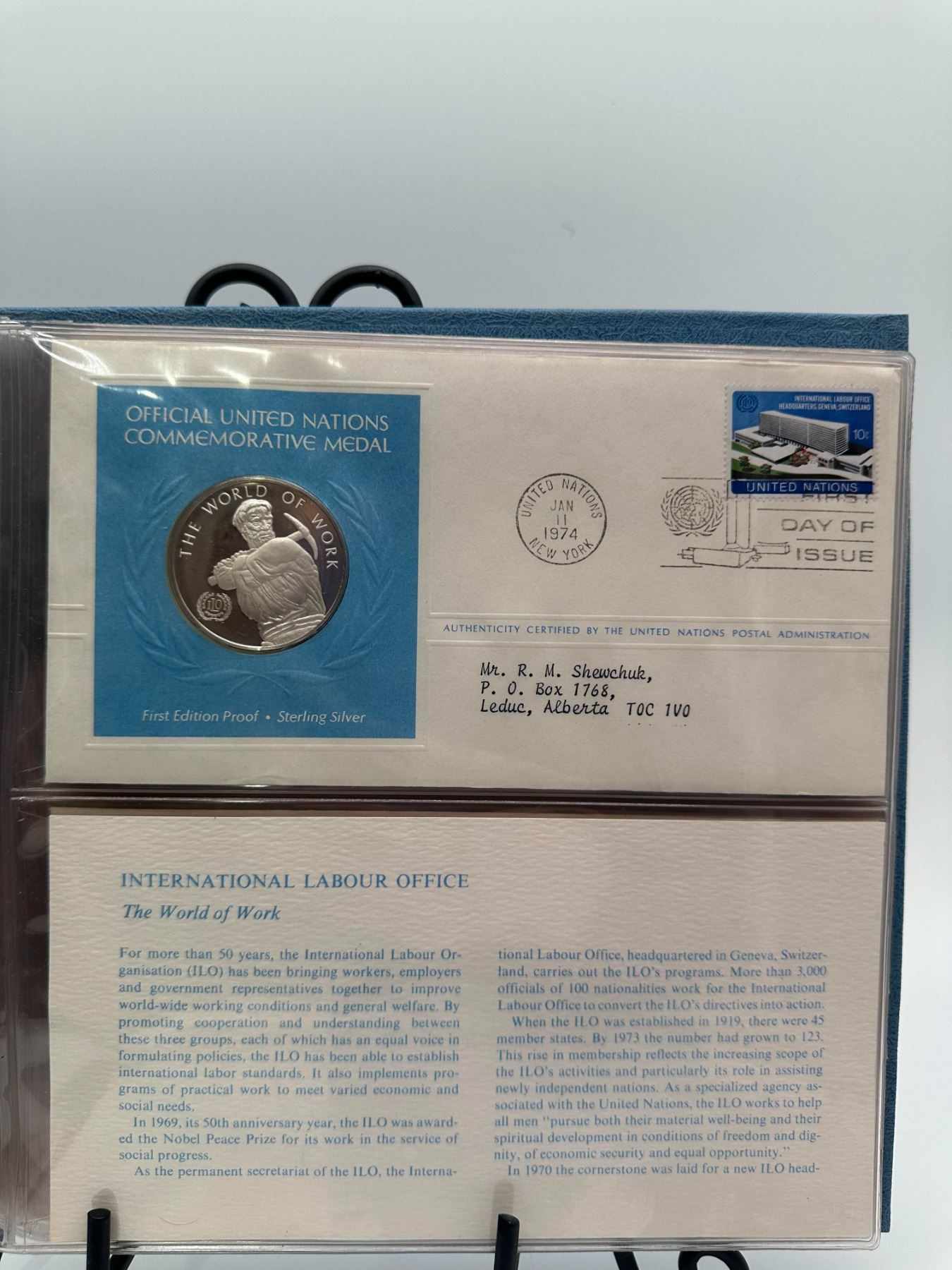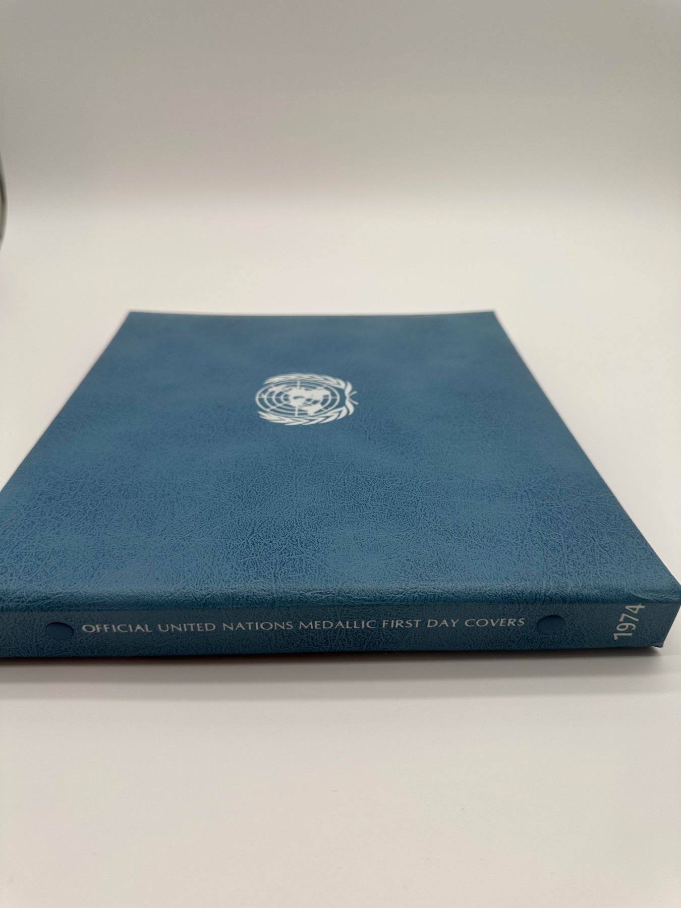 UN first day cover album, 1974 issues, sterling silver proof medals, multiple pages.