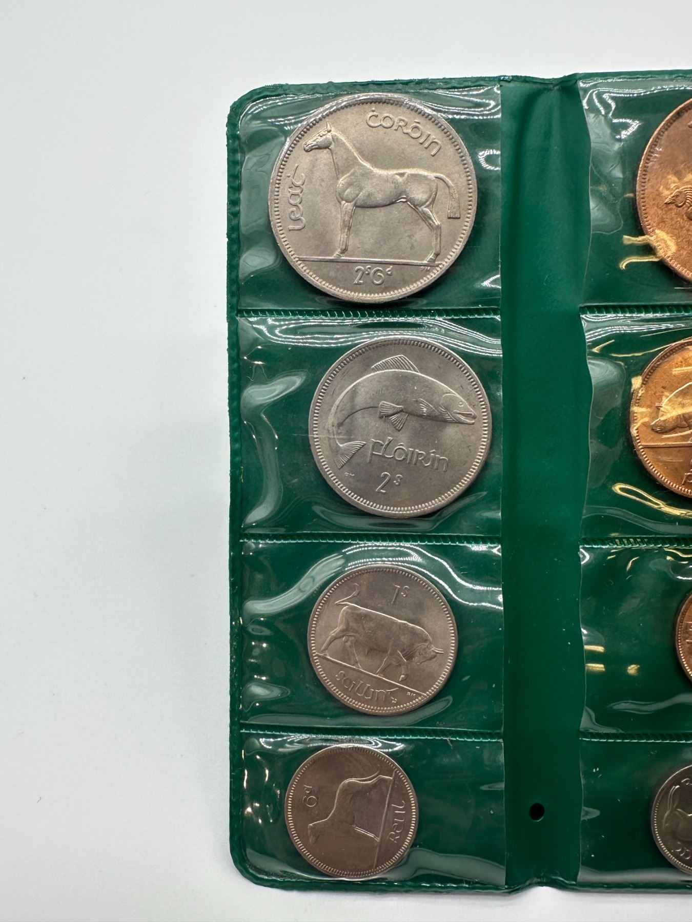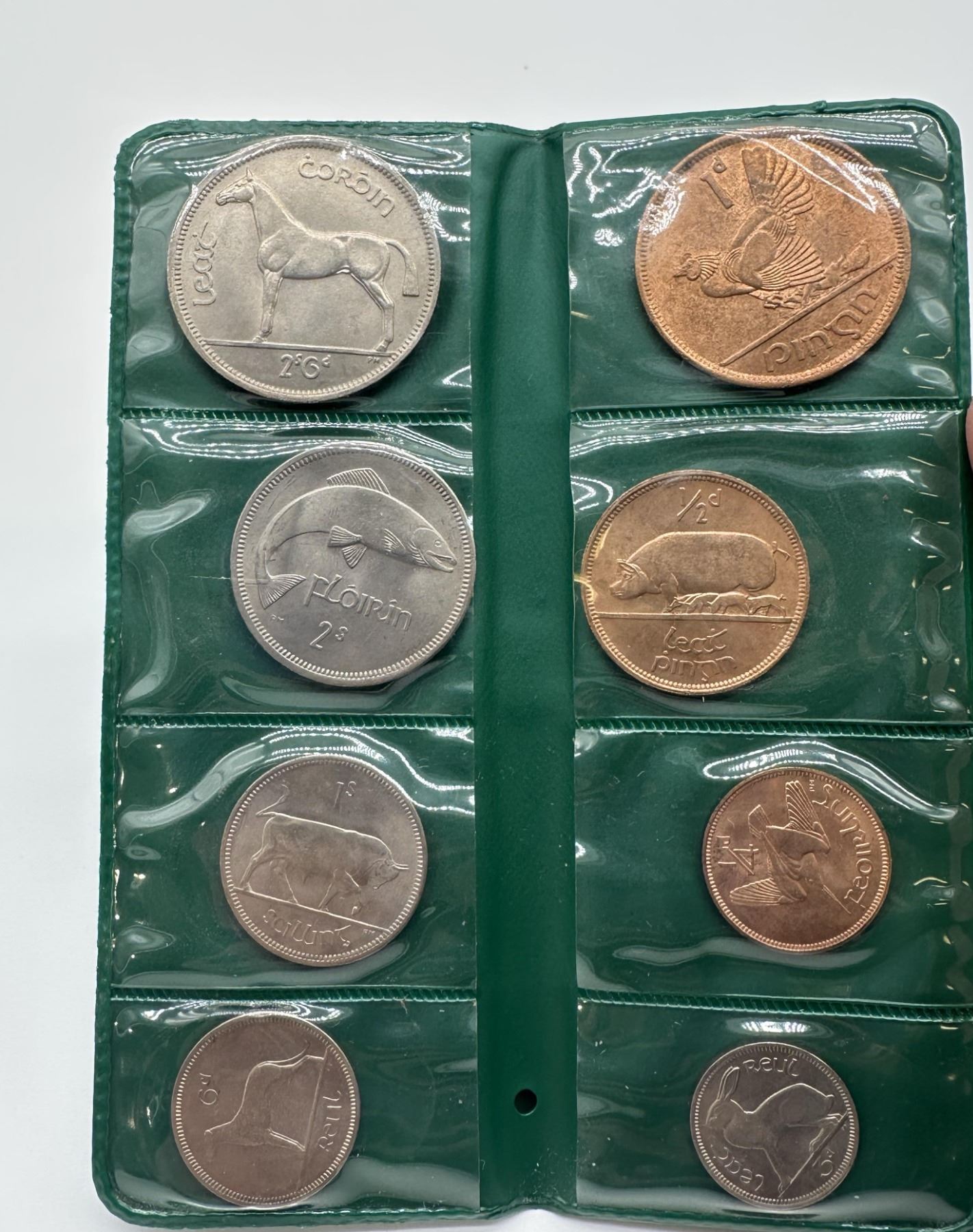 Set of Irish coins including various denominations with animal designs, housed in original green 'Coins of Ireland' wallet.