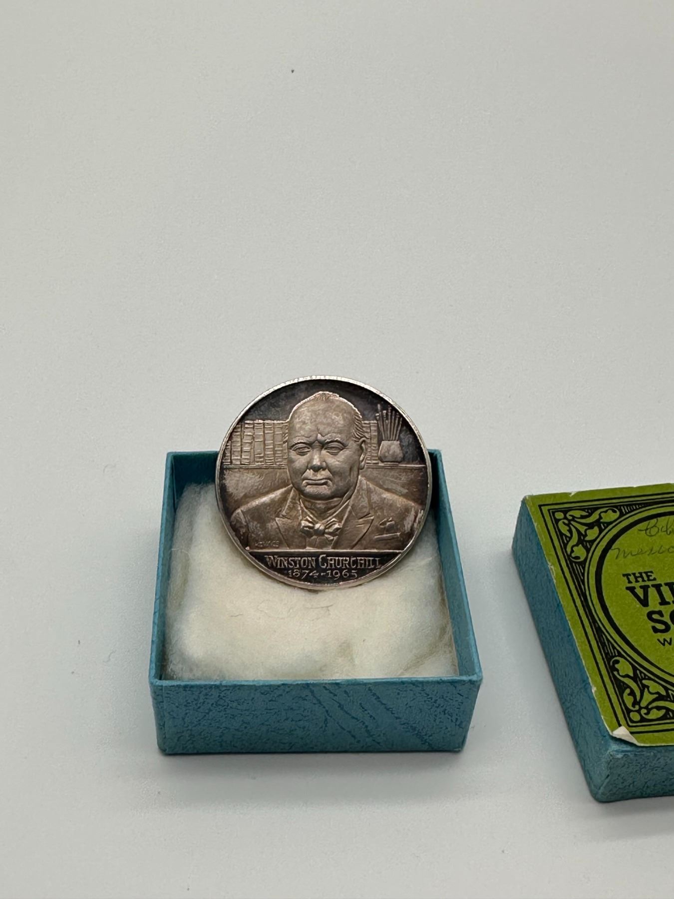 Commemorative medal featuring Winston Churchill (1874–1965) with reverse depicting wartime scene and quote, housed in original presentation box.