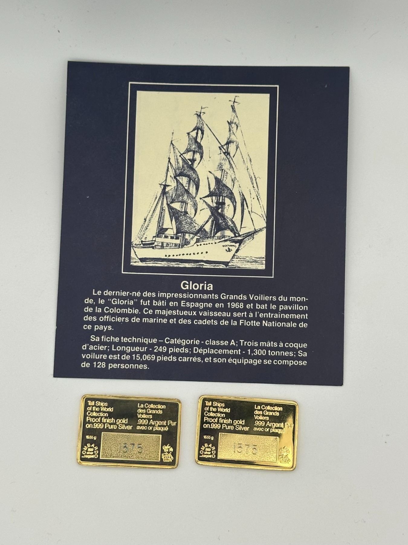 Set of two gold-plated .999 silver proof bars featuring tall ships Gloria and Oriole from the Tall Ships of the World collection, each individually numbered, with descriptive card.