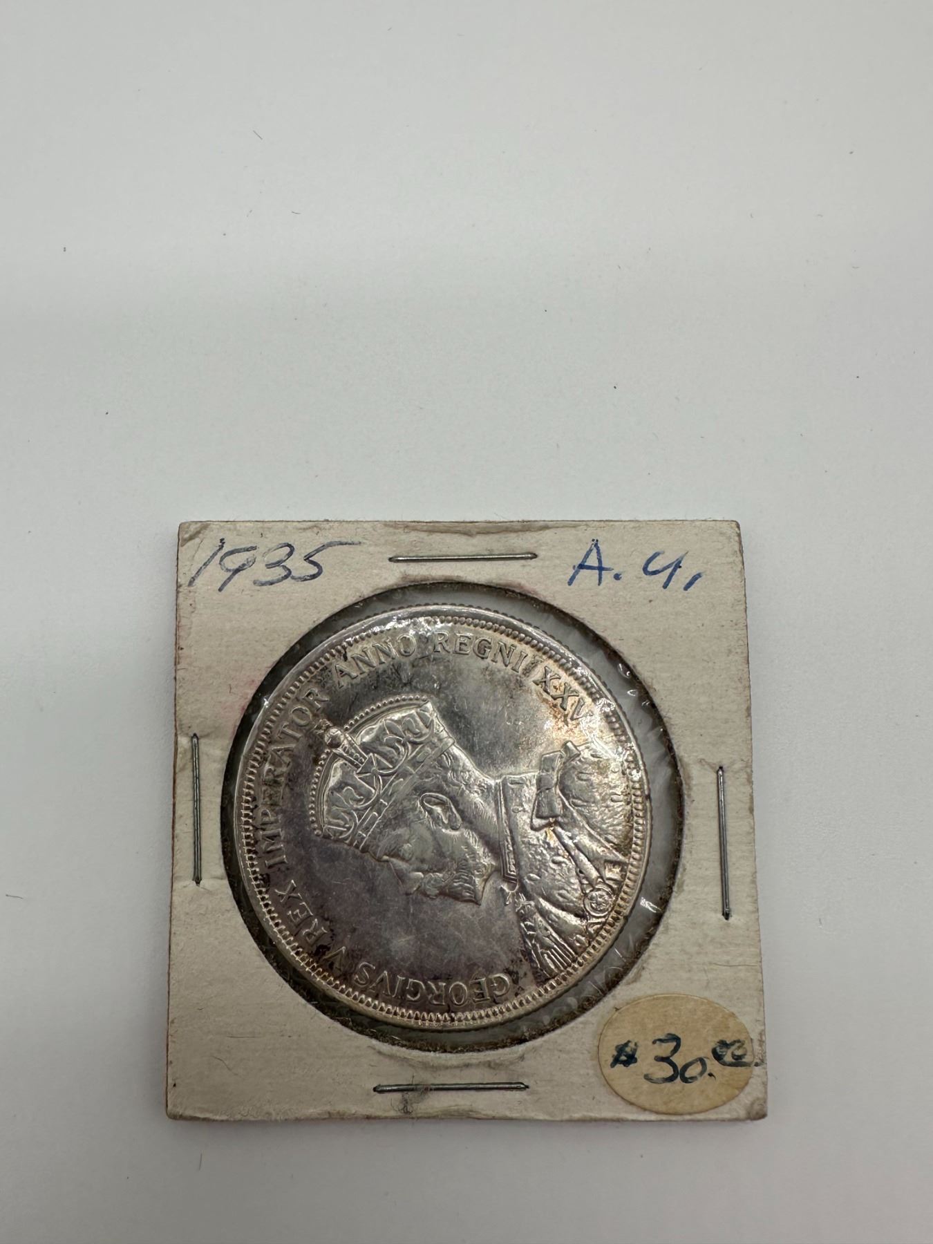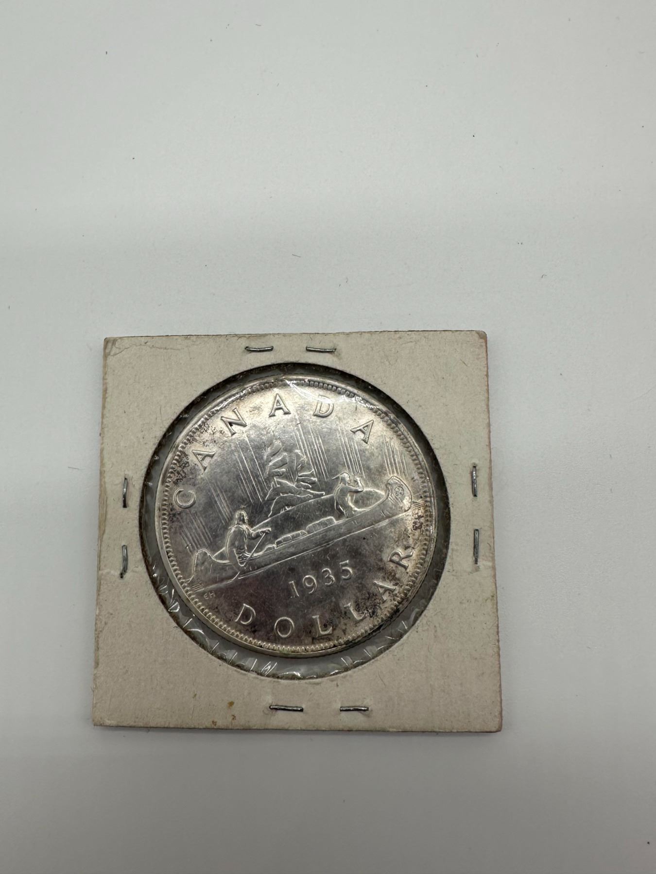 1935 Canadian silver dollar featuring King George V obverse and Voyageur canoe reverse, housed in 2x2 holder with handwritten notes.