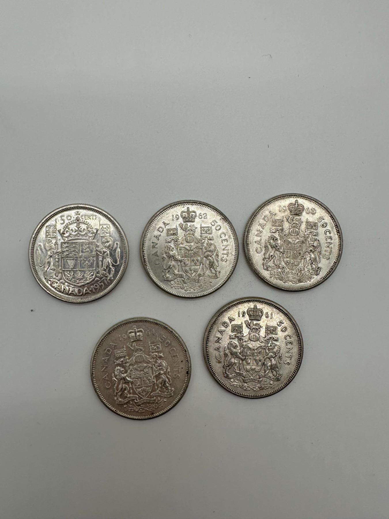 Group of five Canadian 50 cent coins featuring Queen Elizabeth II obverse and Canadian coat of arms reverse, dated 1950s–1960s (including 1958, 1961–1964). Silver composition era coins.