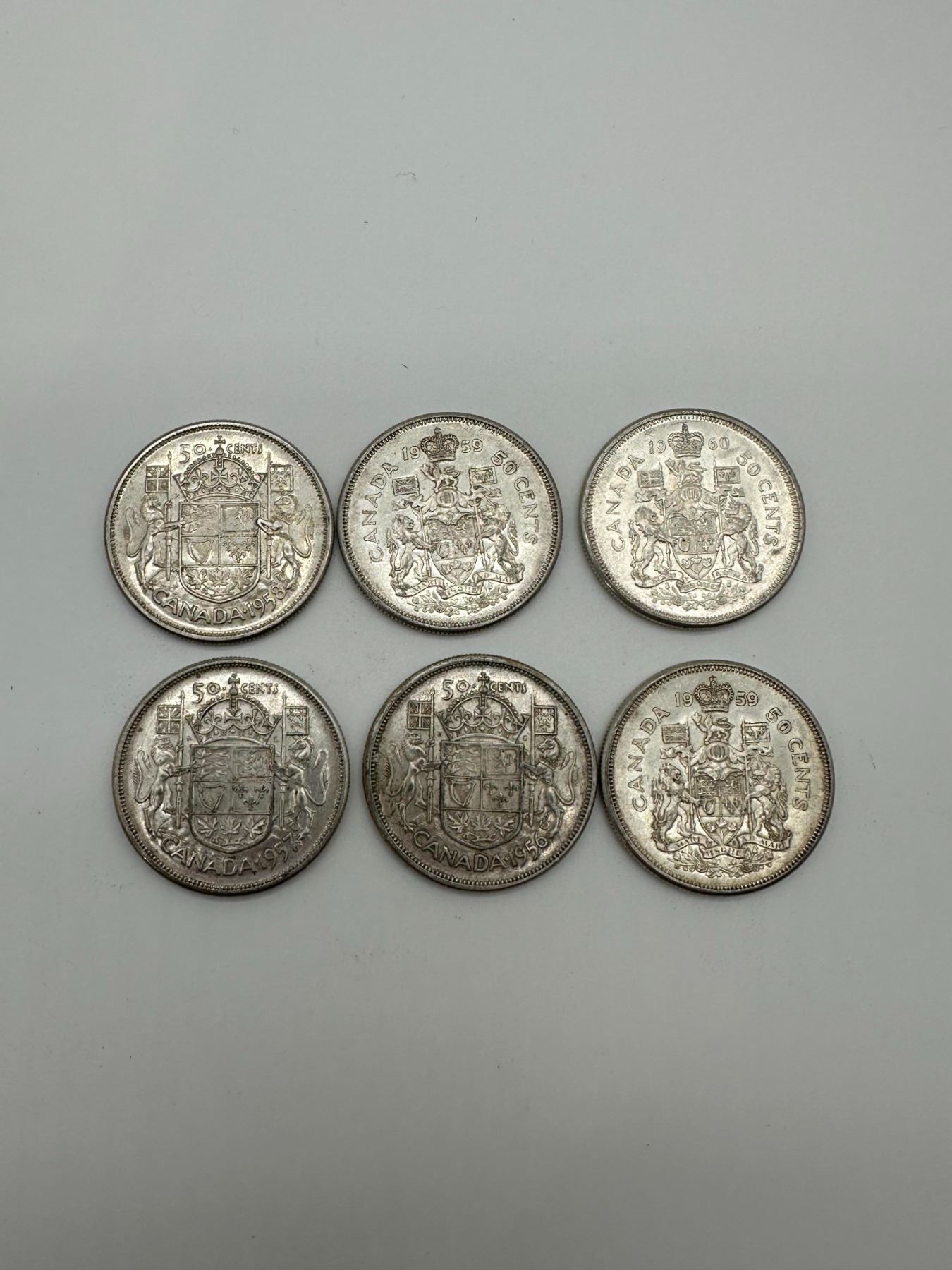 Group of six Canadian 50 cent coins featuring Queen Elizabeth II obverse and Canadian coat of arms reverse, dated 1950s–1960s (including 1956, 1959, 1960). Silver composition era coins.