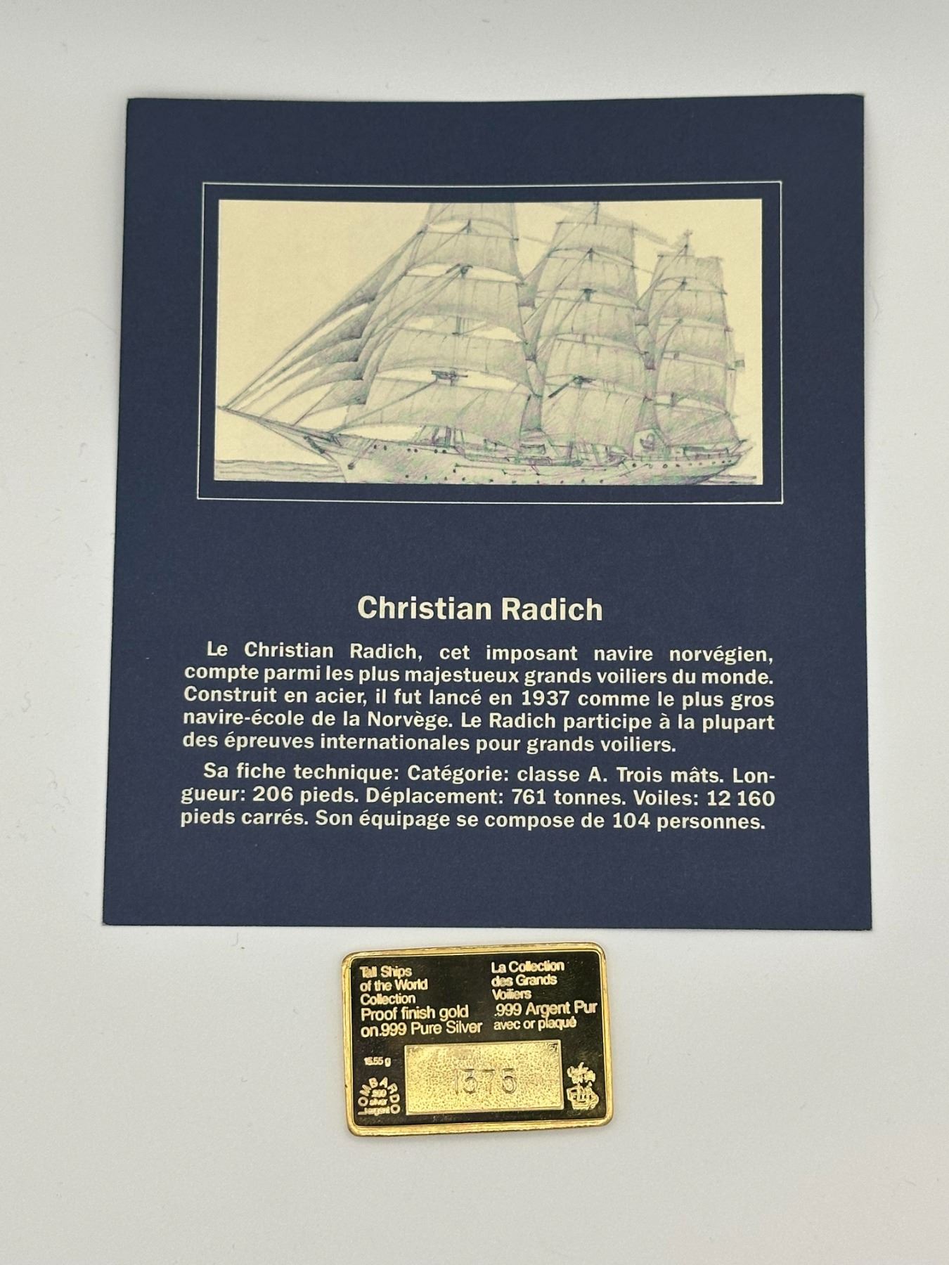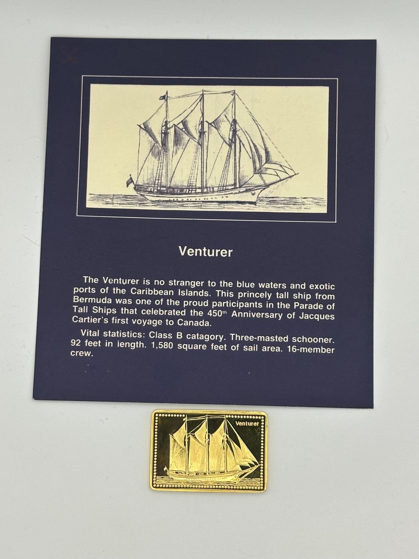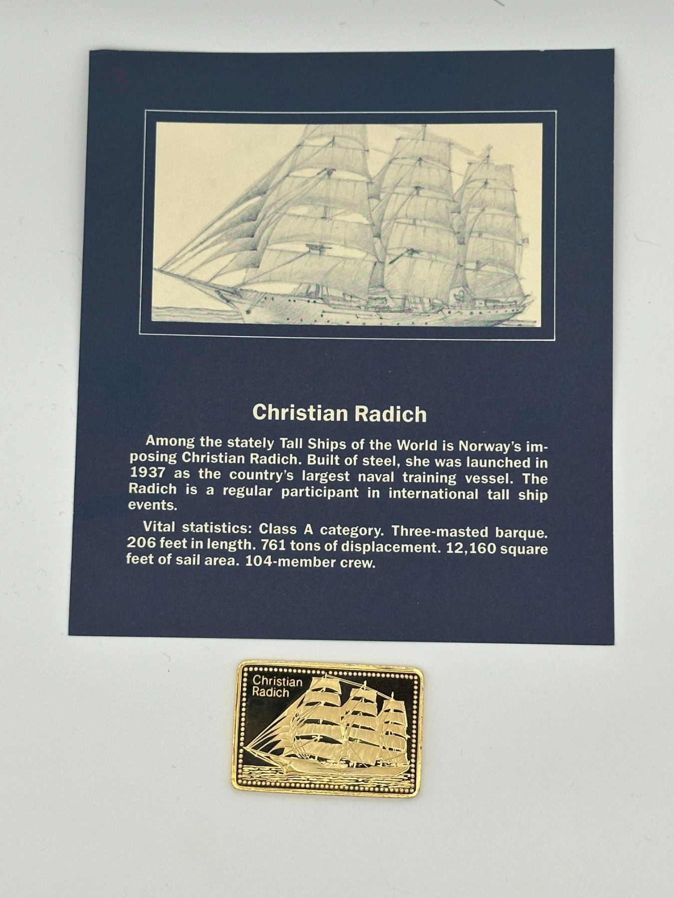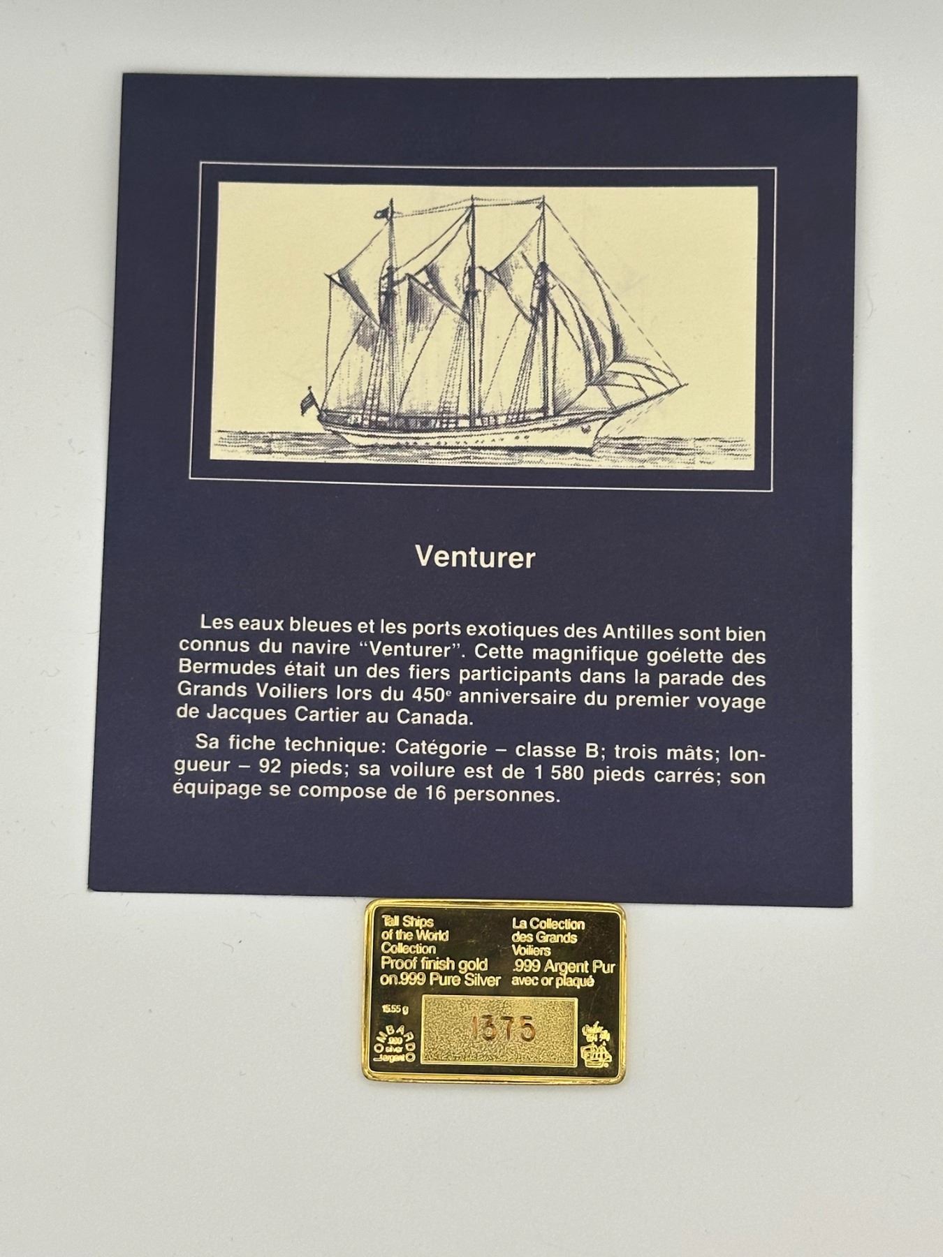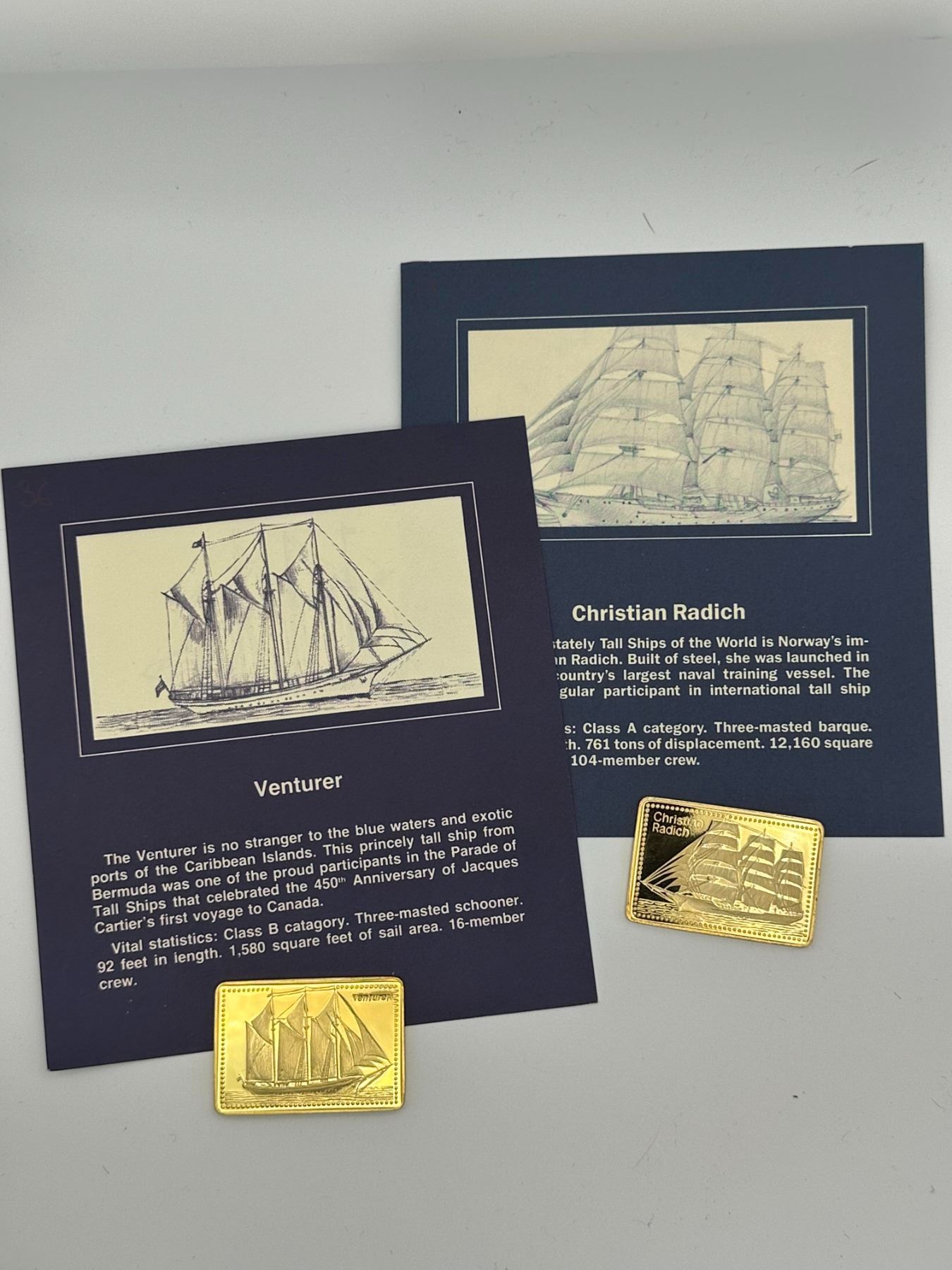 Set of two gold-plated .999 silver proof bars from the Tall Ships of the World collection featuring Venturer and Christian Radich. Each bar depicts detailed sailing ship designs and includes original display cards with historical descriptions.