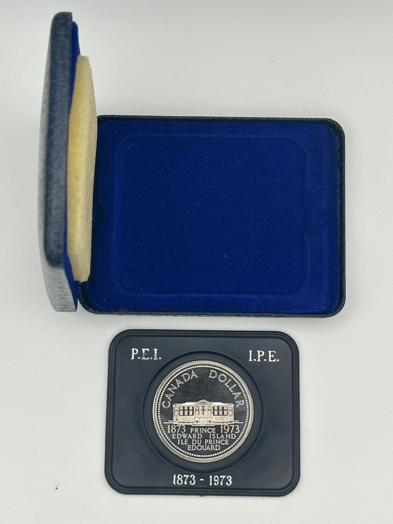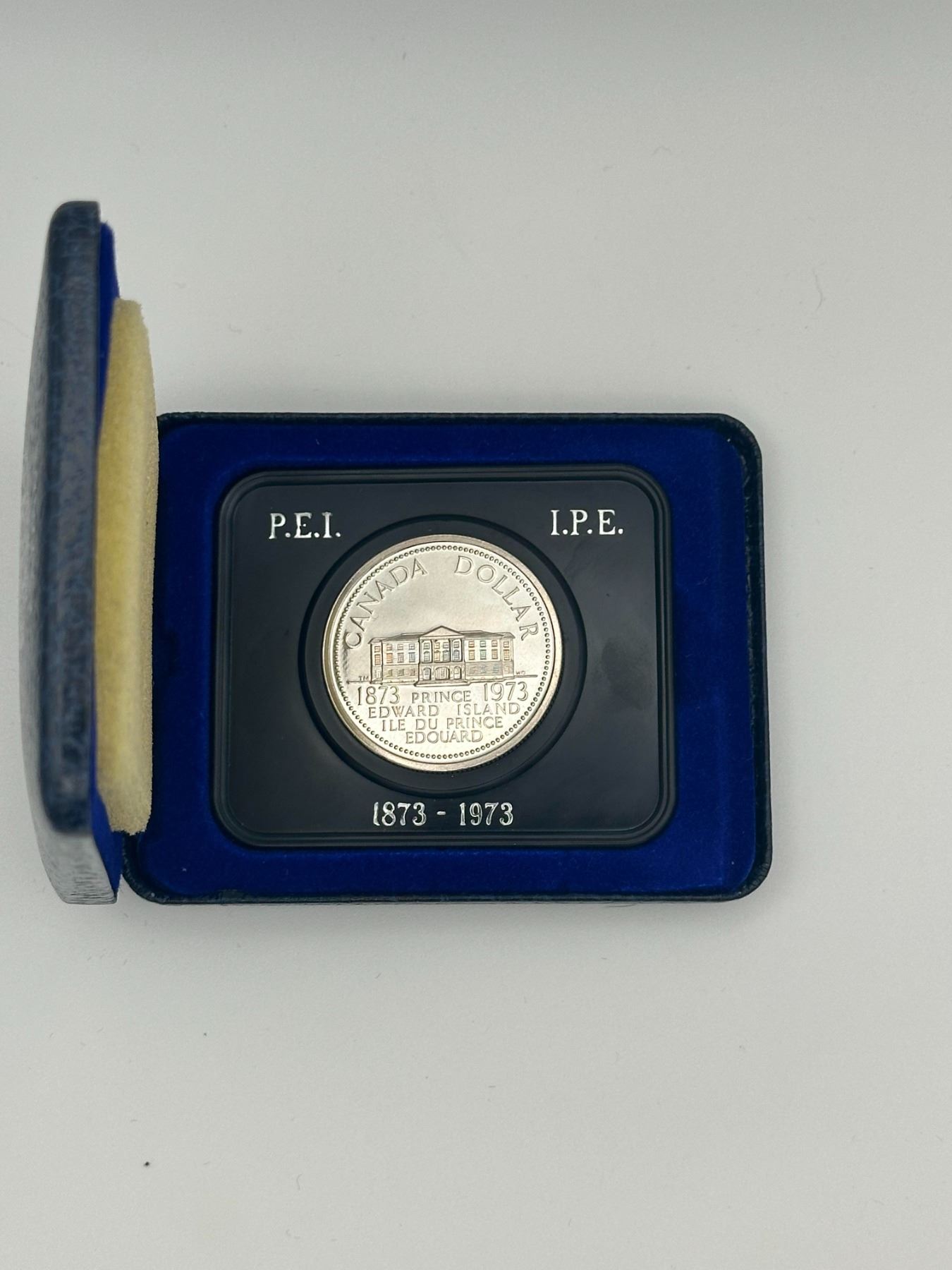 1973 Canadian silver dollar proof commemorating Prince Edward Island Centennial (1873–1973), featuring provincial building design. Housed in original Royal Canadian Mint case with fitted insert. Brilliant proof finish with mirrored fields.