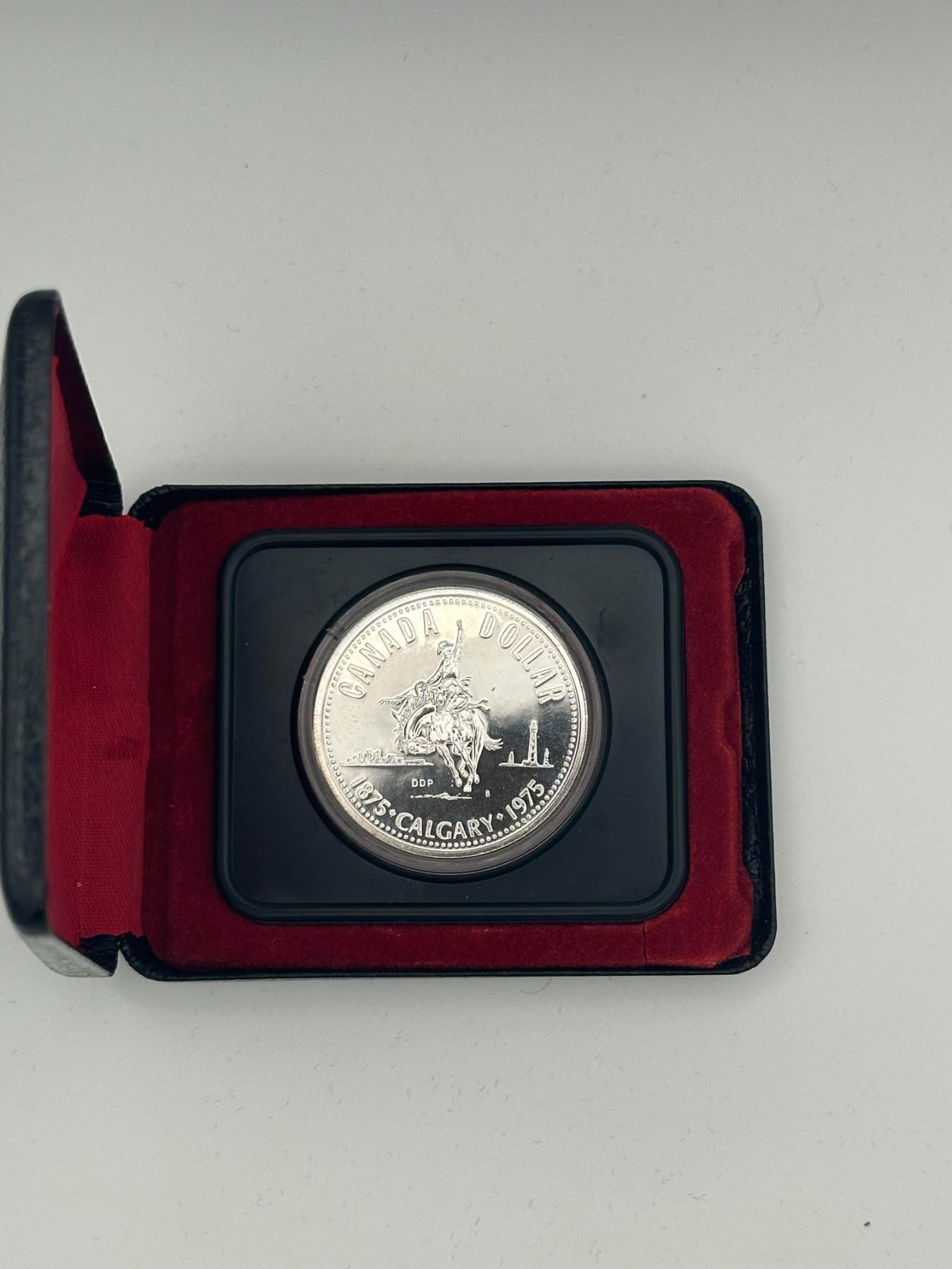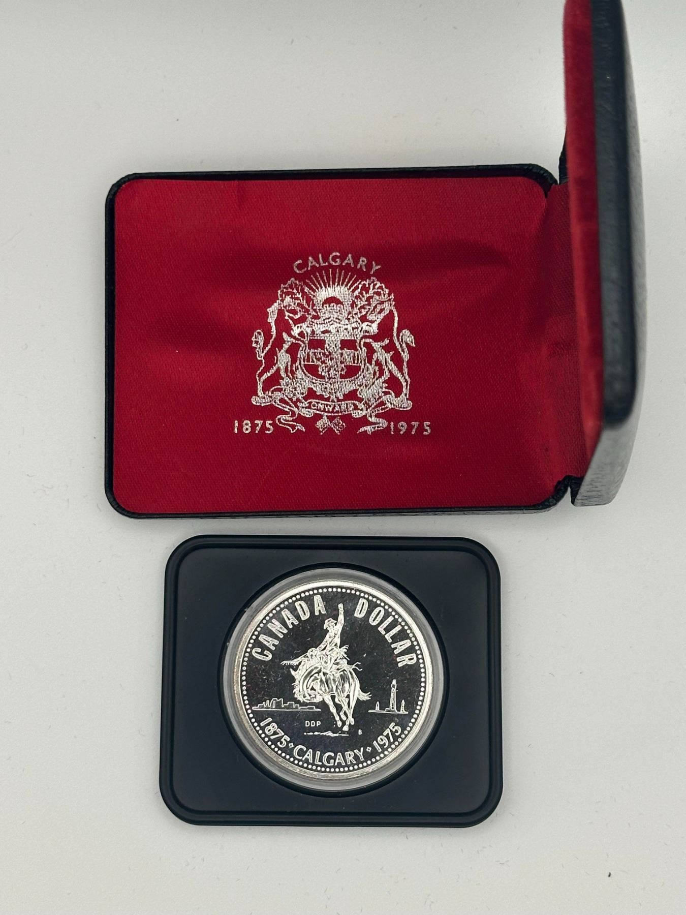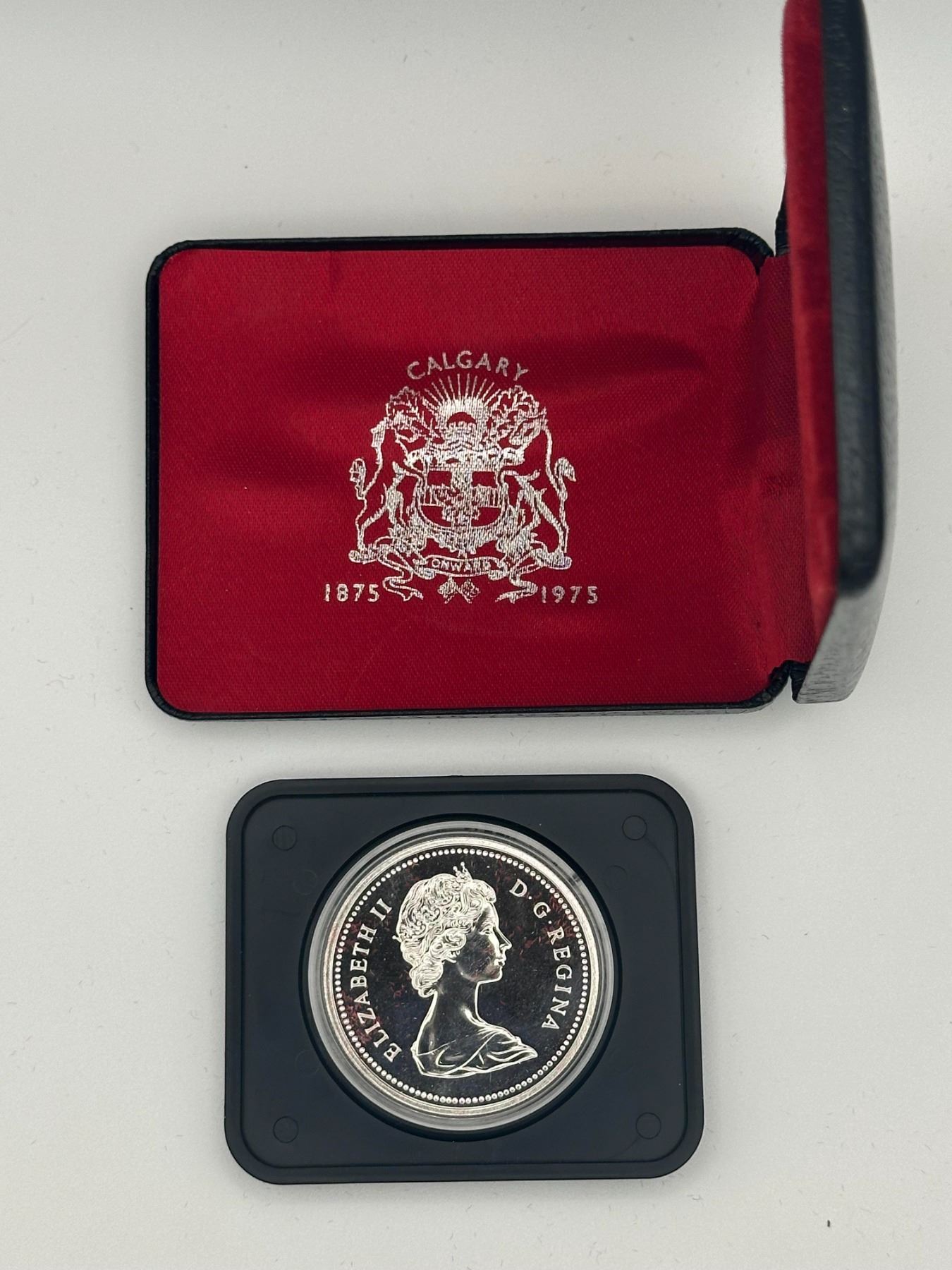 Calgary centennial commemorative silver dollar, 1875-1975, in original case, proof-like finish.