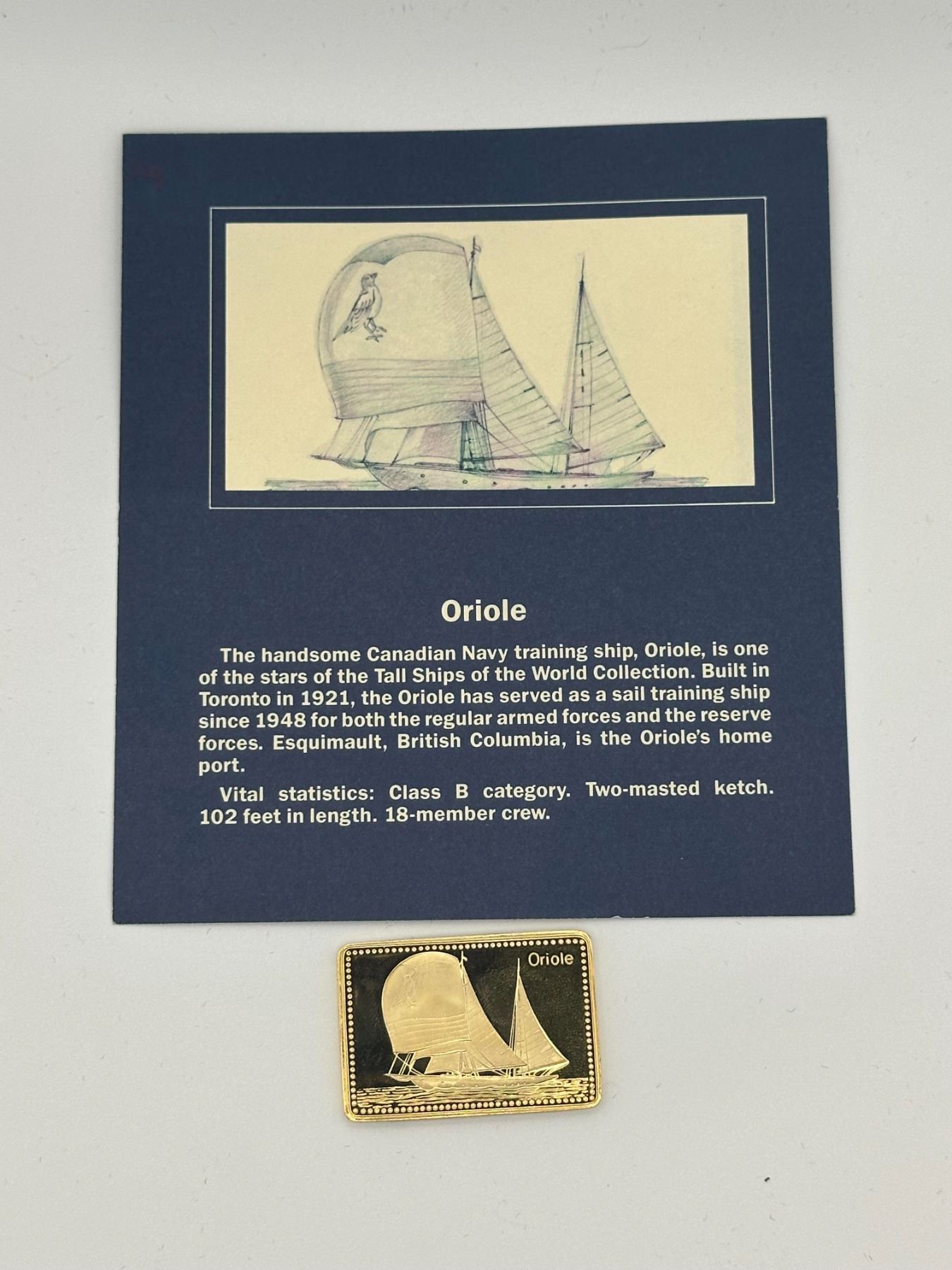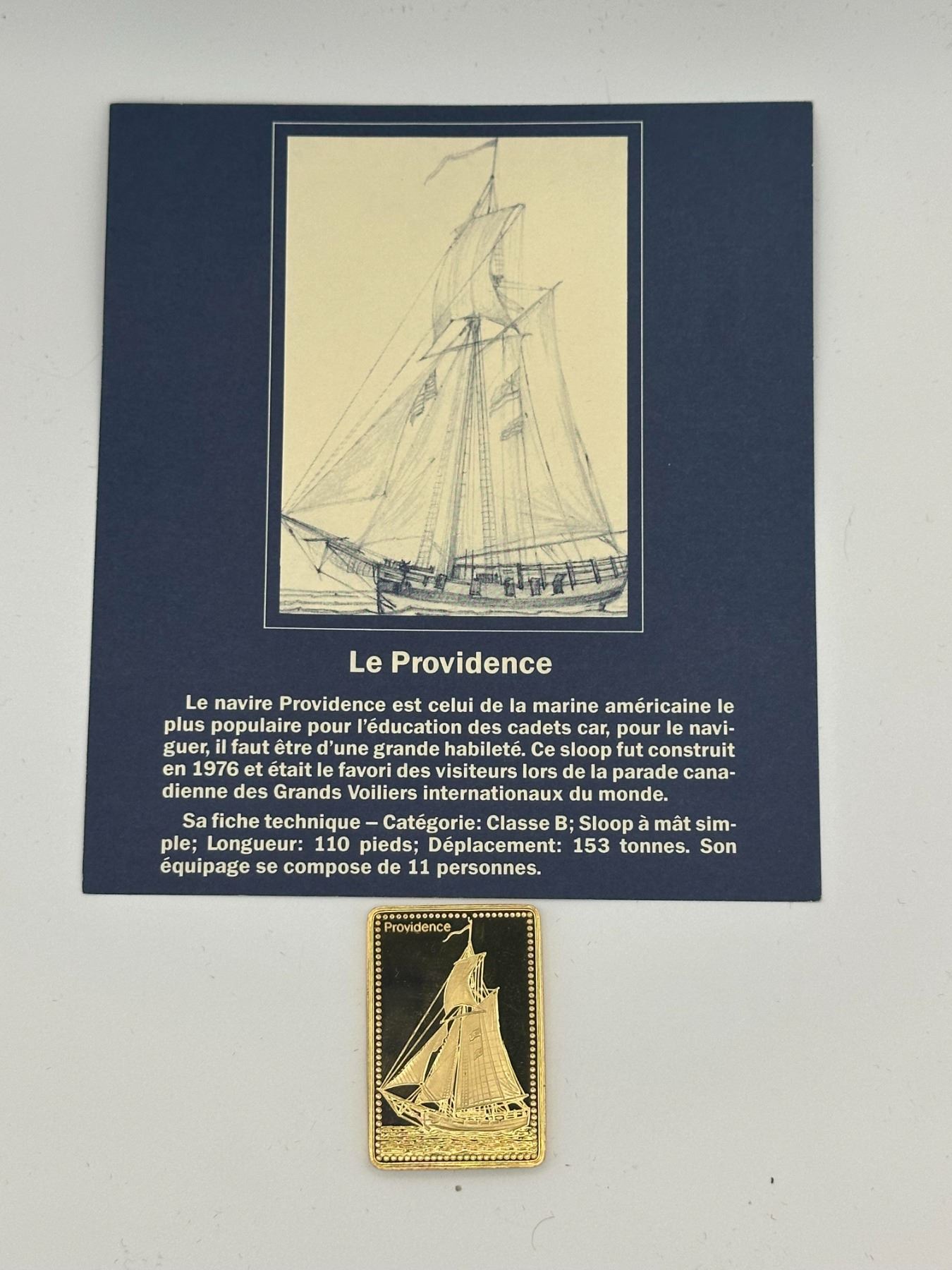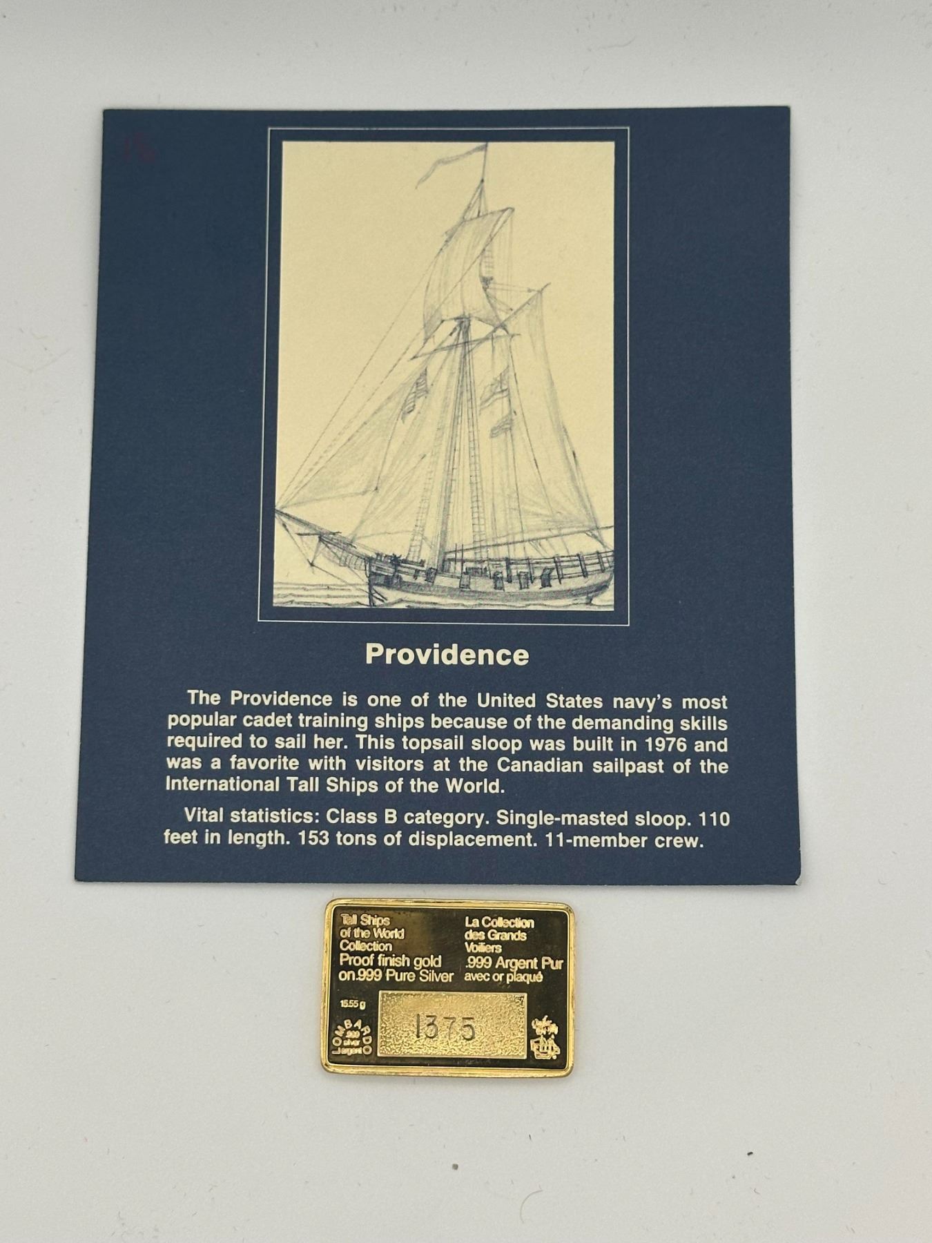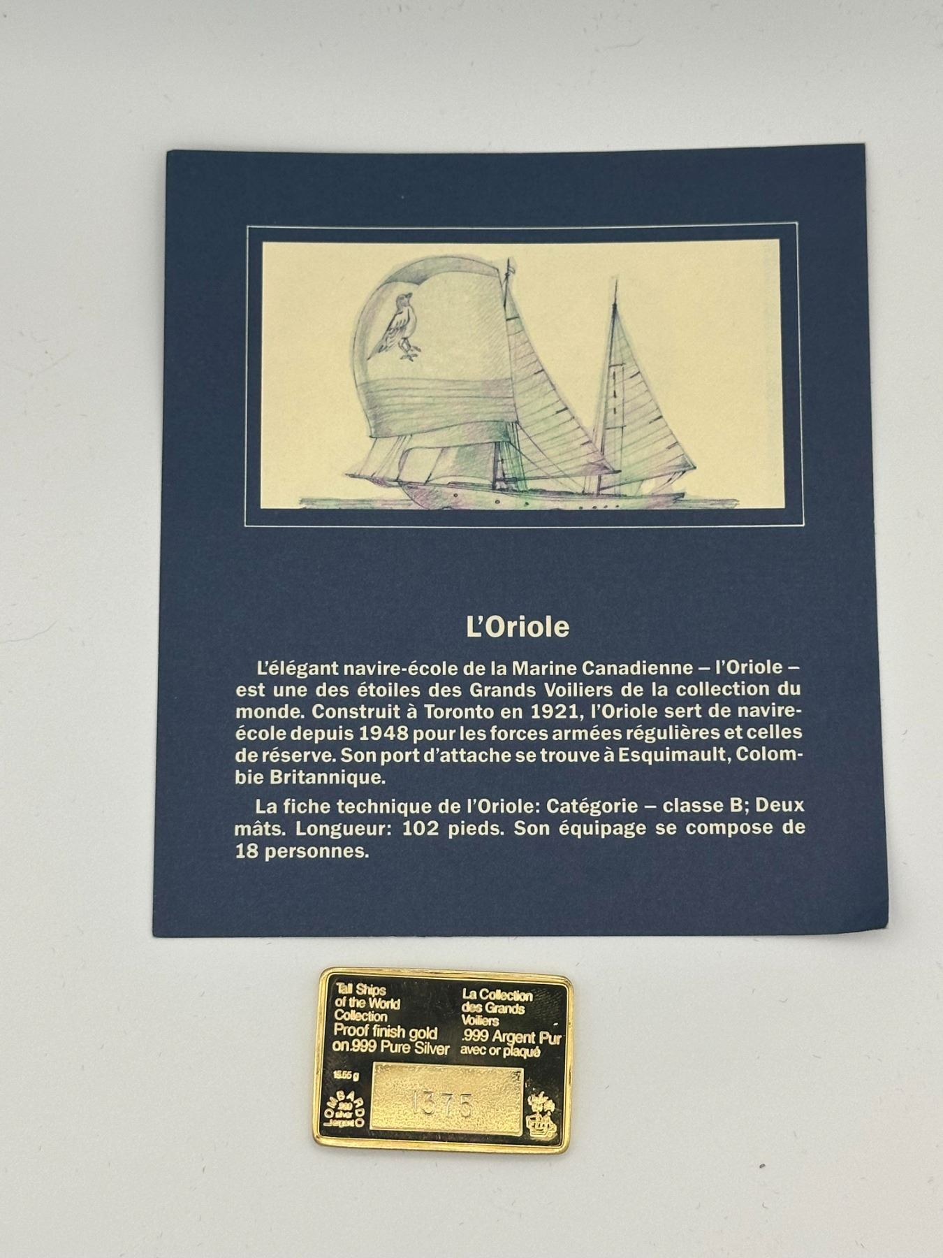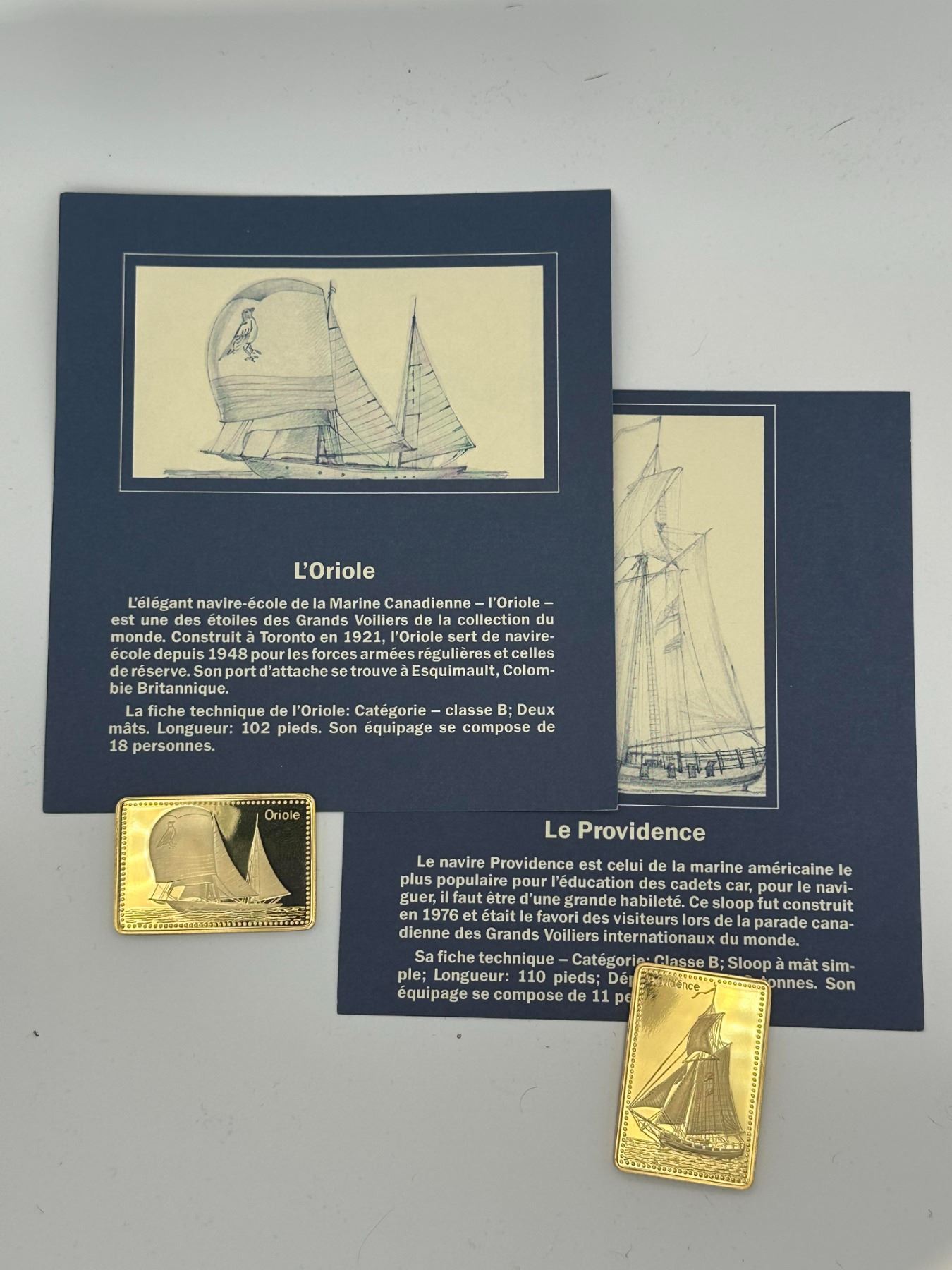 Pair of .999 silver proof Tall Ships bars, gold-plated, featuring L’Oriole and Le Providence.