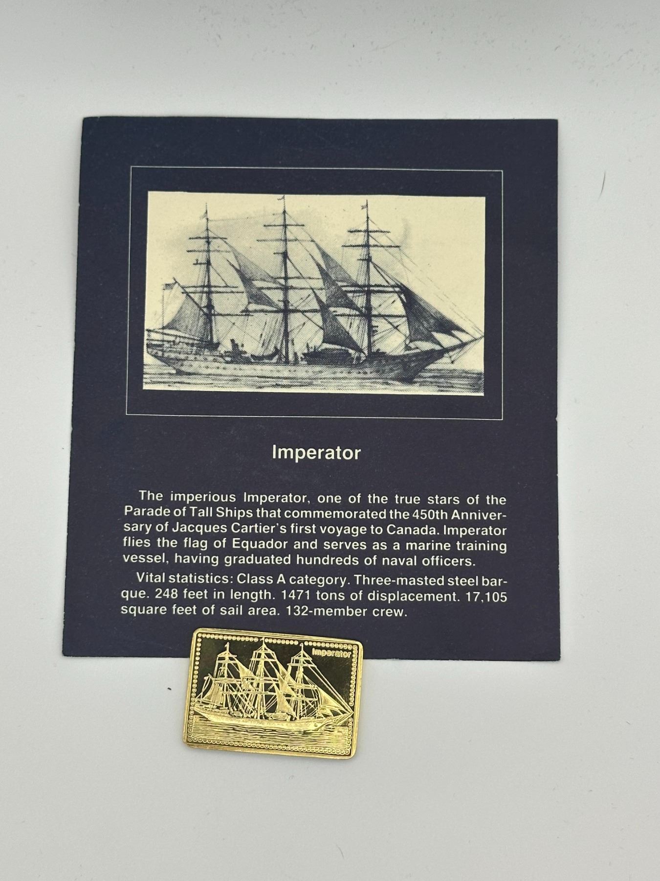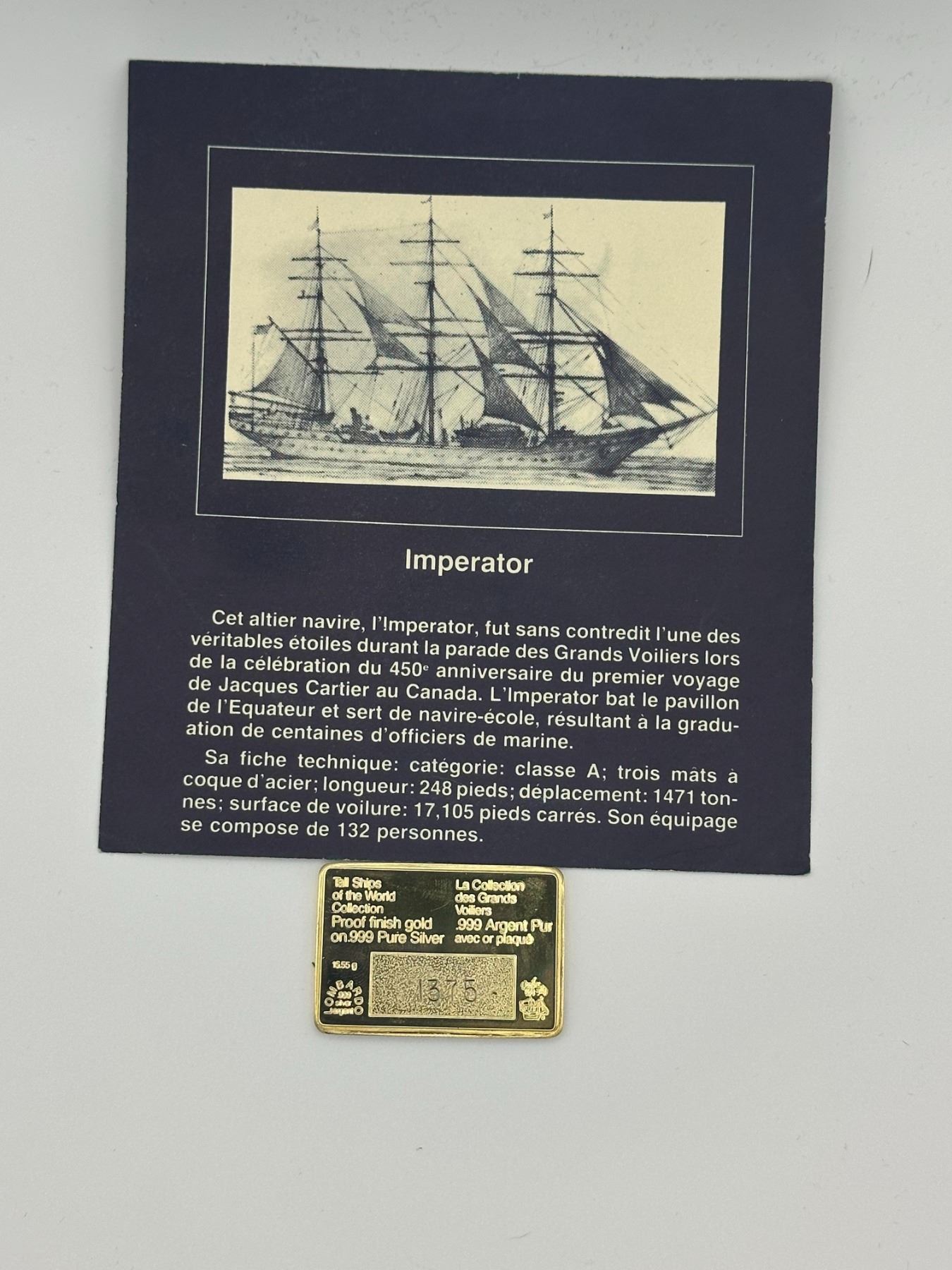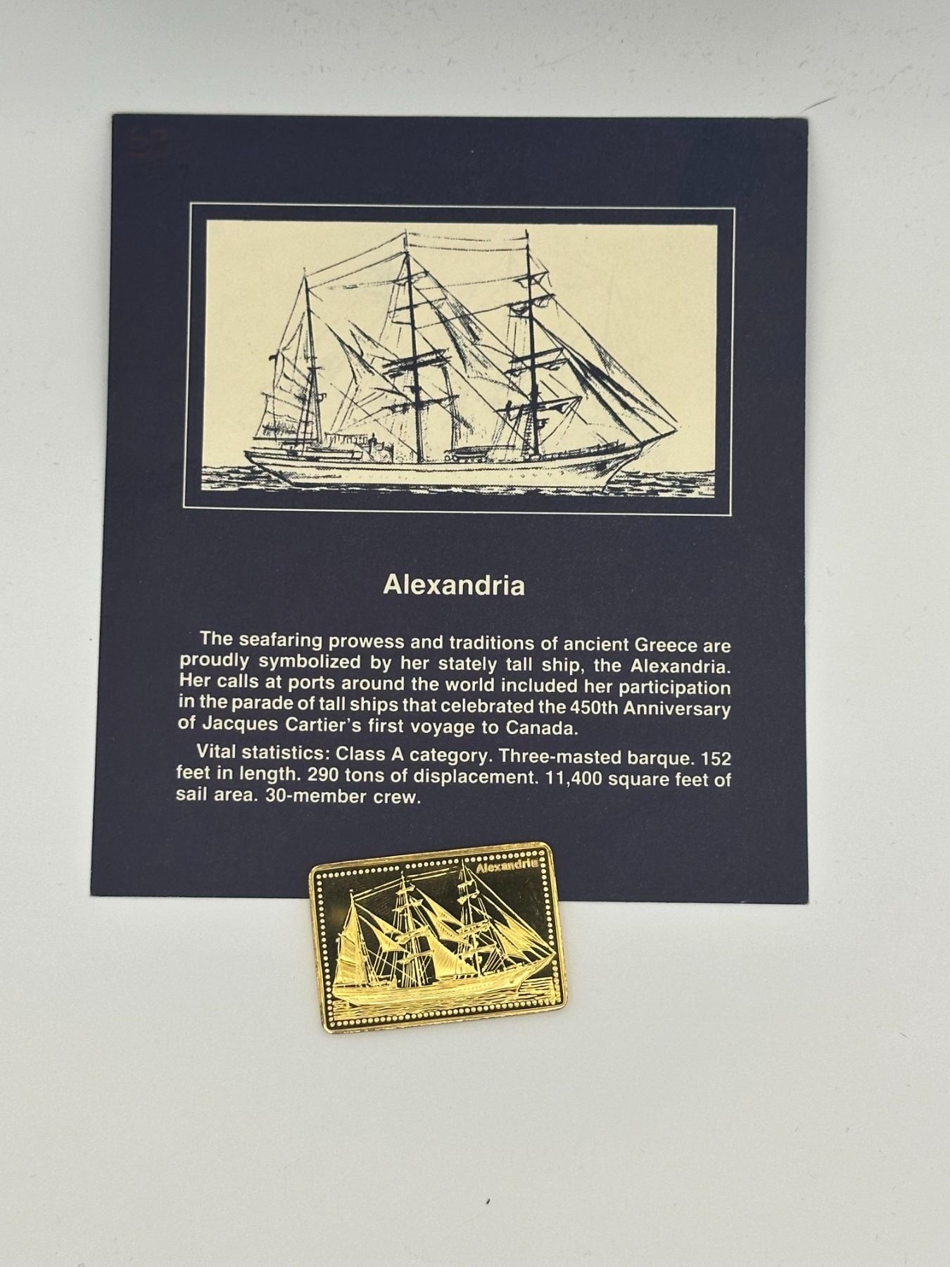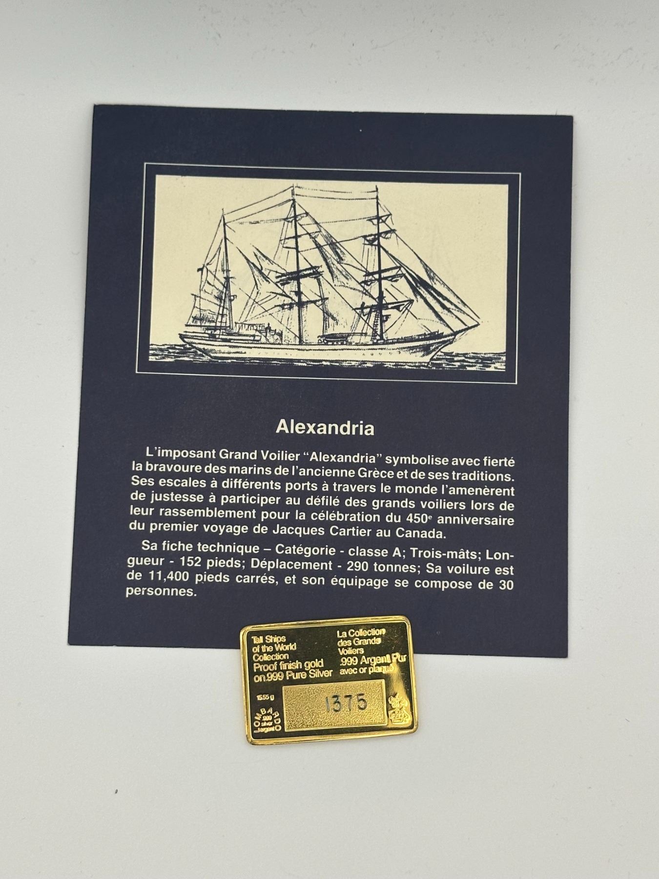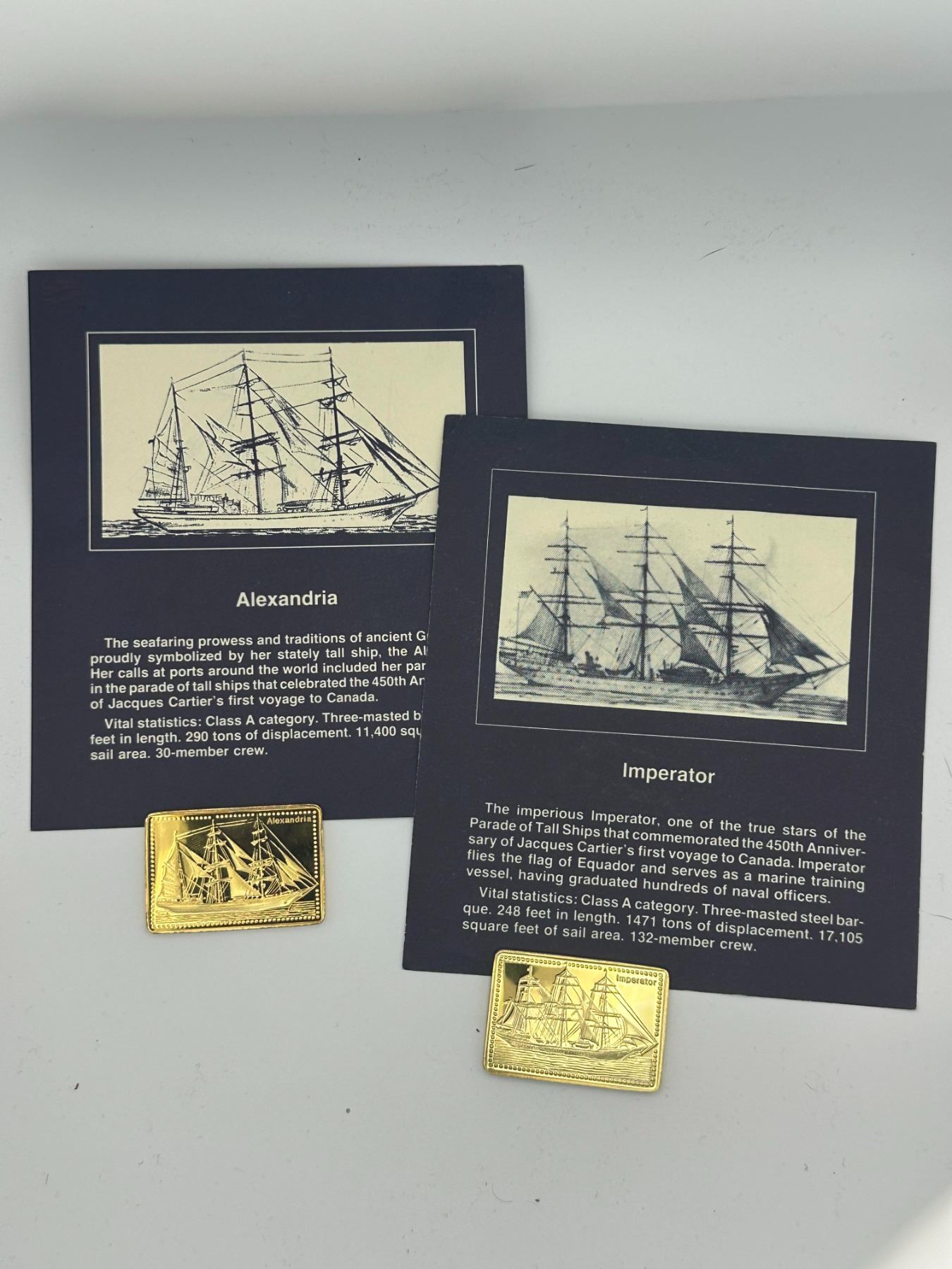 Pair of .999 silver proof Tall Ships bars, gold-plated, featuring Alexandria and Imperator.