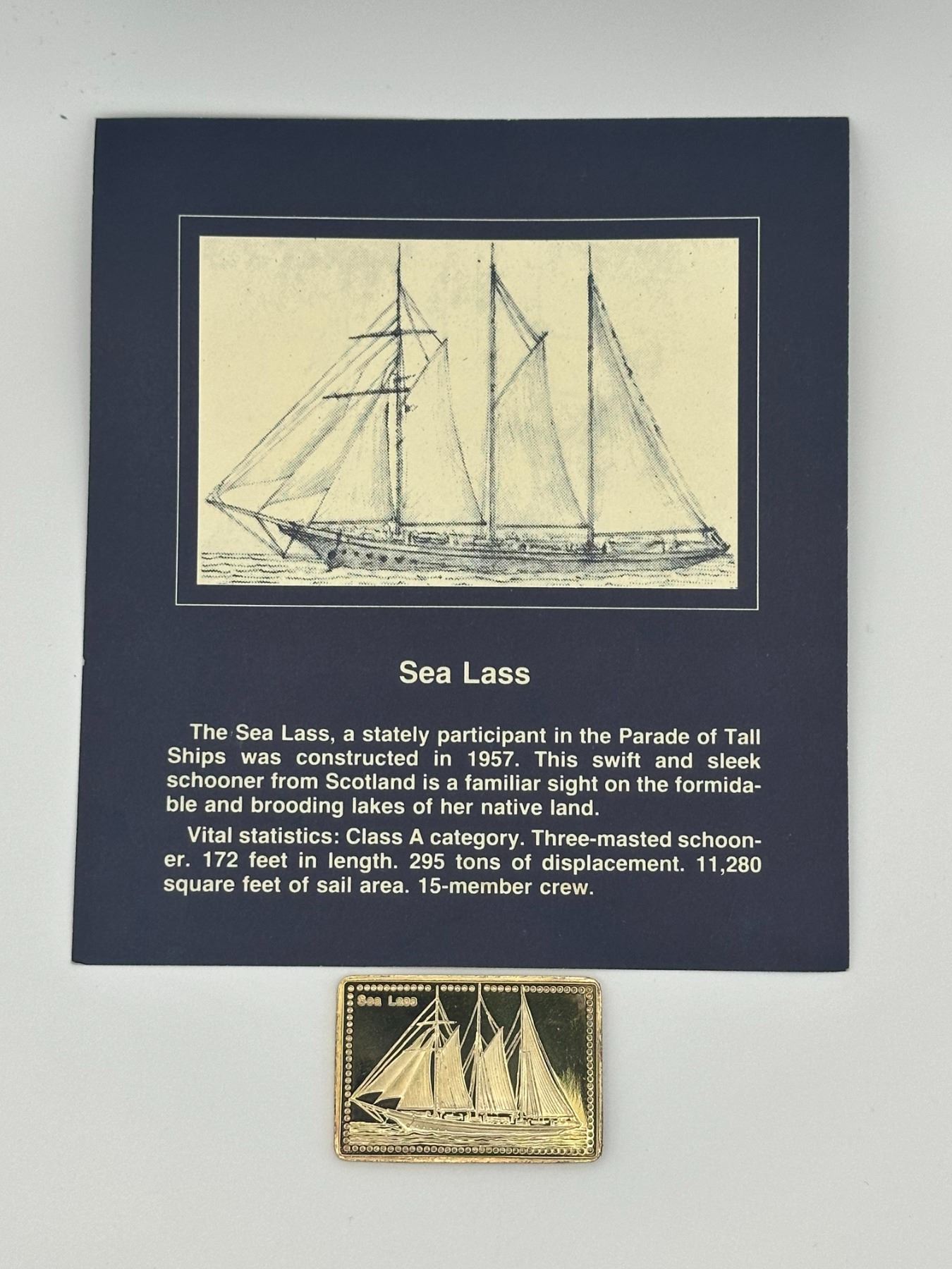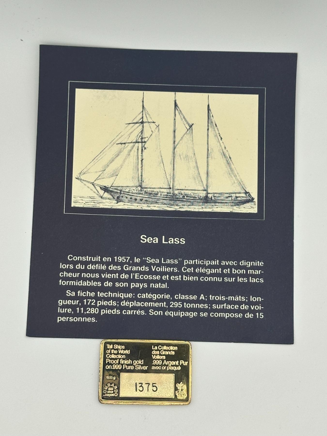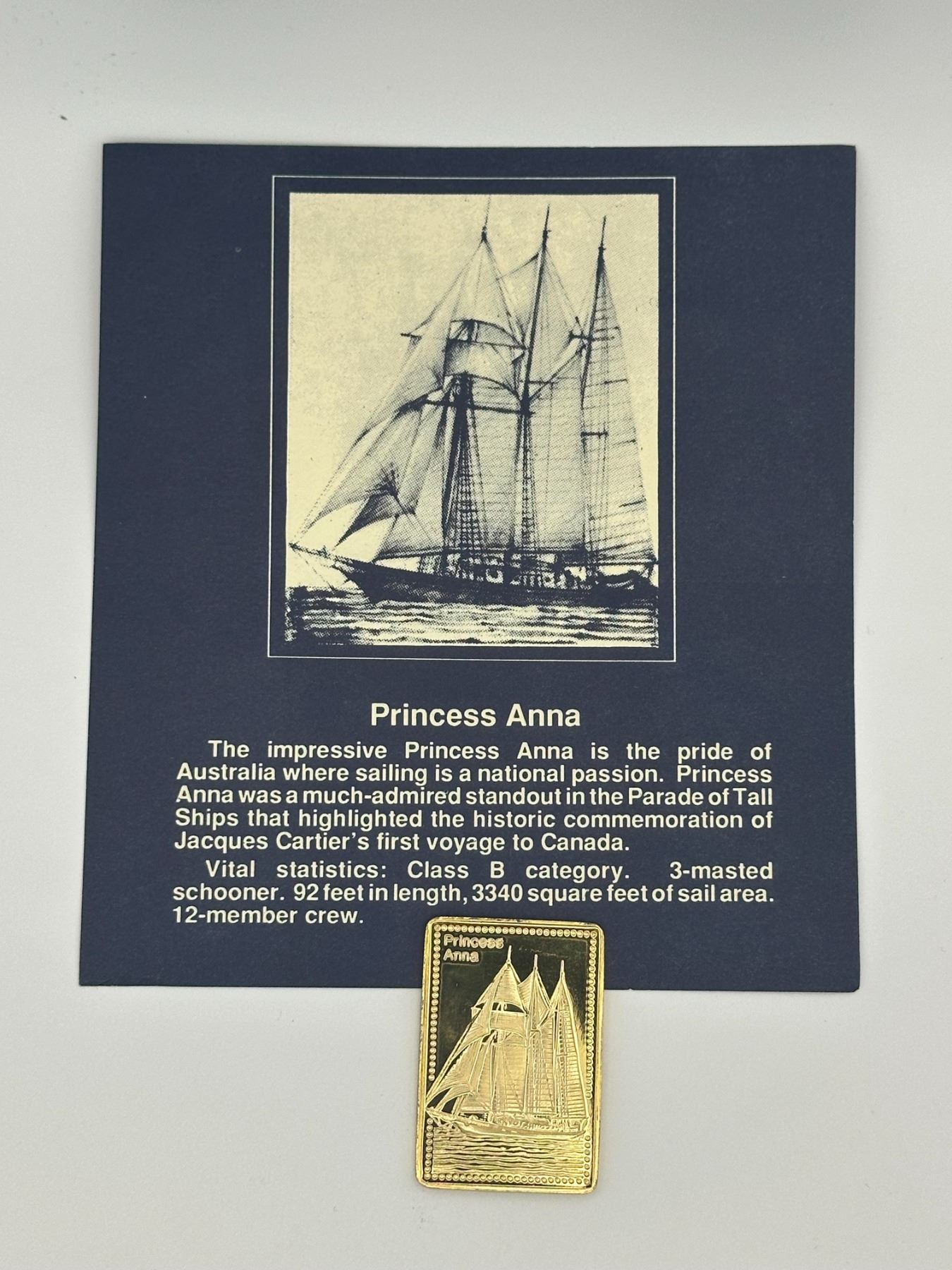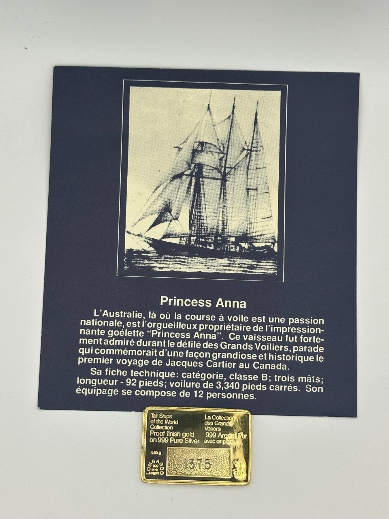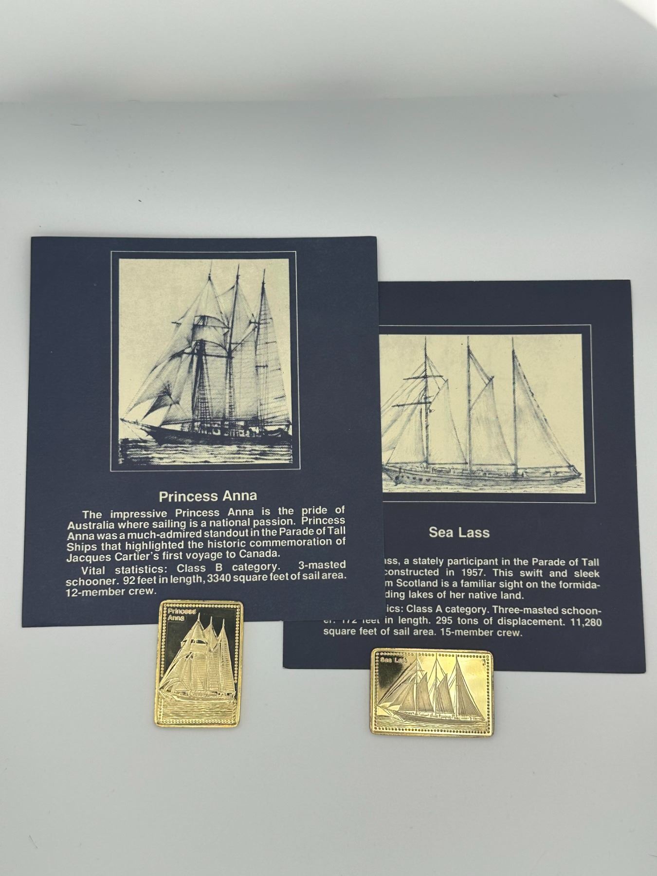 Set of two gold-plated .999 silver proof bars from the Tall Ships of the World collection featuring Princess Anna and Sea Lass. Each bar depicts detailed sailing ship designs and includes original display cards with historical descriptions.