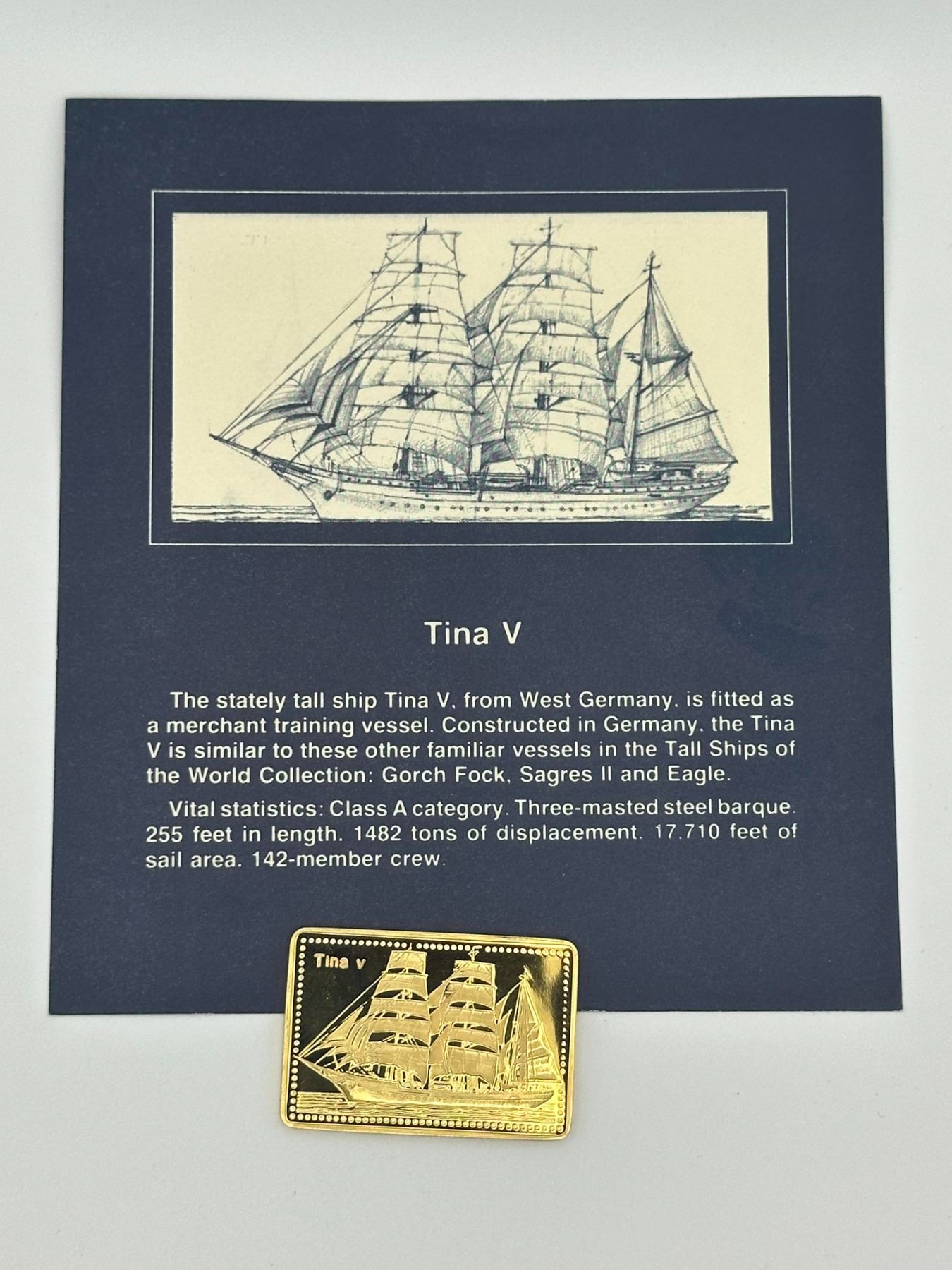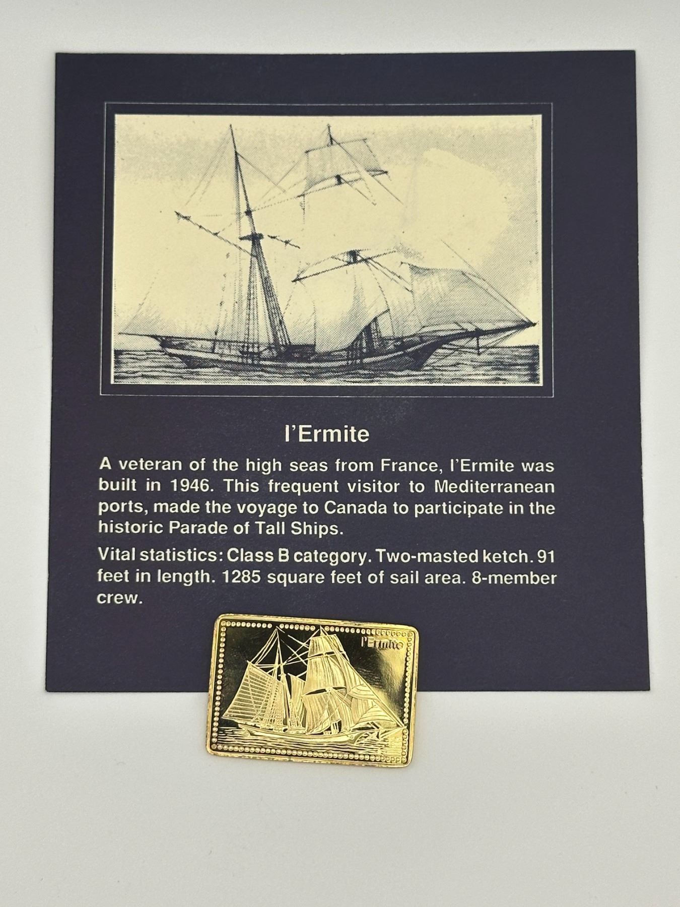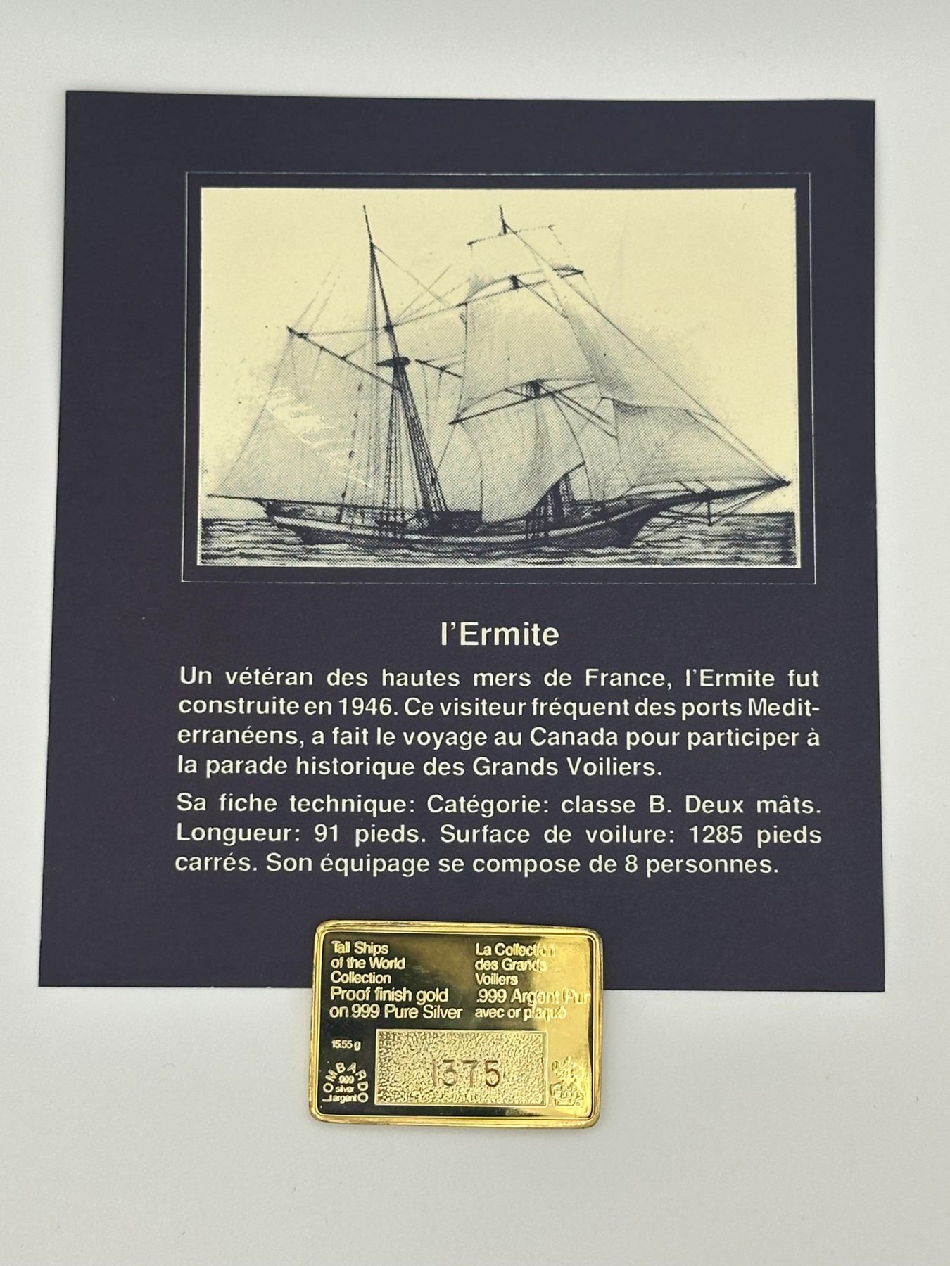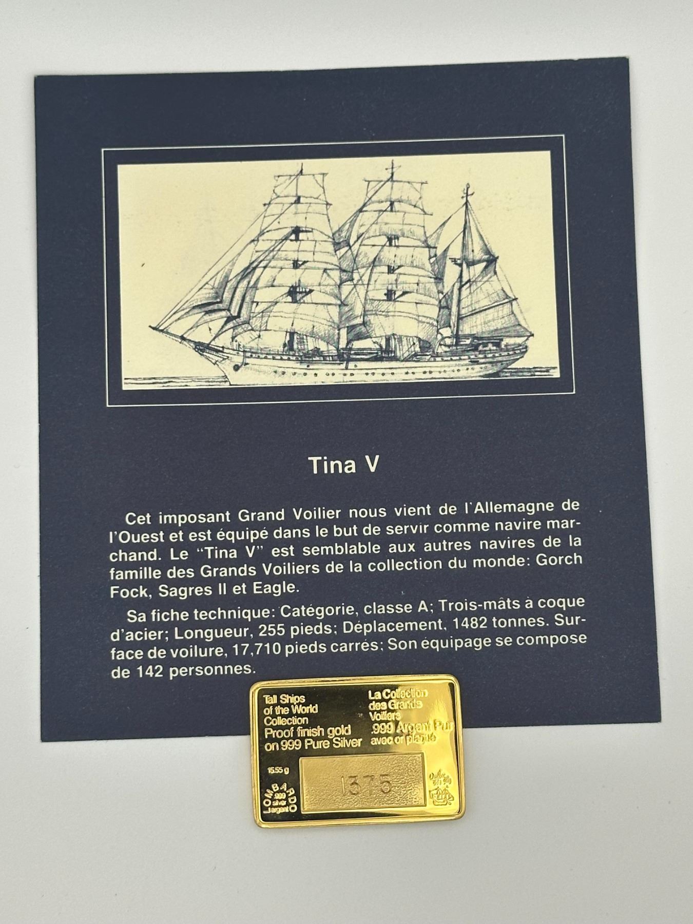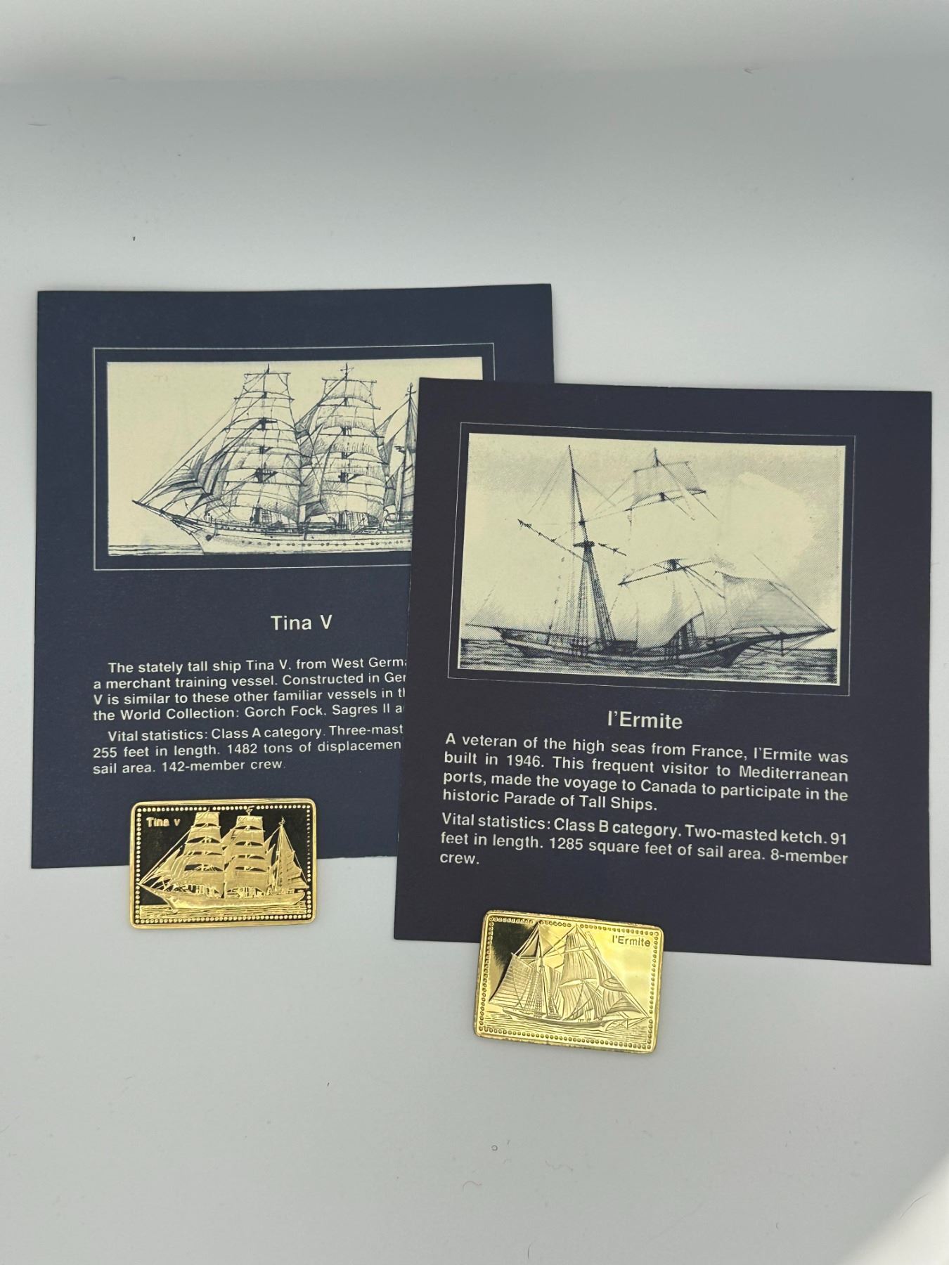 Set of two gold-plated .999 silver proof bars from the Tall Ships of the World collection featuring Tina V and L’Ermite. Each bar depicts detailed sailing ship designs and includes original display cards with historical descriptions.