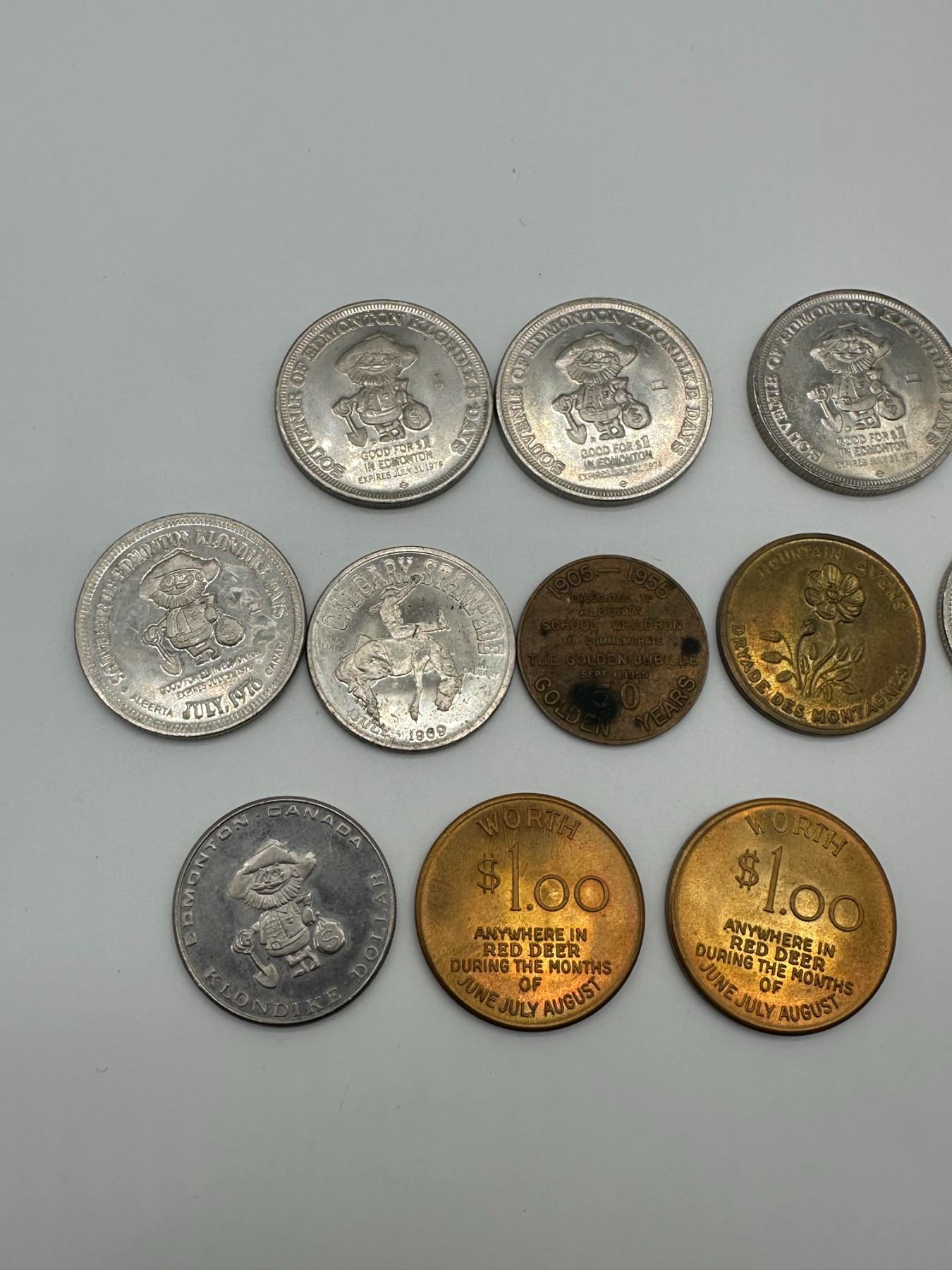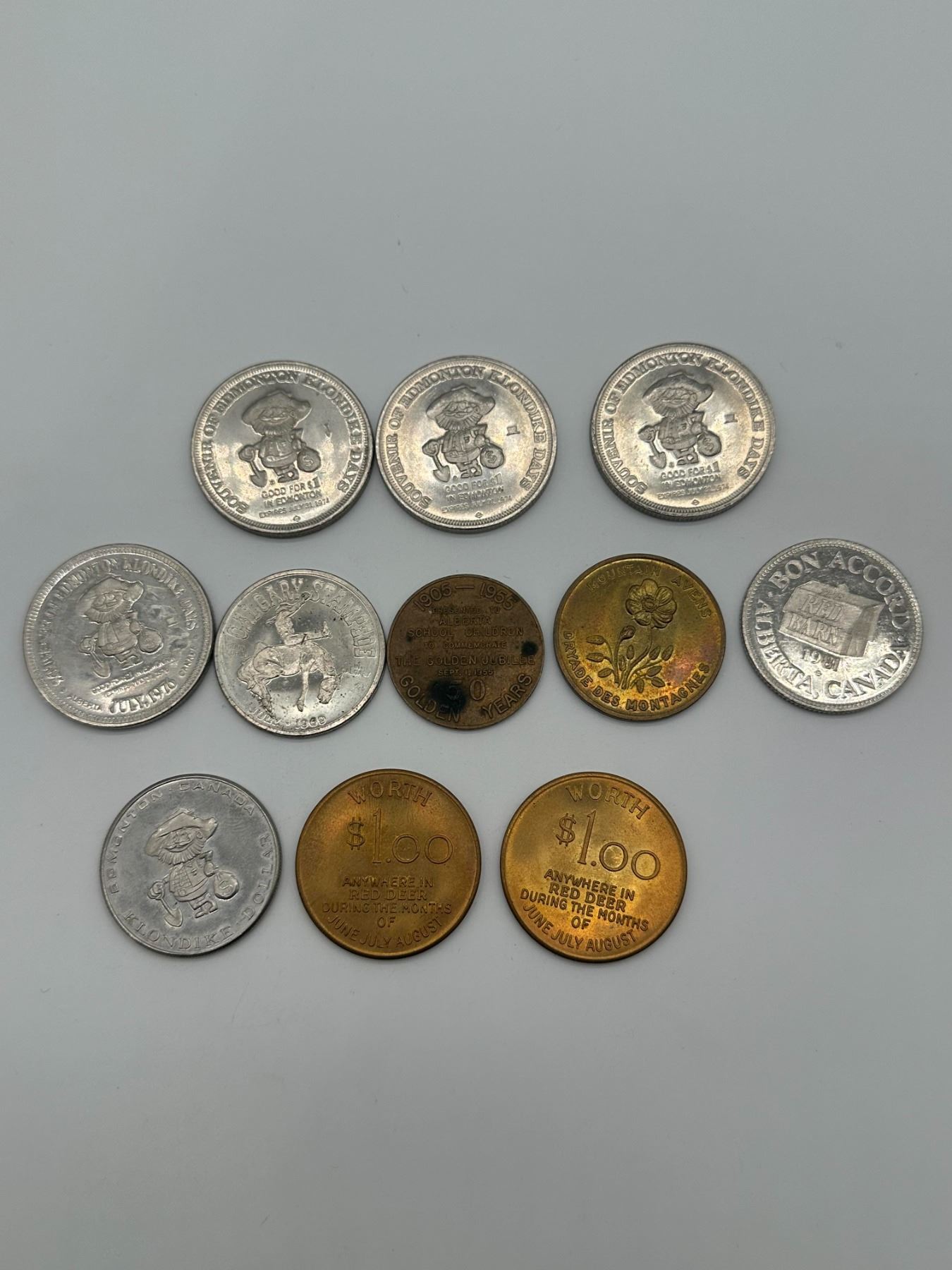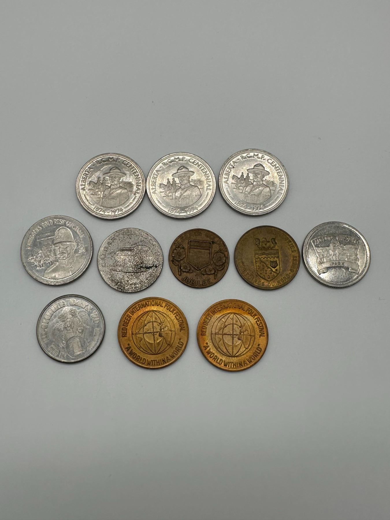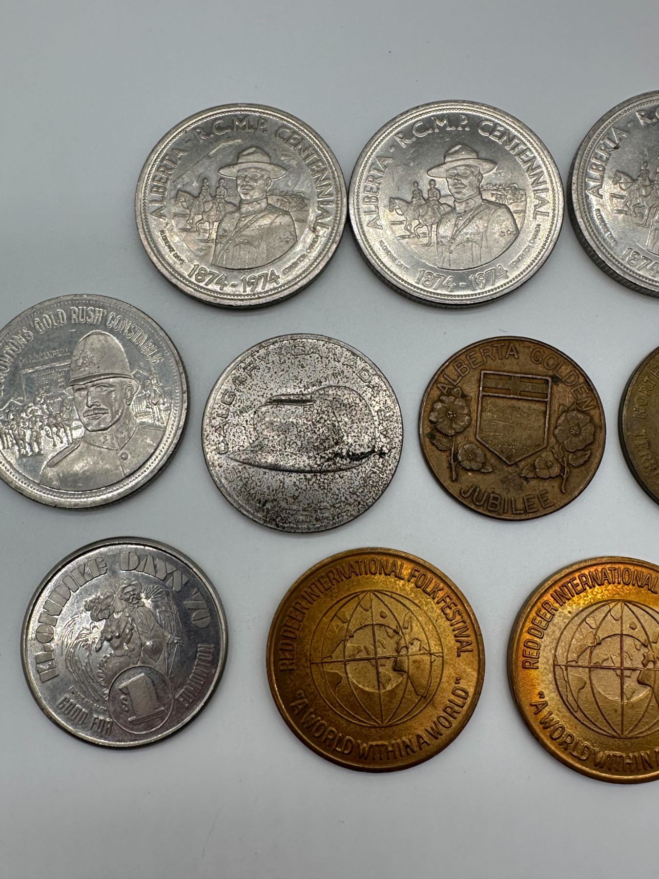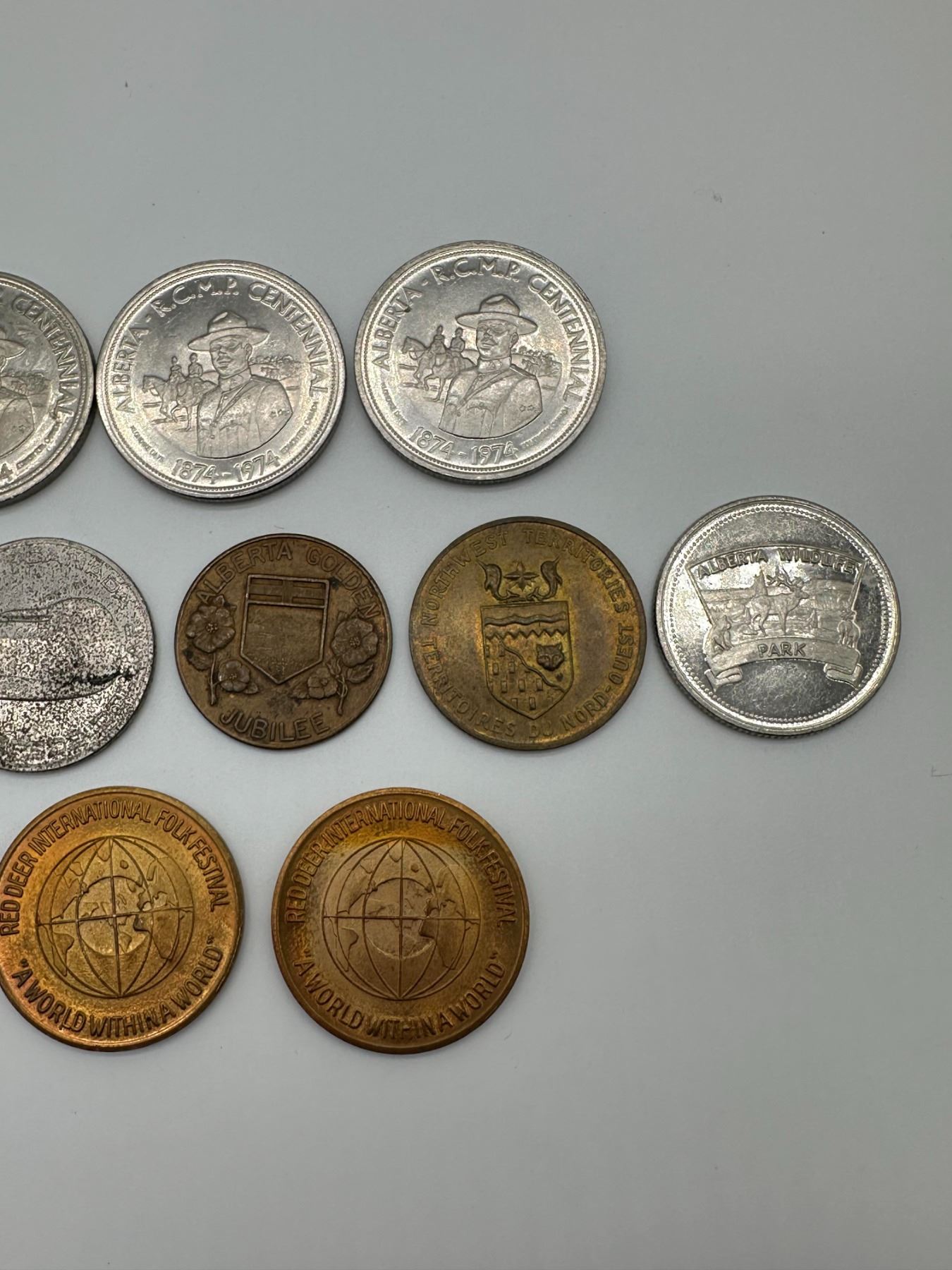Collection of assorted Canadian commemorative medals and tokens including Alberta RCMP Centennial (1874–1974), Alberta Golden Jubilee, Red Deer International Folk Festival pieces, and other regional issues. Mixed metals and conditions.