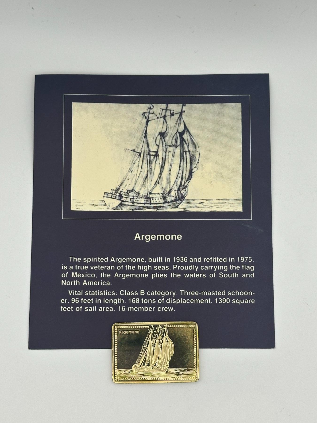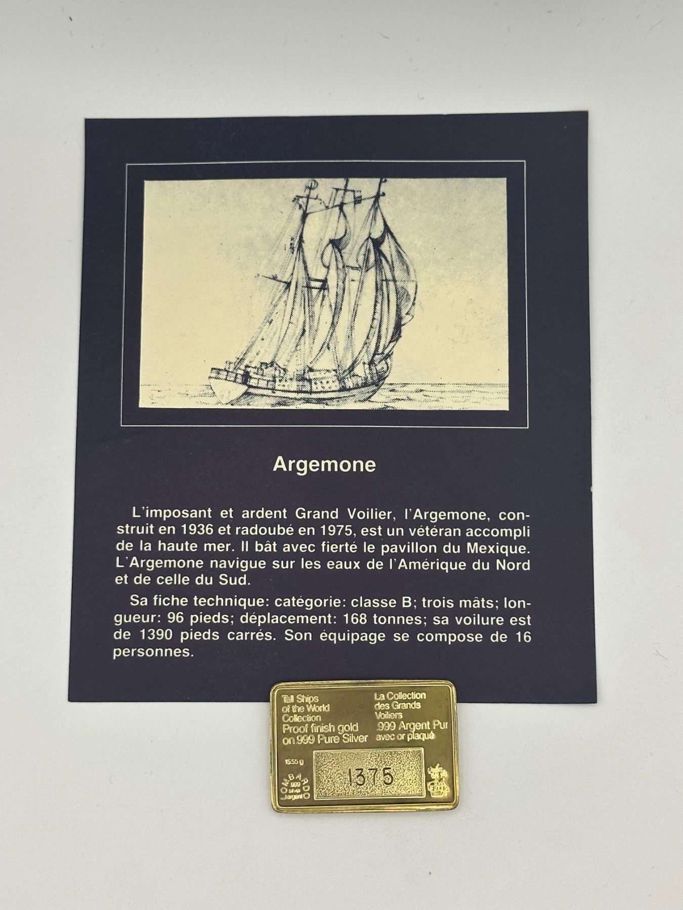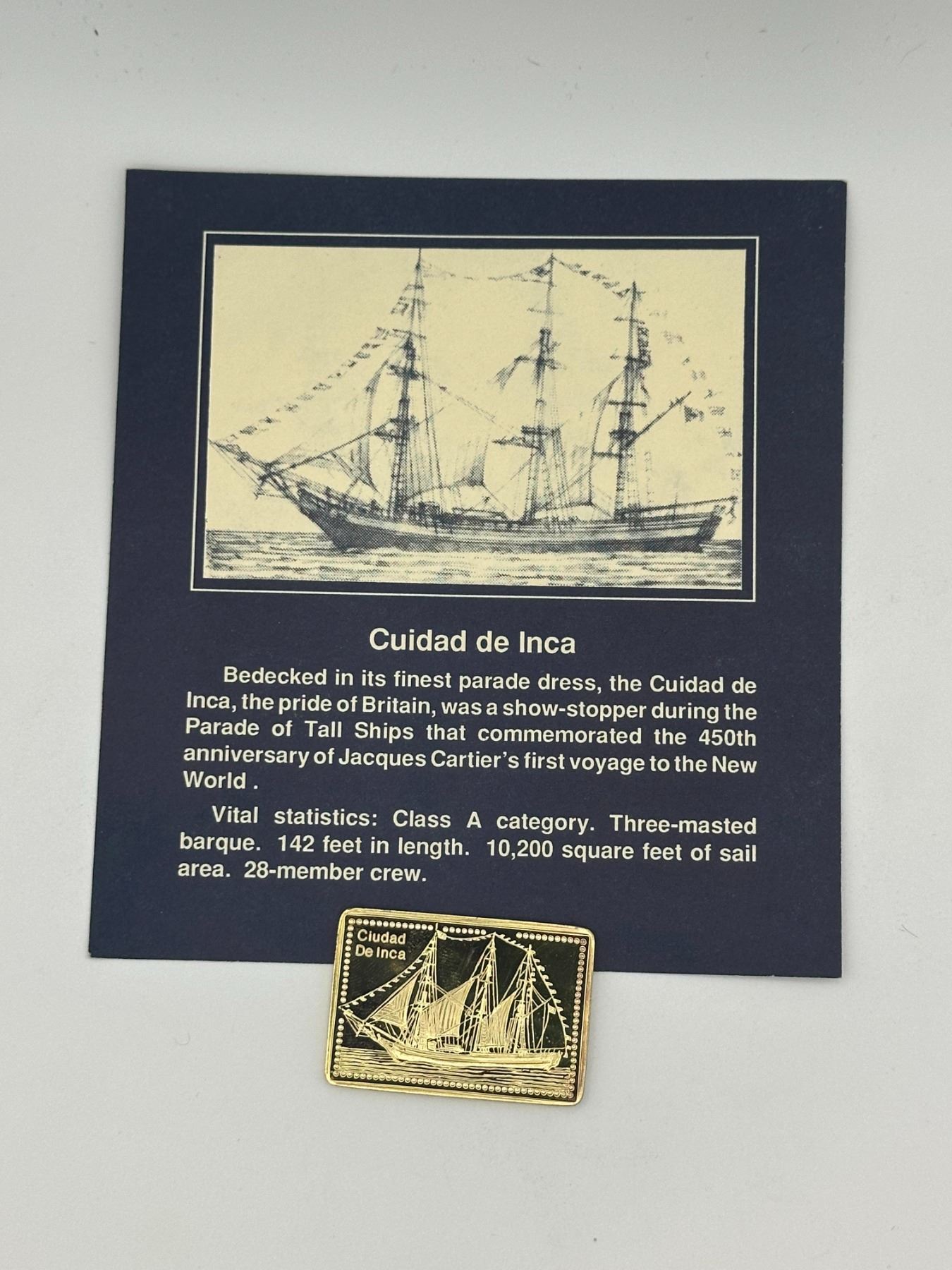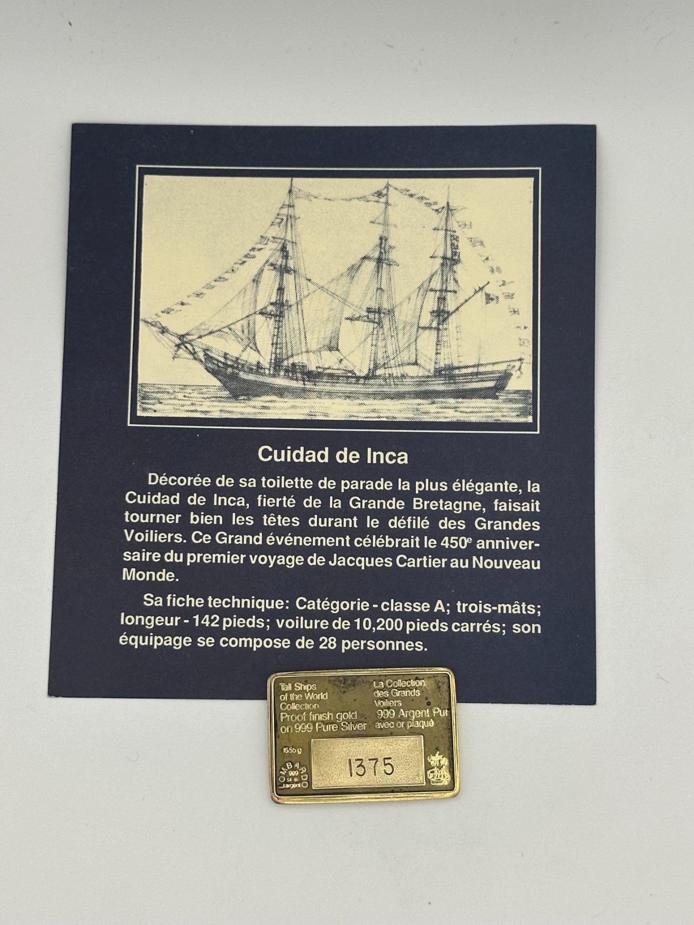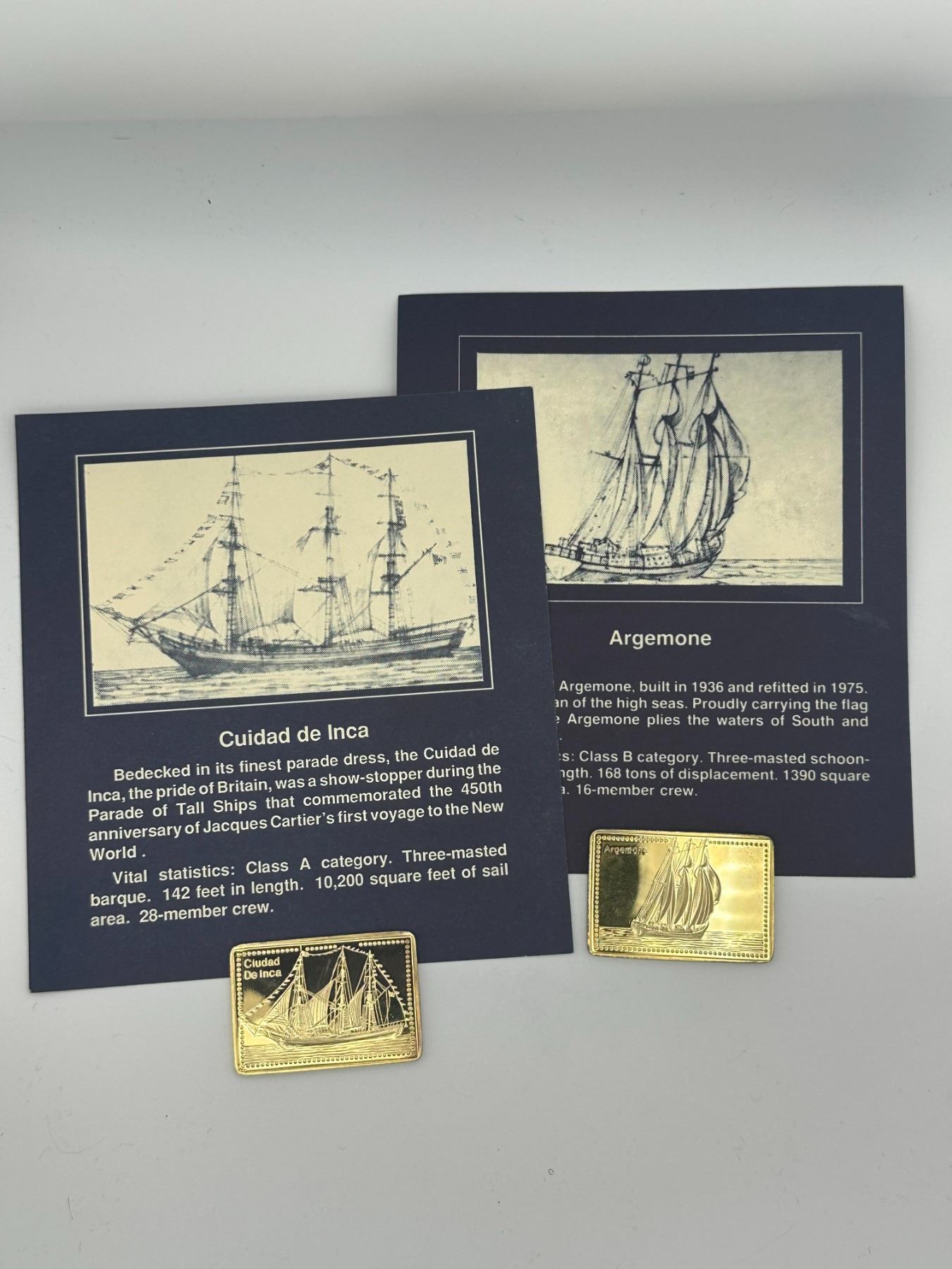 Set of two gold-plated .999 silver proof bars from the Tall Ships of the World collection featuring Ciudad de Inca and Argemone (built 1936). Each bar depicts detailed sailing ship designs and includes original display cards with historical descriptions.