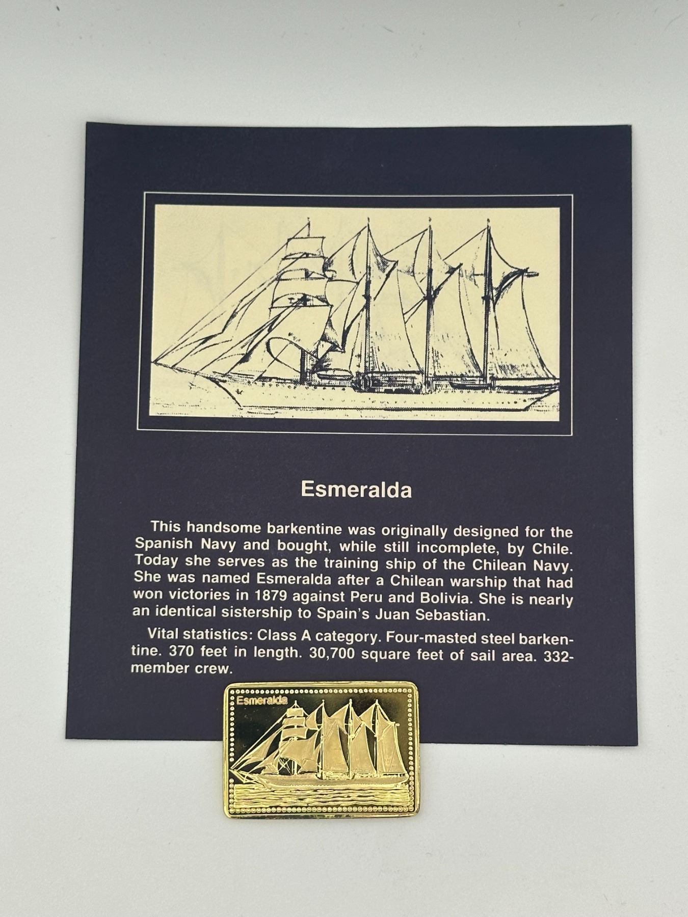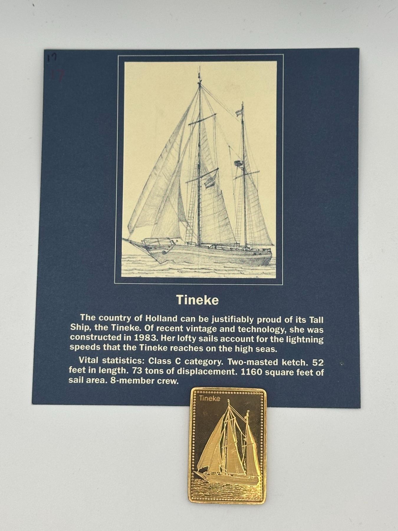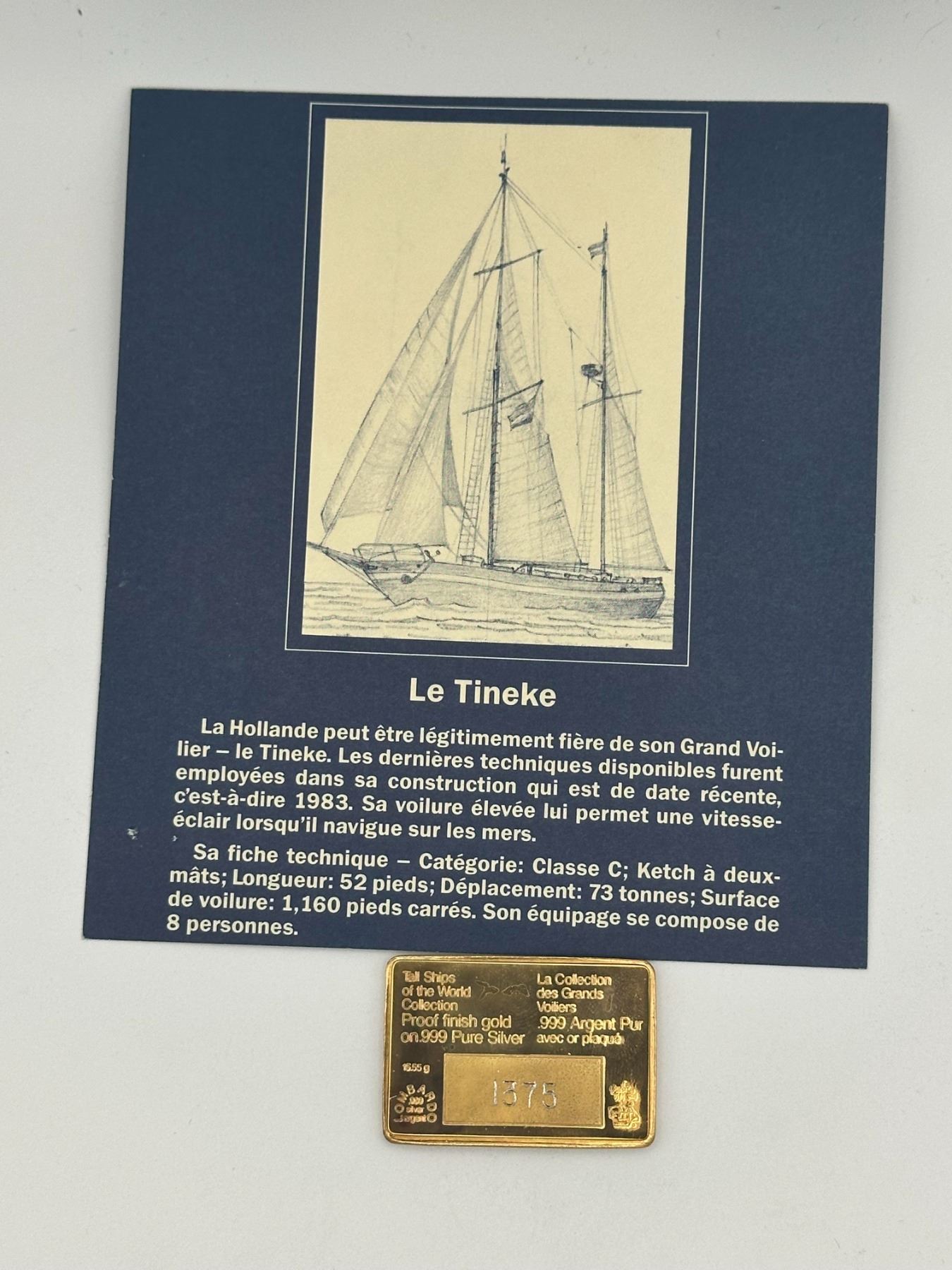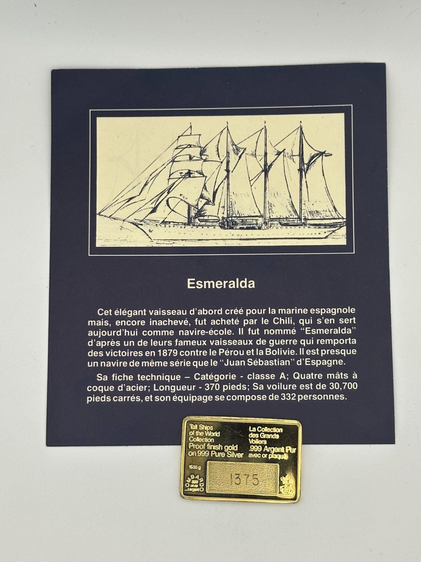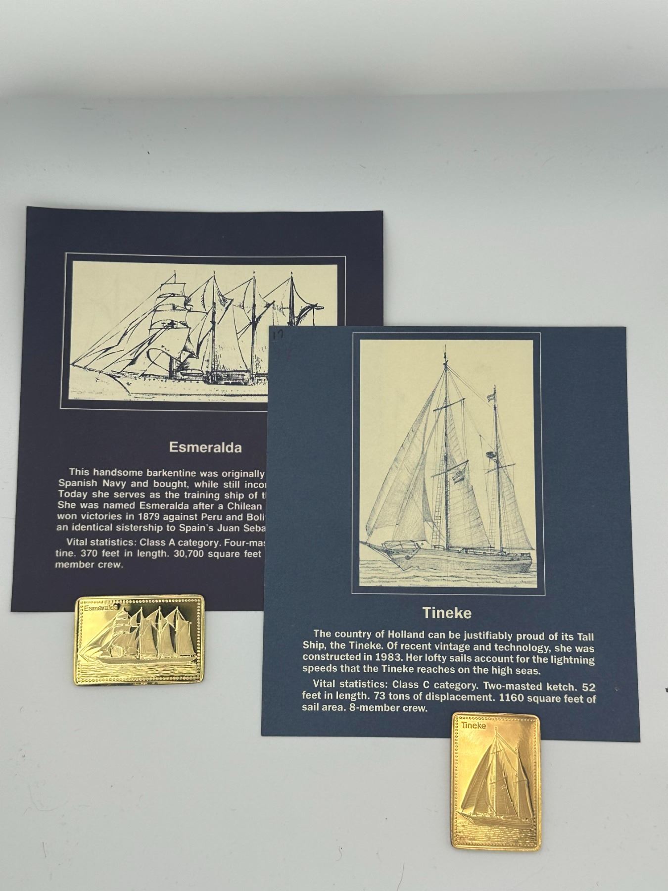 Set of two gold-plated .999 silver proof bars from the Tall Ships of the World collection featuring Esmeralda and Tineke (built 1983). Each bar depicts detailed sailing ship designs and includes original display cards with historical descriptions.