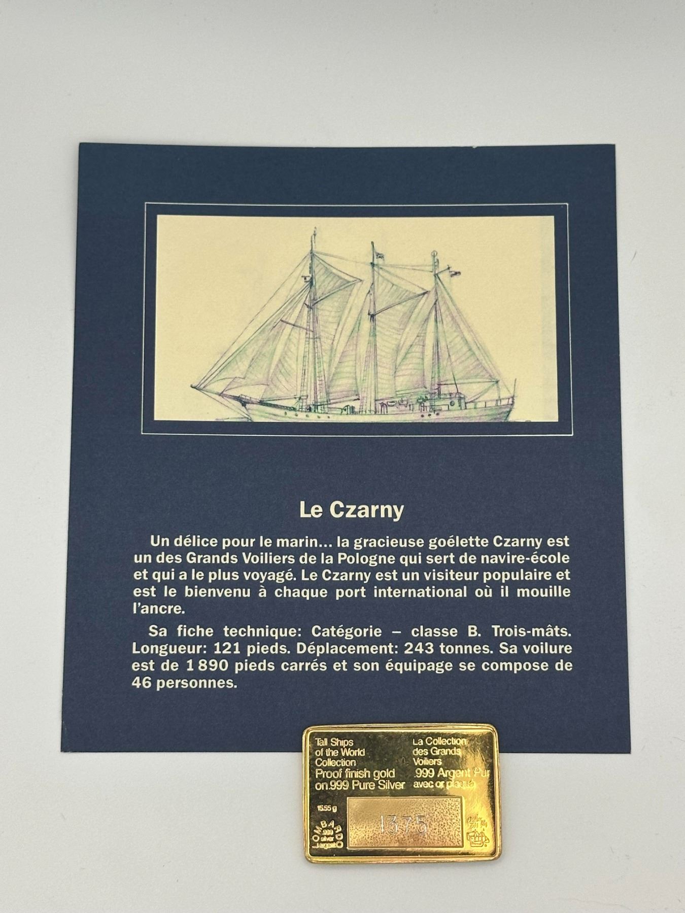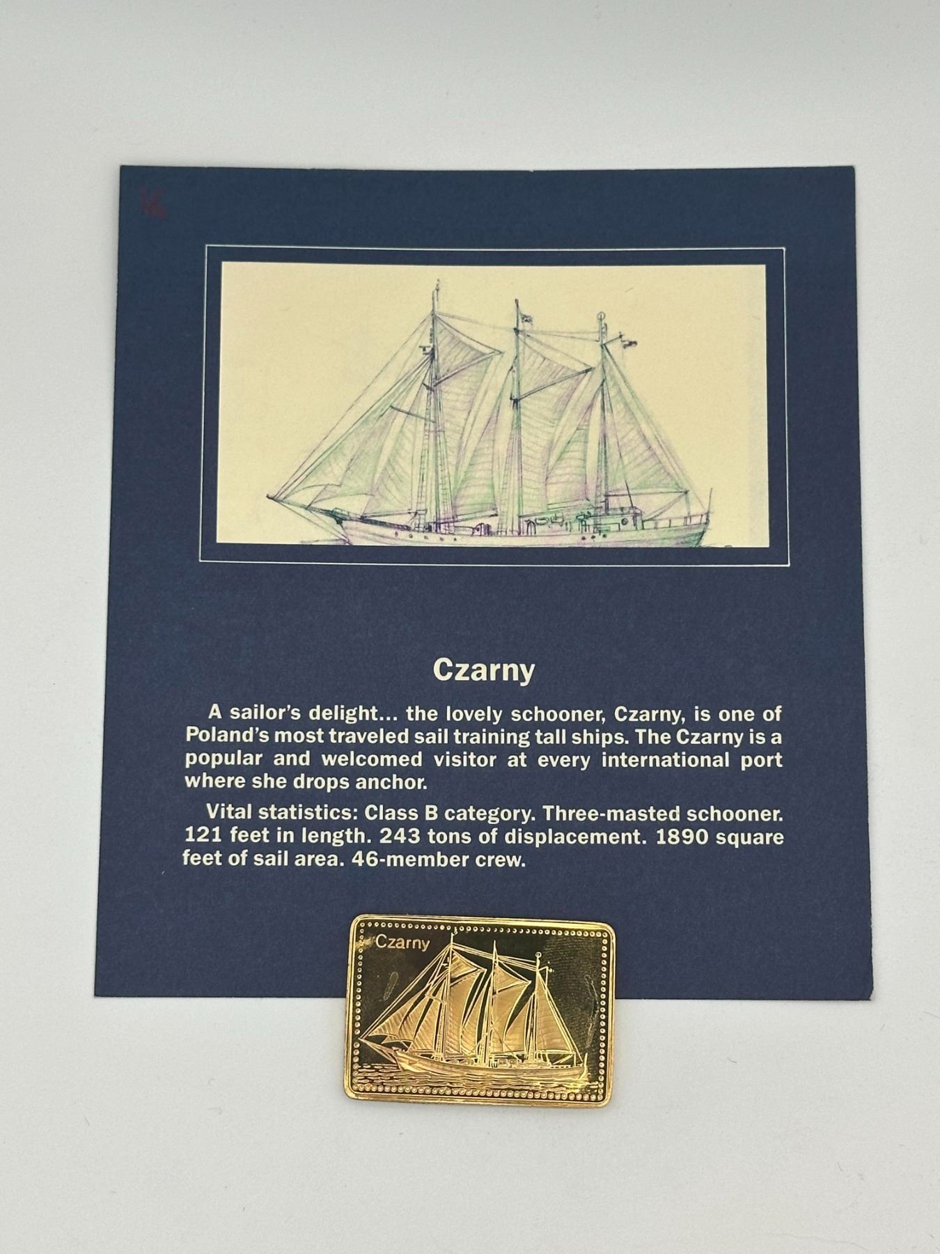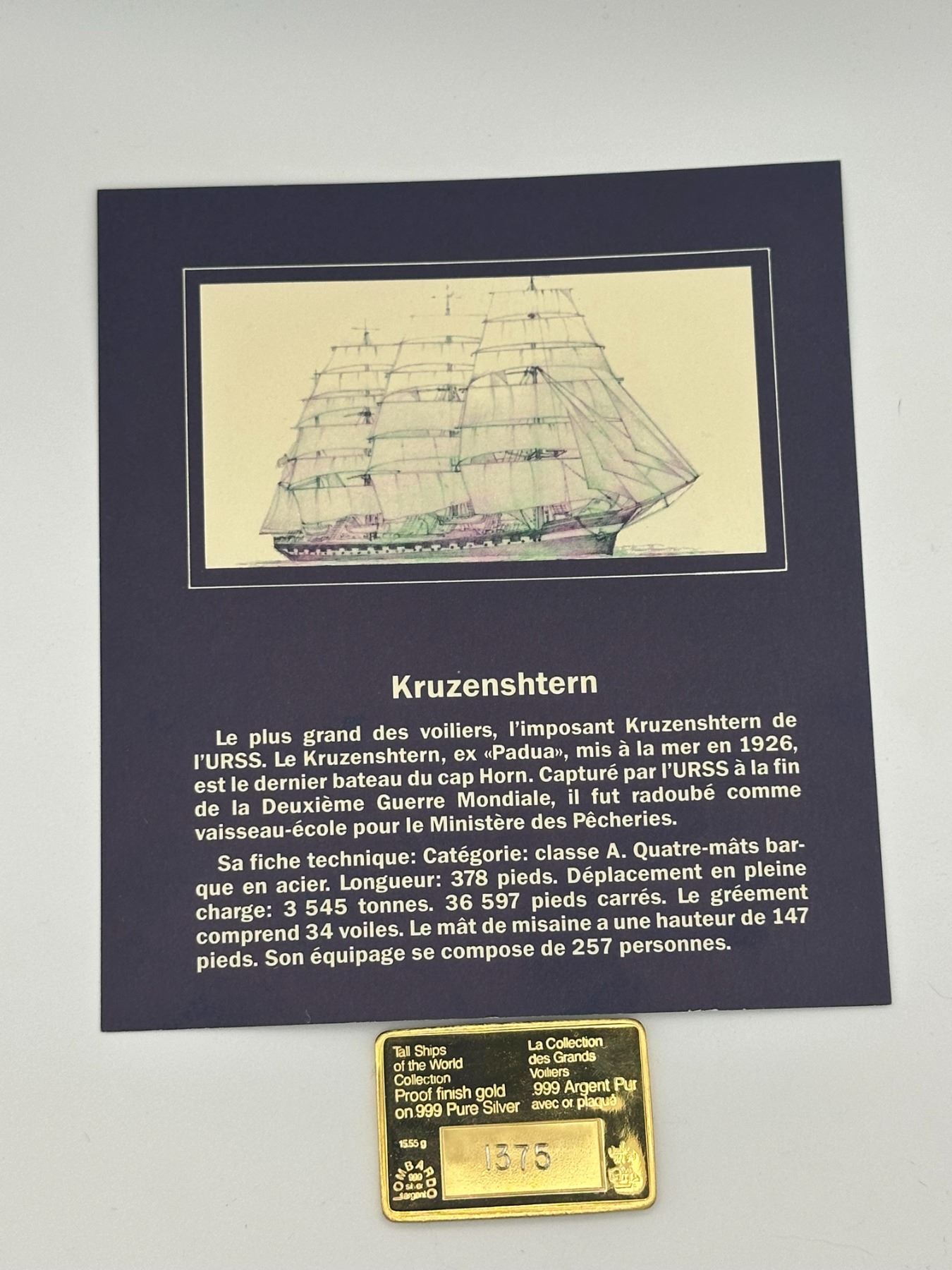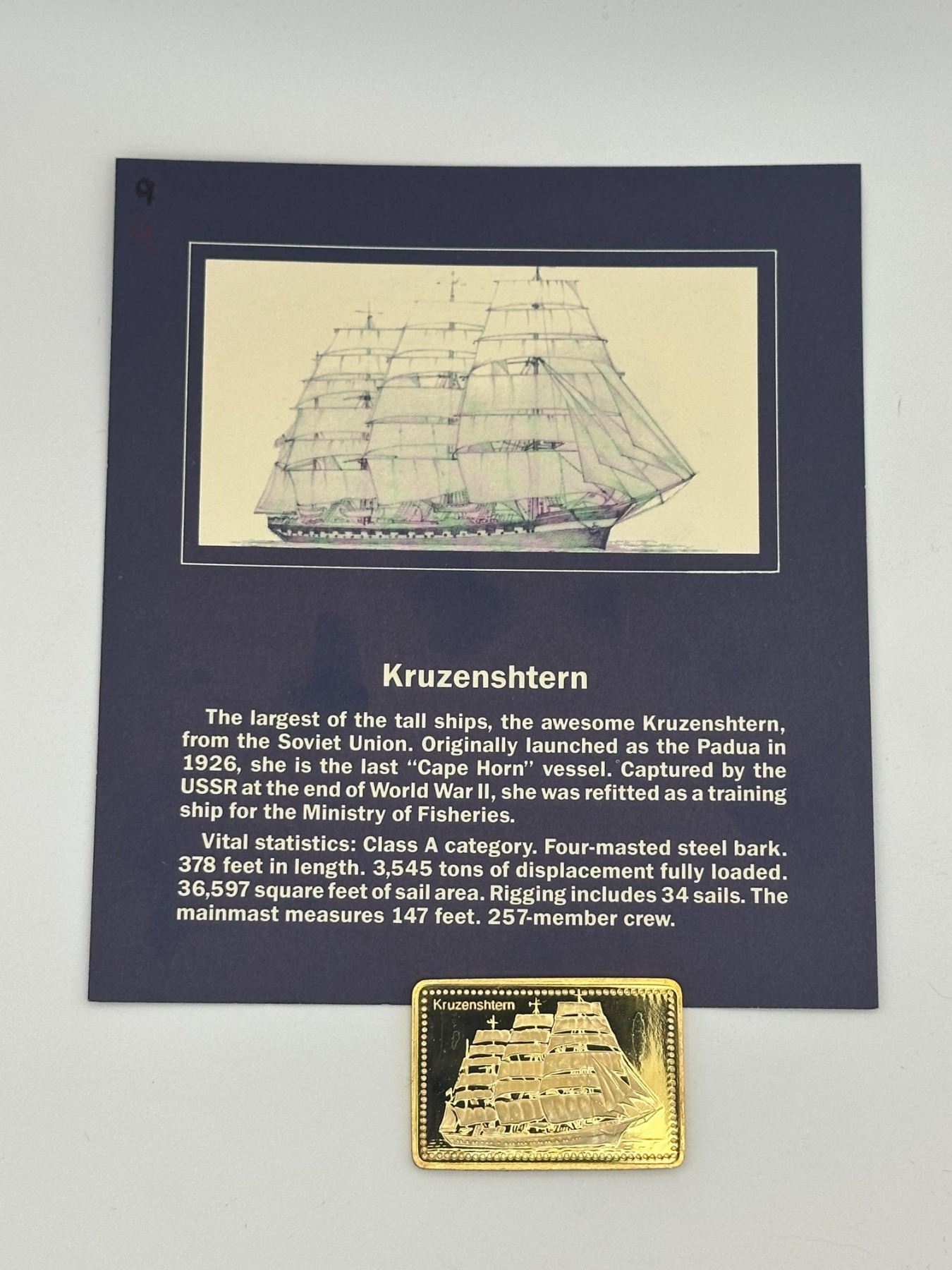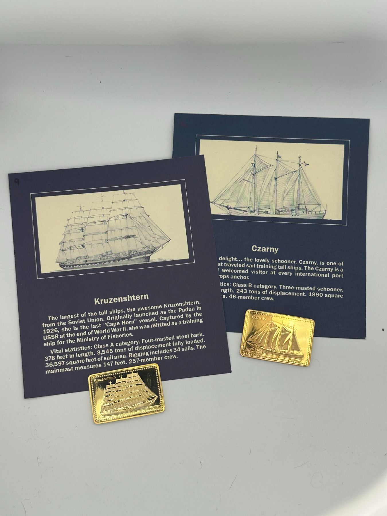 Set of two gold-plated .999 silver proof bars from the Tall Ships of the World collection featuring Kruzenshtern and Czarny. Each bar depicts detailed sailing ship designs and includes original display cards with historical descriptions.