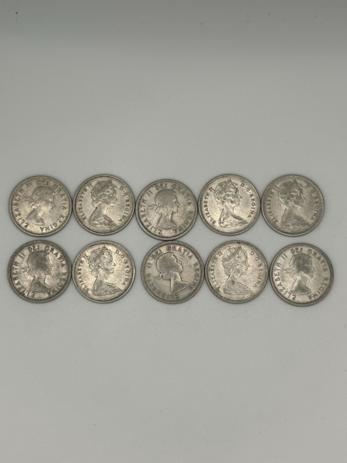 Lot of 10 Canadian 25 cent coins, caribou reverse, mixed dates (1960s), circulated condition.
