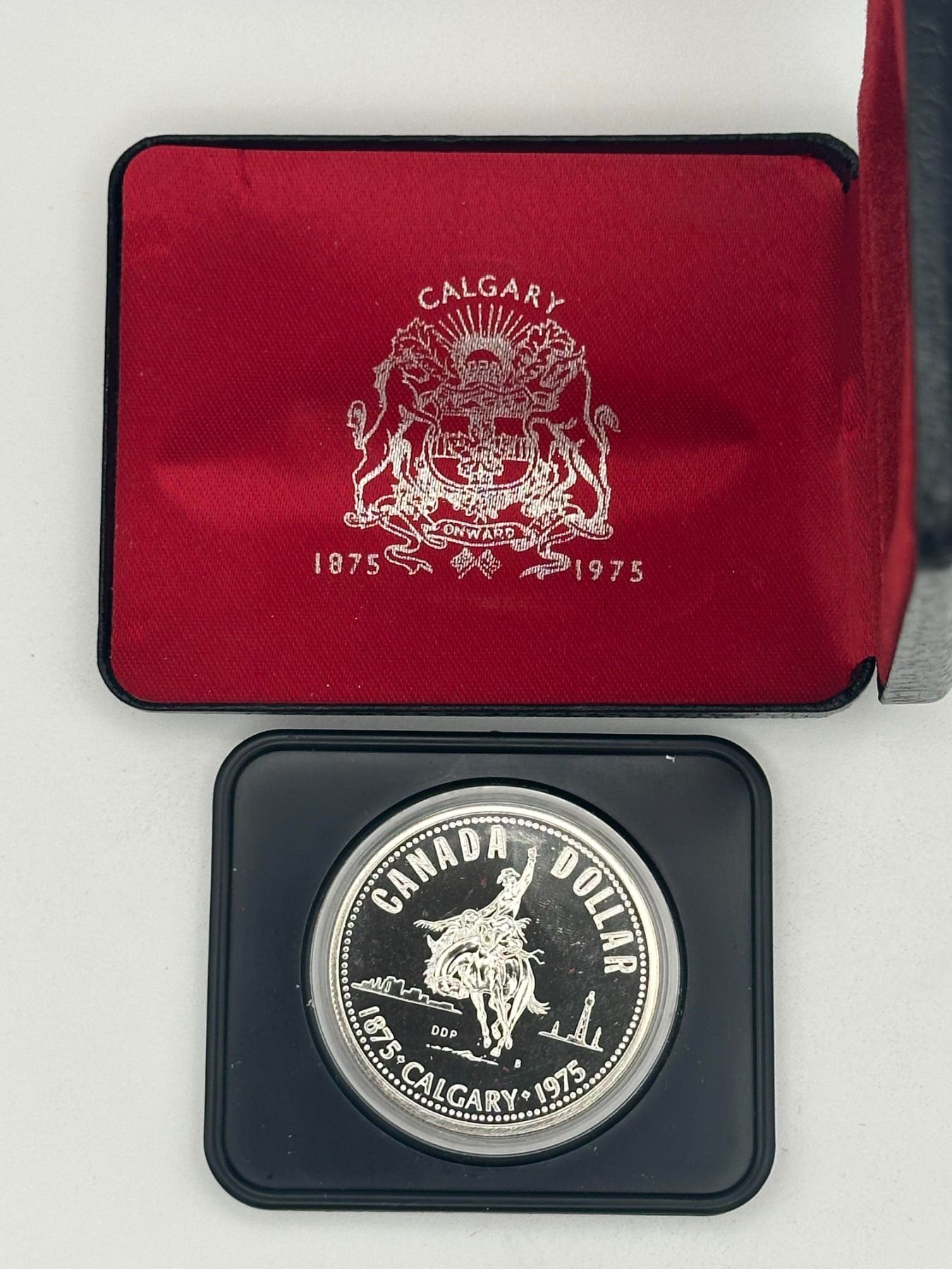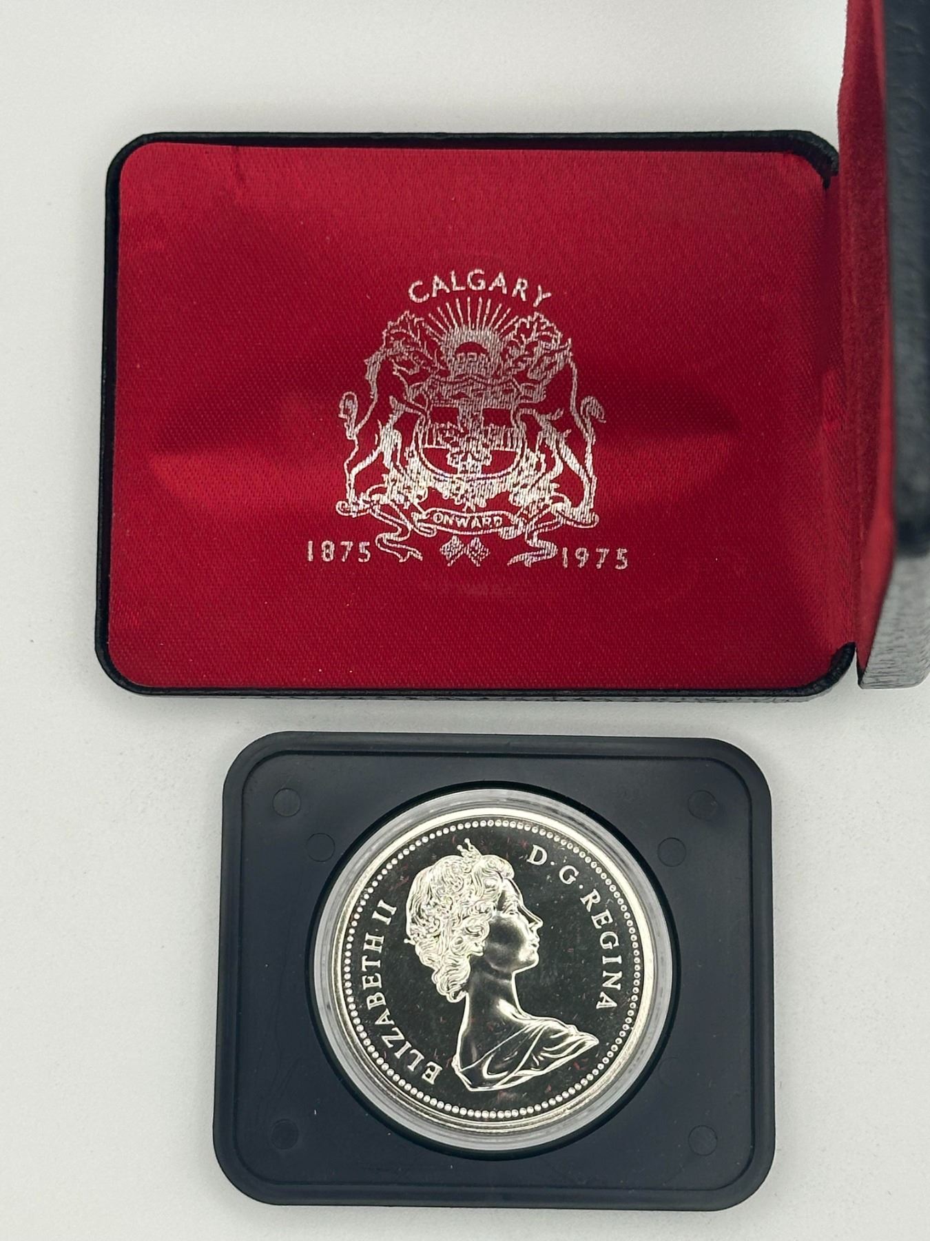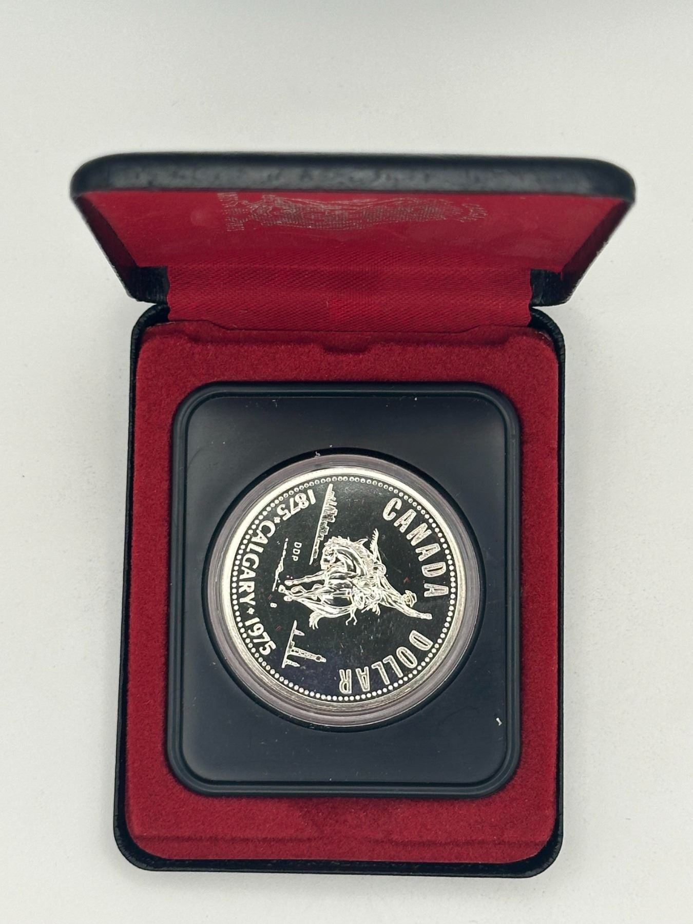 1975 Canada silver dollar commemorating Calgary centennial (1875–1975), proof finish, includes case.