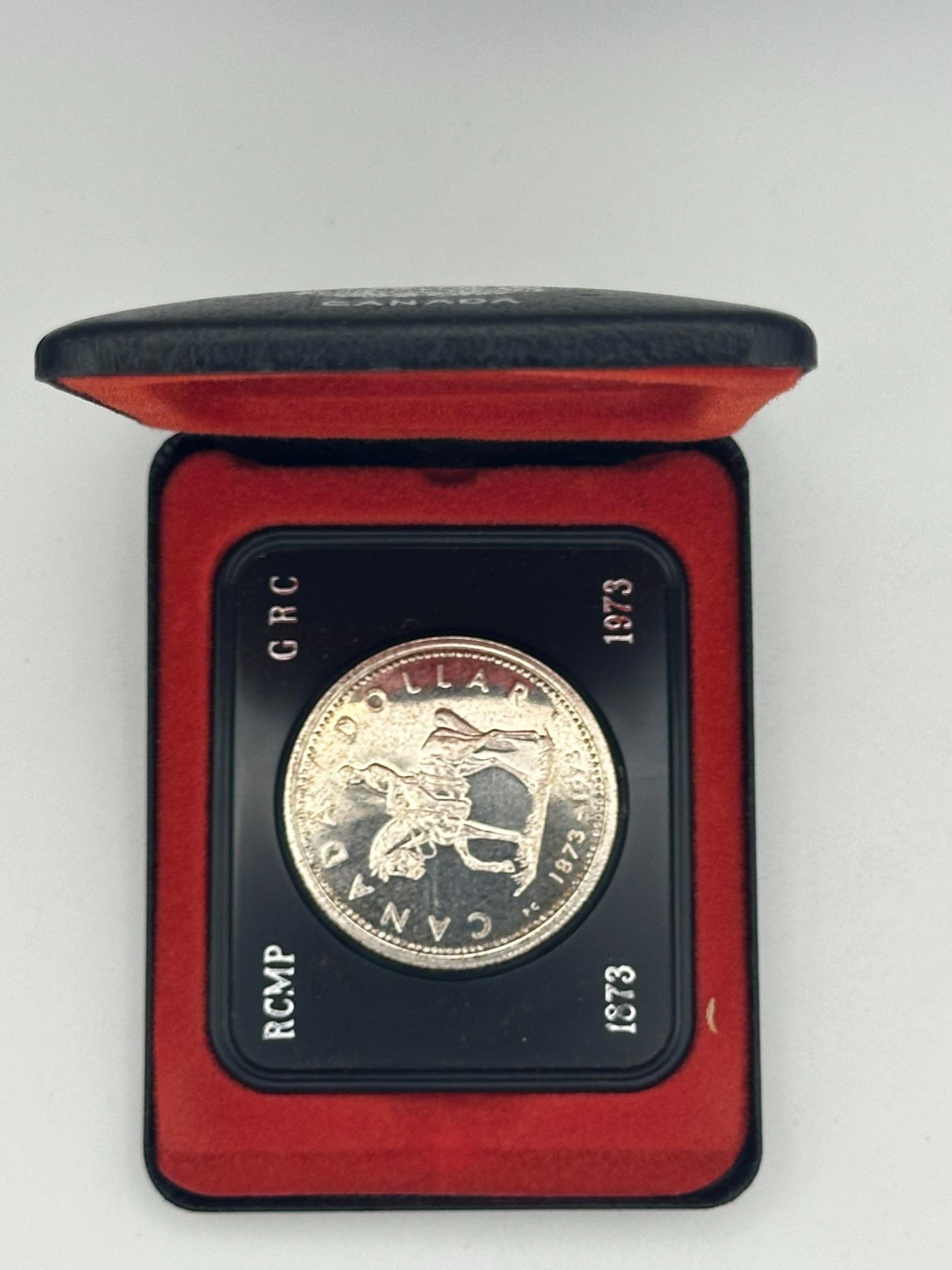 1973 Canada silver dollar commemorating RCMP centennial (1873–1973), proof finish, includes case.