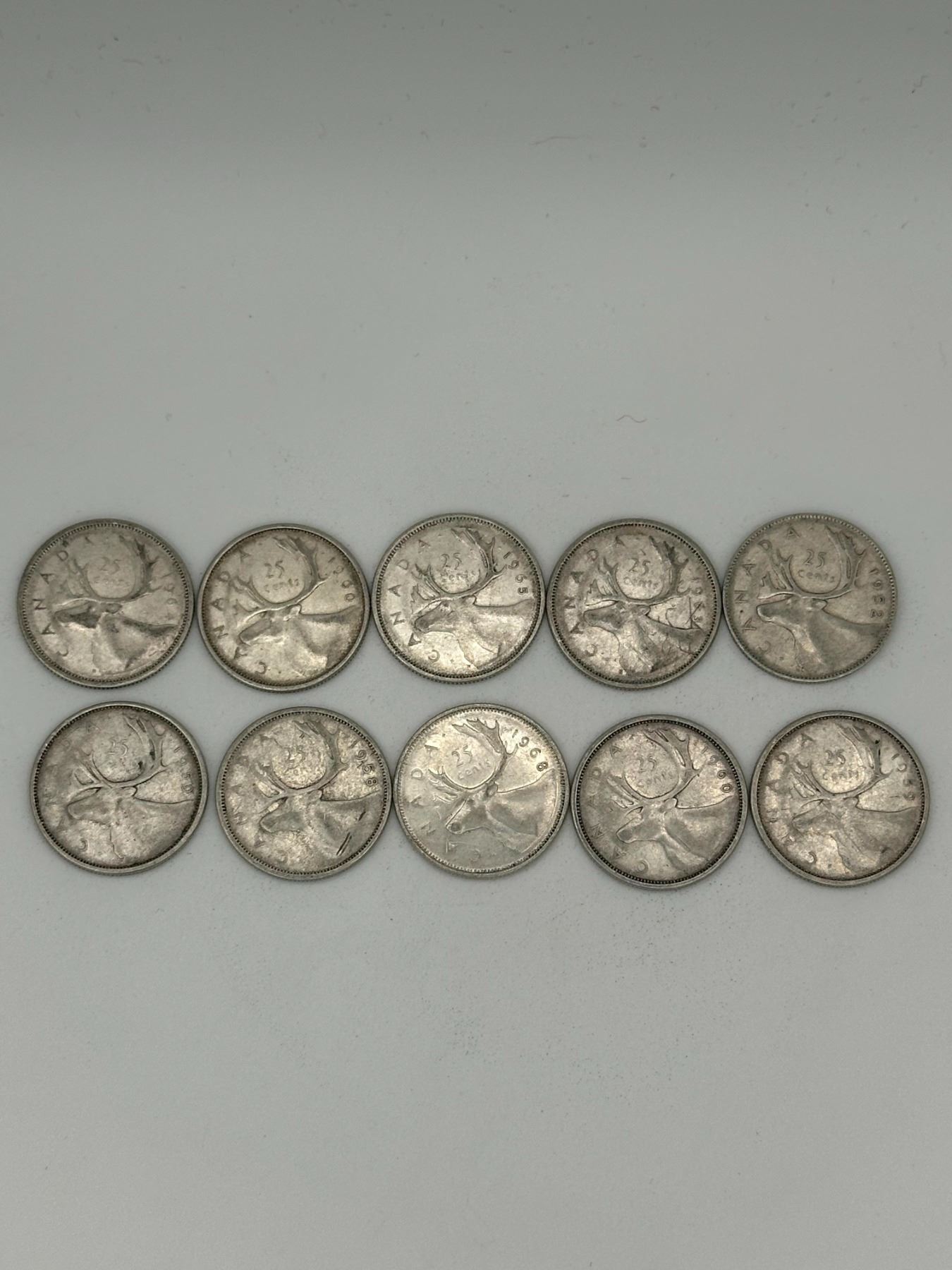 Lot of ten Canadian 25-cent coins including Elizabeth II and at least one George VI issue, caribou reverse, circulated condition with moderate wear.